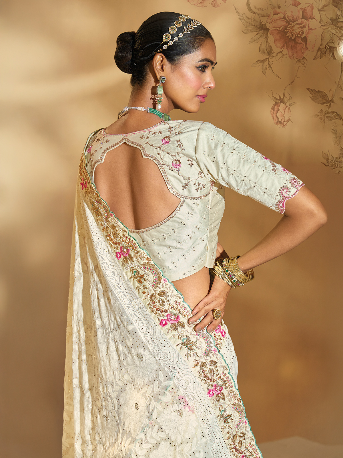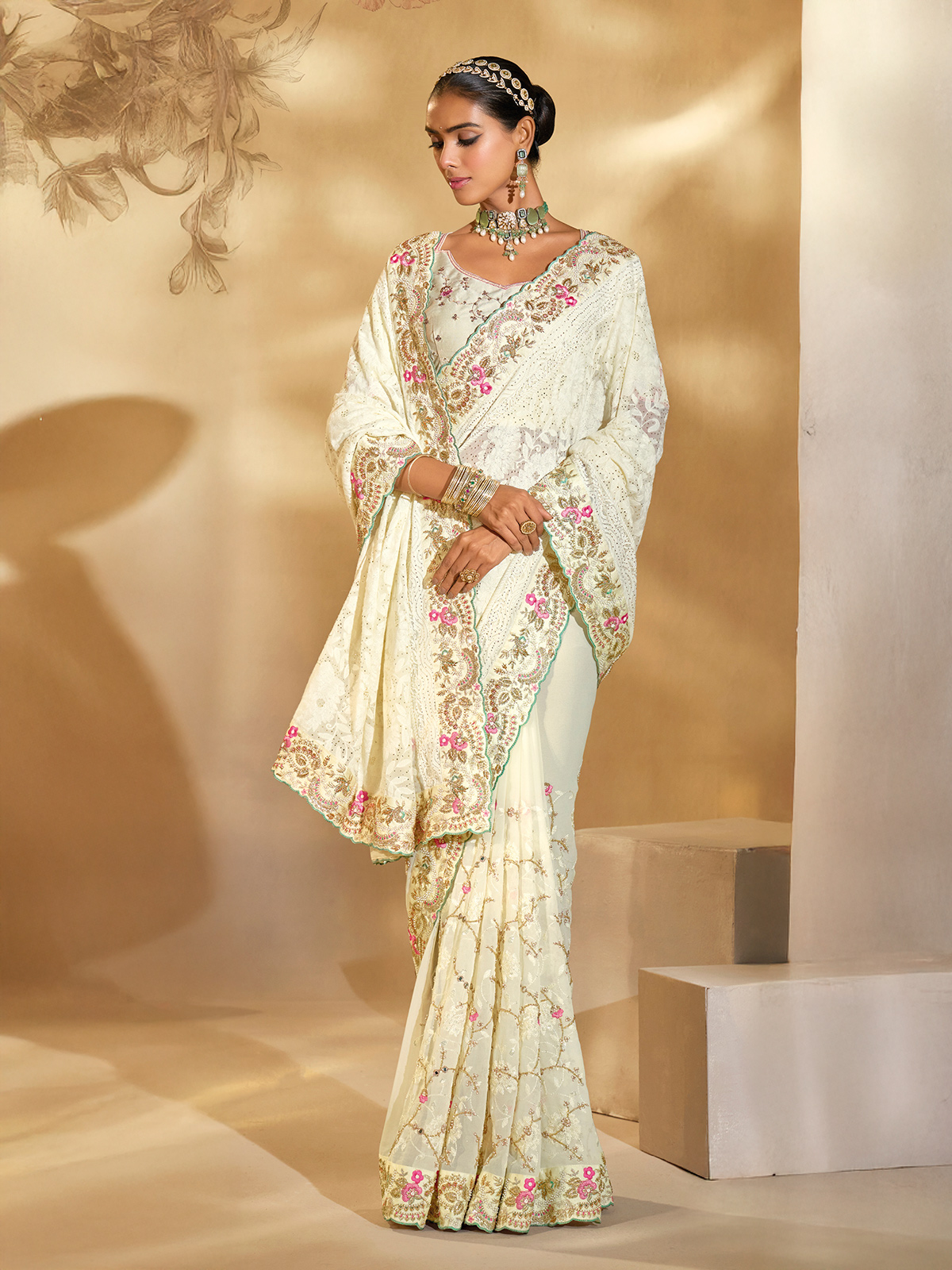 Cream Georgette Saree Enhanced With Delicate Thread Charm