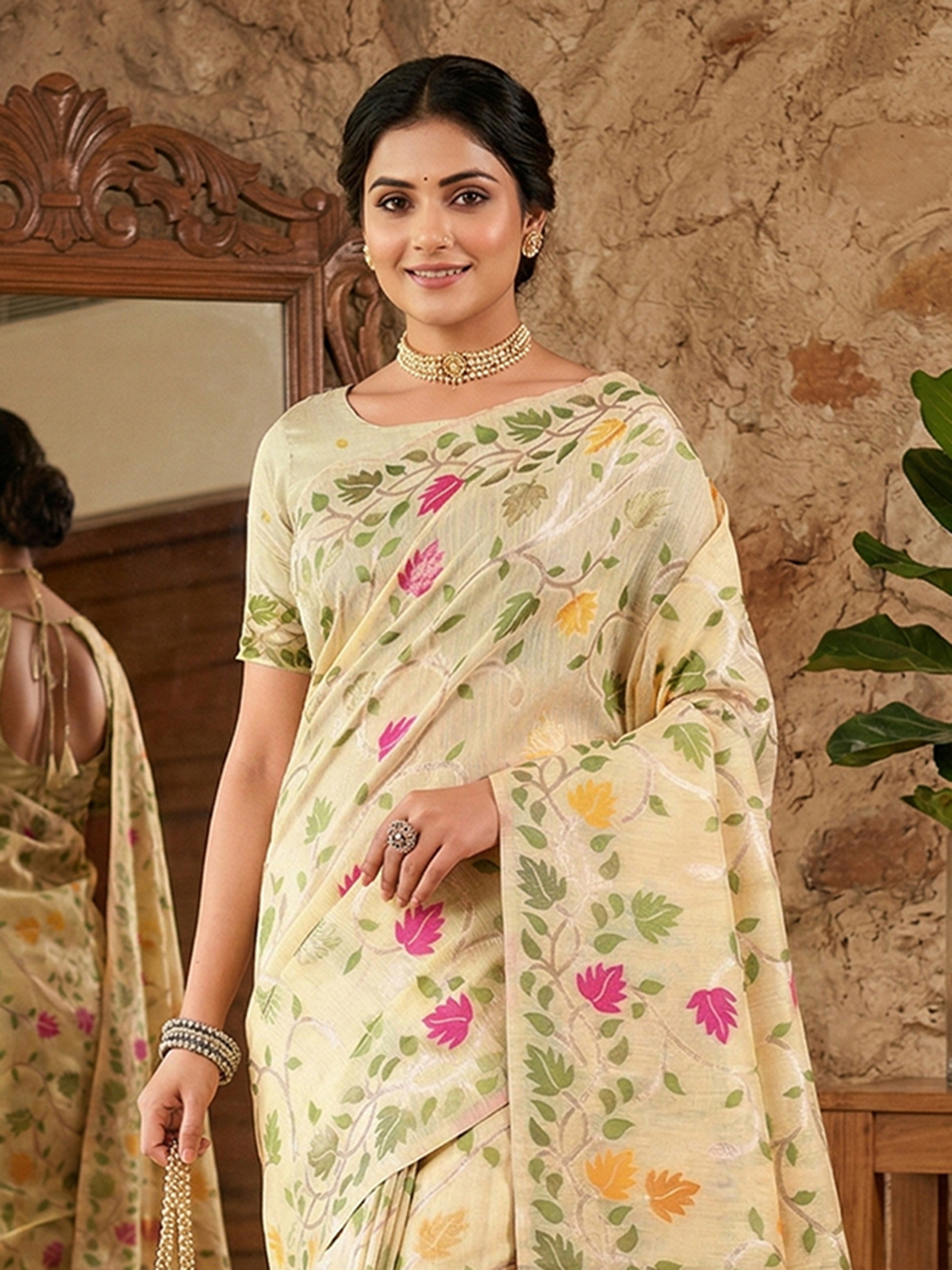 This graceful cream-toned cotton linen silk saree features a delicate all-over floral pattern highlighted with vibrant pink, yellow, and green leaf motifs. The elegant drape is enhanced with a patterned border and a tasseled pallu, adding charm and movement. Paired with an unstitched blouse piece, this ensemble creates a fresh and sophisticated look for daytime festivities and social gatherings.