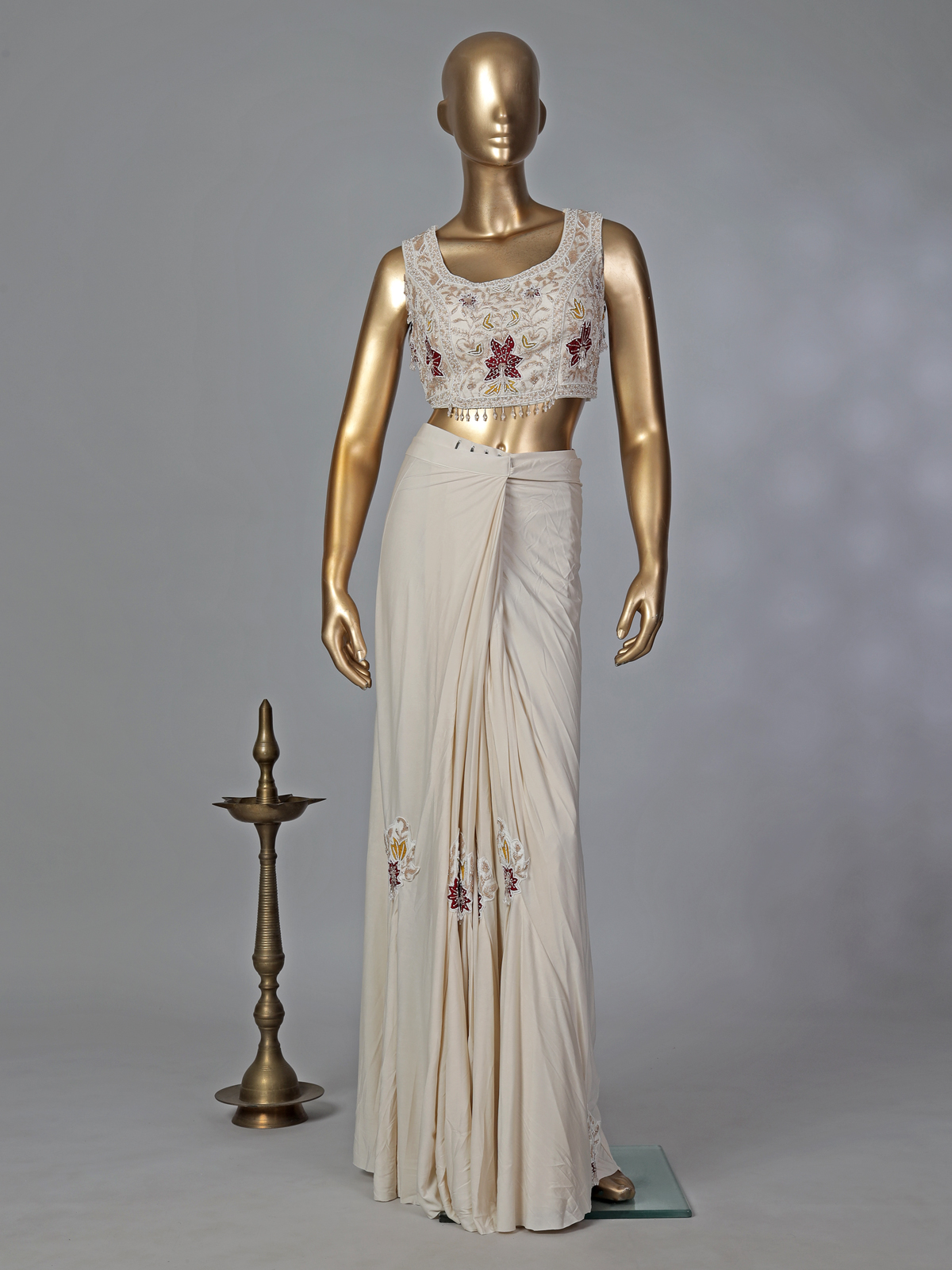 Gracefully crafted to highlight modern feminine charm, this elegant cream lycra ready-to-wear saree blends subtle sophistication with festive beauty. The sleeveless round-neck blouse features intricate cutdana, thread, and bead work that adds delicate texture and sparkle. The stylish belt completes the look, making it perfect for weddings, receptions, and festive gatherings.