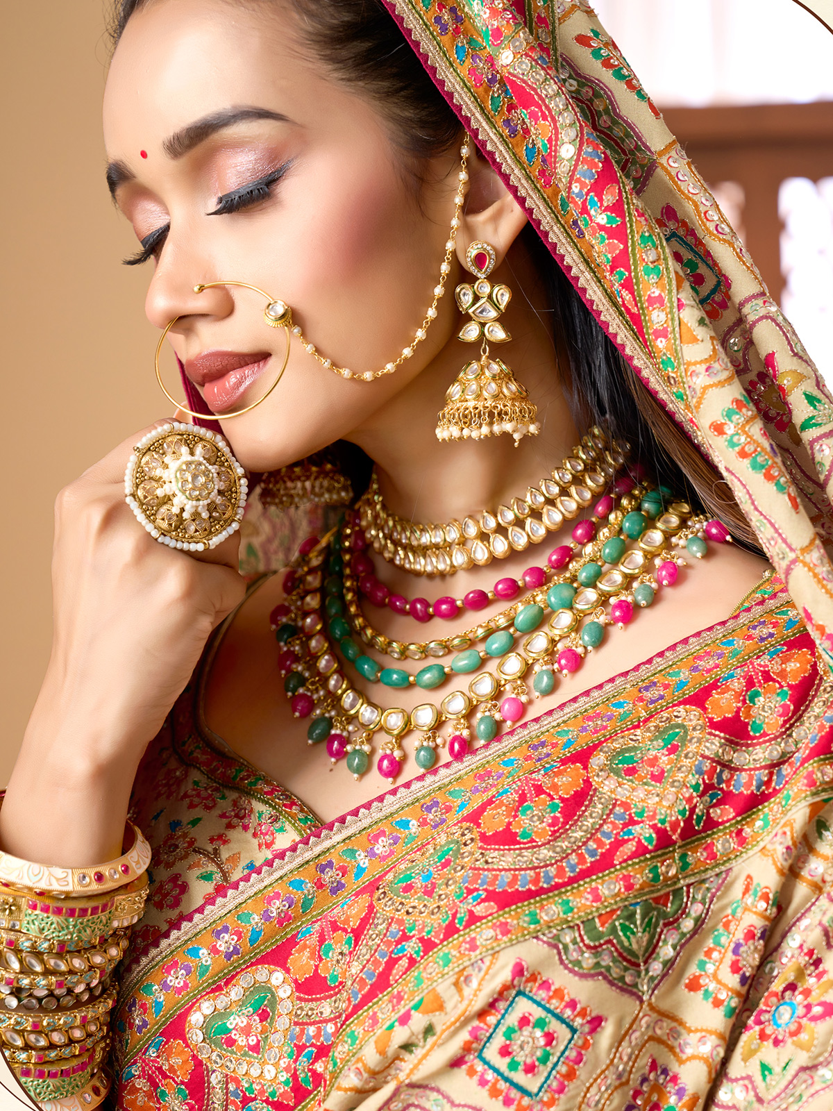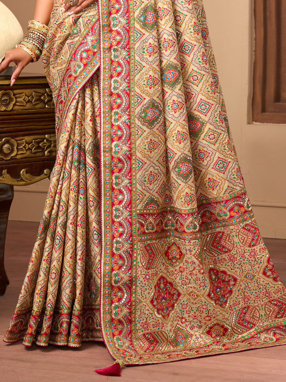Crafted in soothing cream printed satin silk saree is highlighted with delicate resham, gota, and sequin embellishments. The soft fabric ensures a refined drape, paired with a ready made blouse for convenience. Ideal for weddings, festive events and elegant sangeet celebrations.