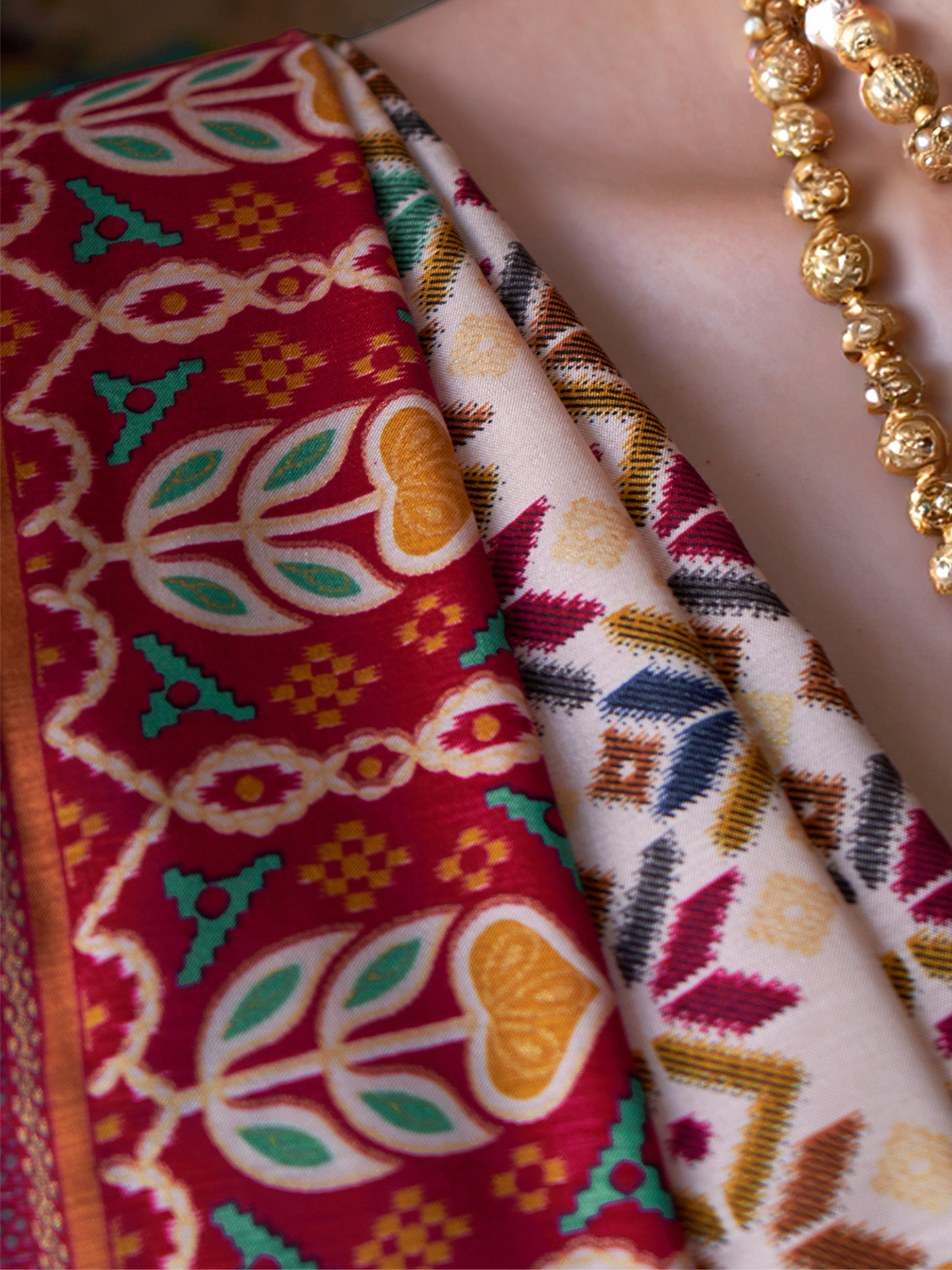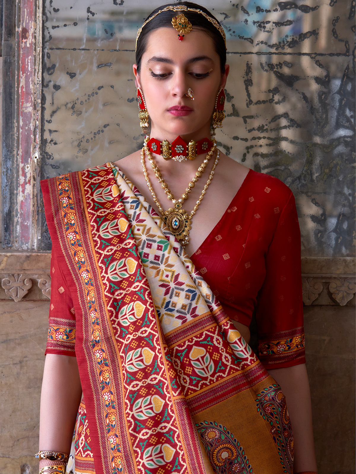 This cream and red silk saree dazzles with its refined glory finish print, offering a blend of elegance and festivity. Lightweight and graceful, it drapes beautifully for weddings, receptions, sangeet nights, and festive gatherings. Comes with an unstitched blouse to style your look your way.