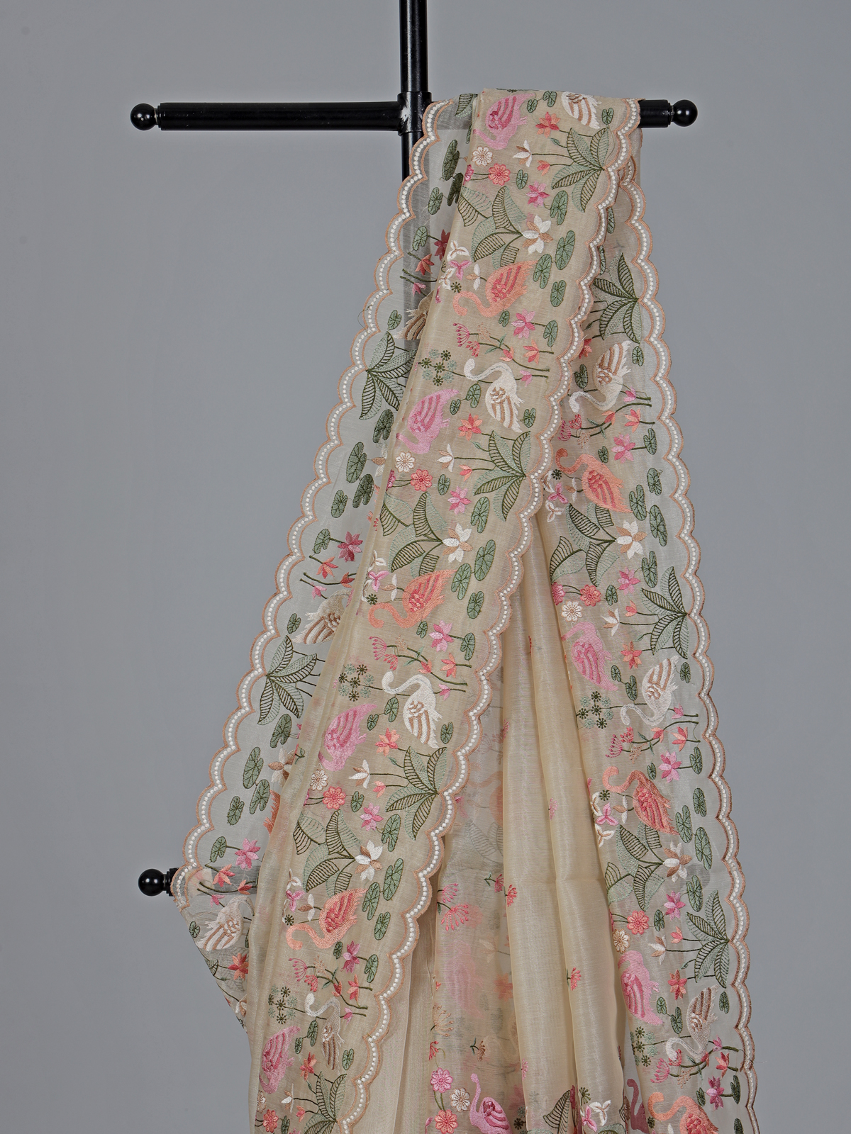 This cream semi organza saree embodies timeless beauty with its finely crafted embroidery work. The soft tone and sheer elegance create a graceful festive aura. Perfect for weddings and special occasions. Paired with an unstitched blouse piece. It offers a refined canvas to express your personal style.