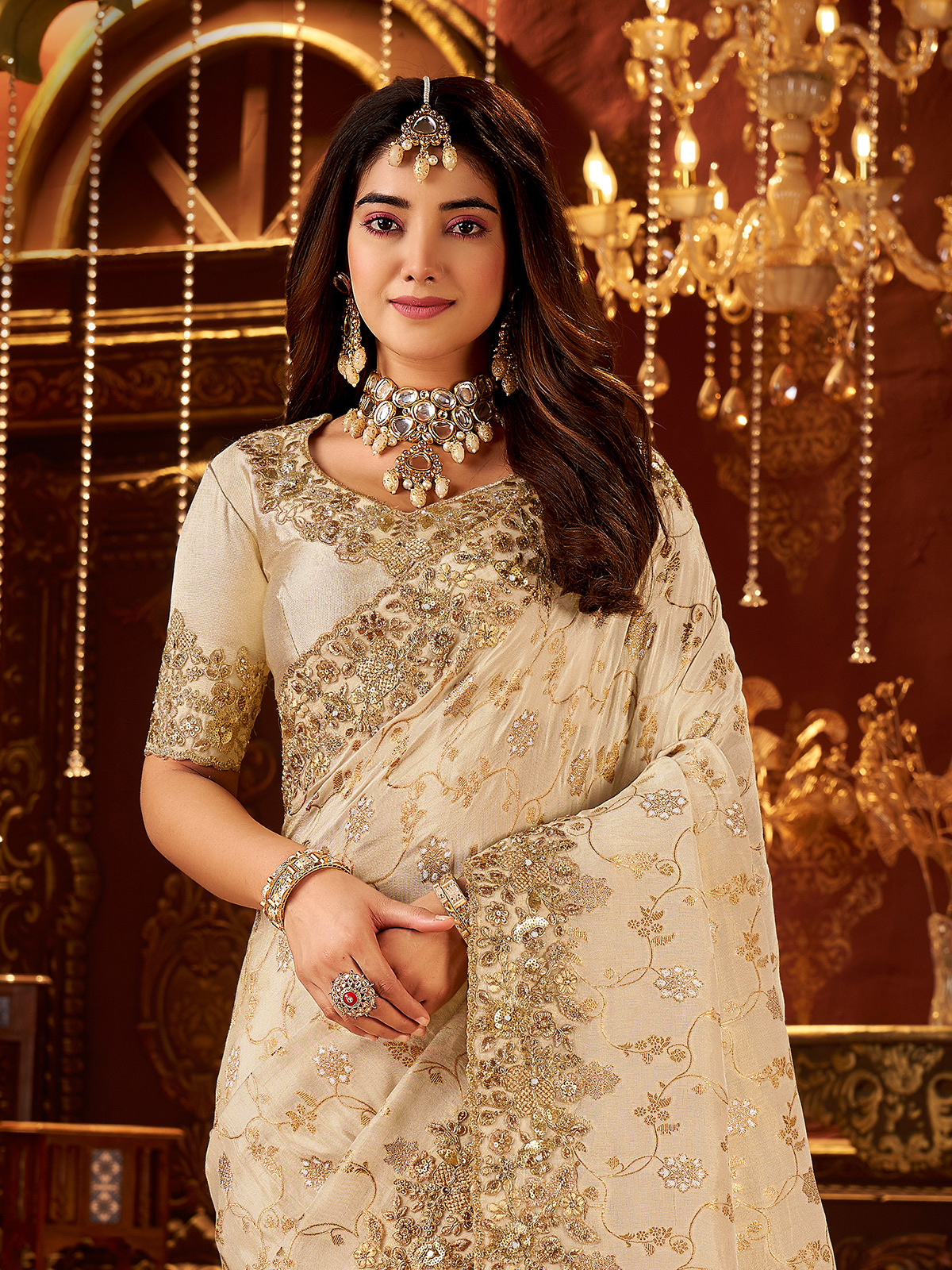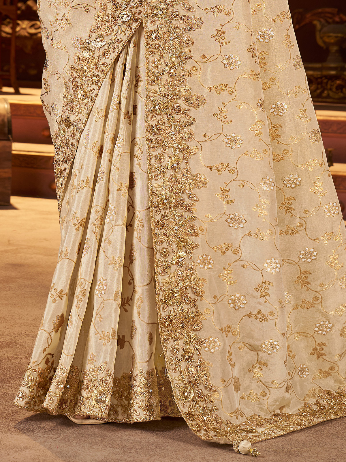 Designed in shaded cream soft silk, this saree showcases elegant embroidery with sequins, mirror work, stone, zardosi, and zari. Finished with an unstitched blouse piece, it is perfect for weddings, sangeet, receptions, and festive wear.