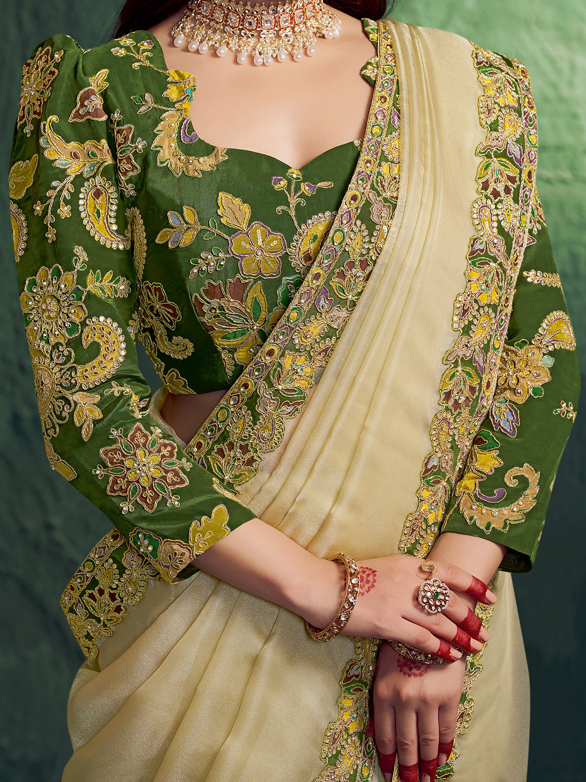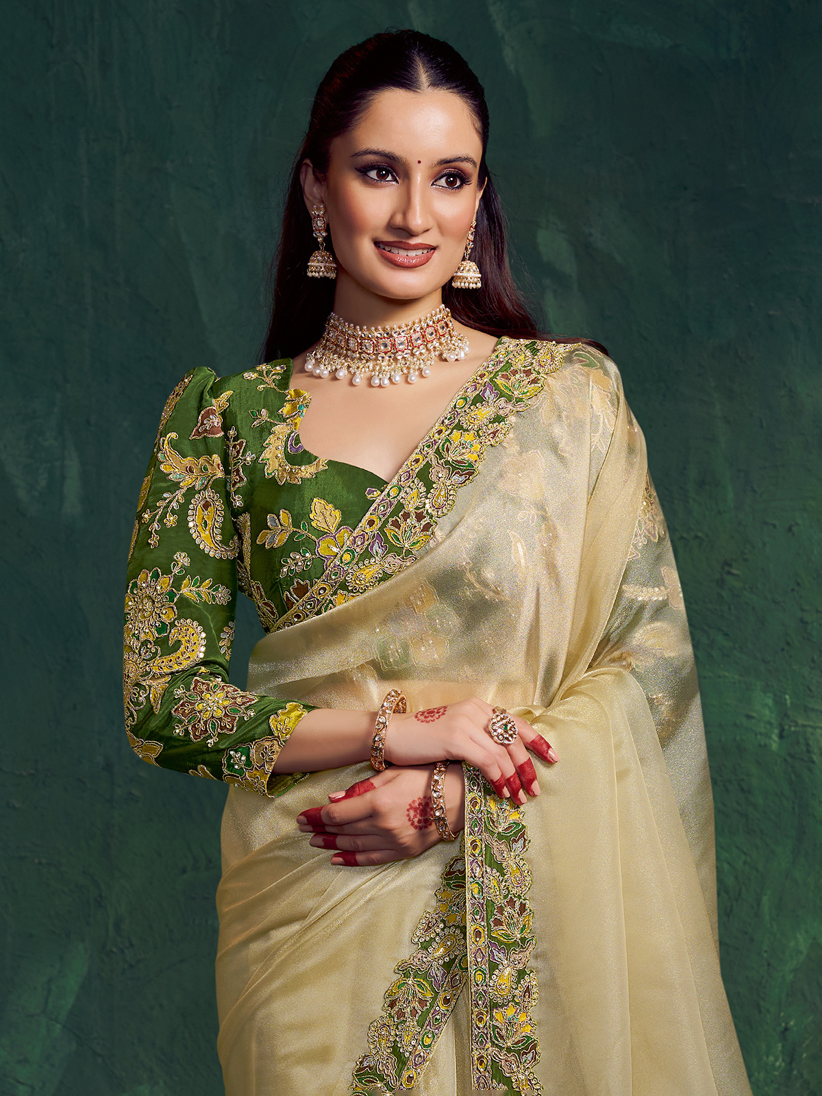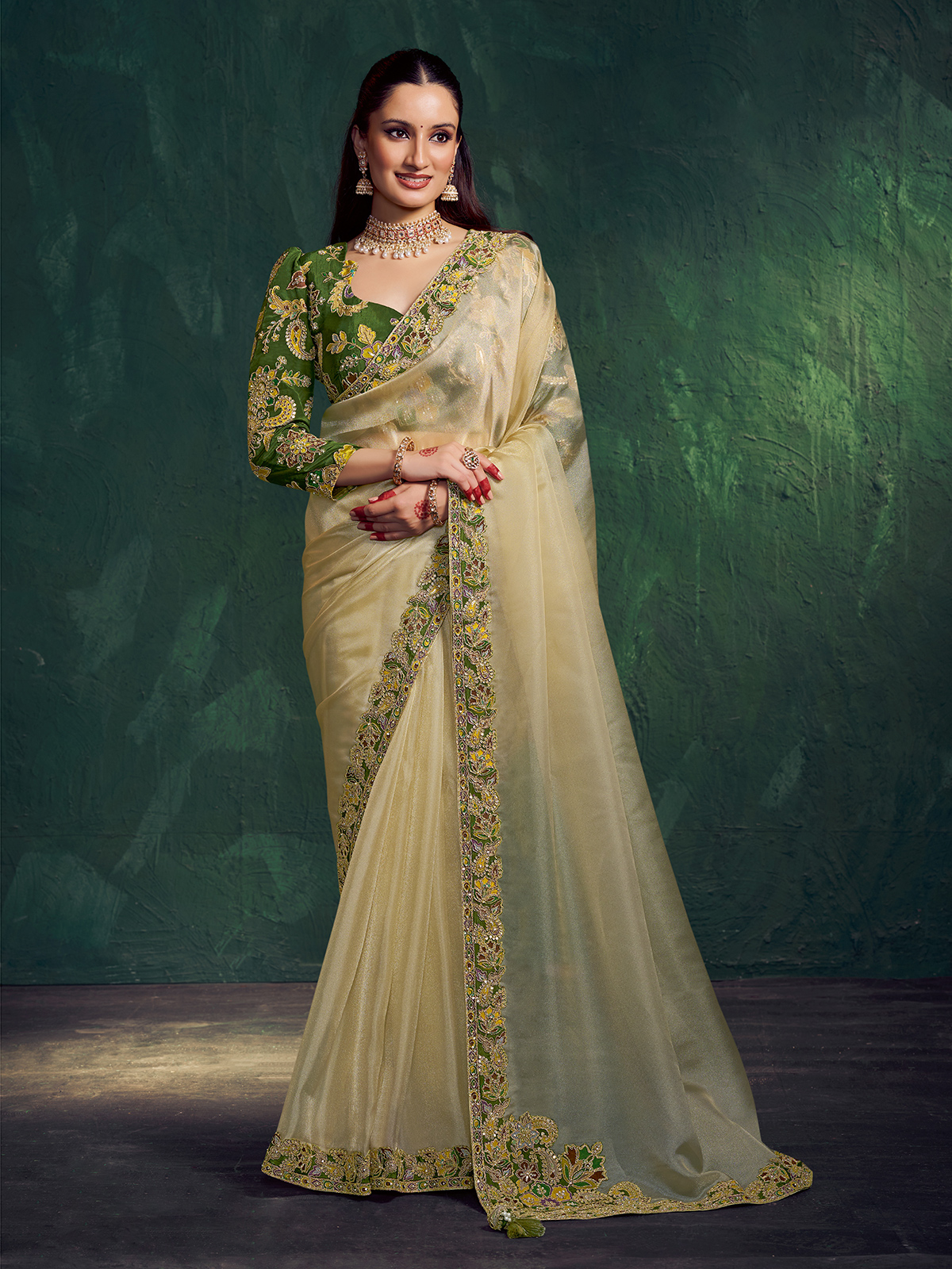 Crafted in cream shimmer tissue silk, this saree is beautifully enhanced with embroidery, sequins, diamond and pearl work. The luminous fabric adds a sophisticated glow. Paired with a contrast unstitched blouse piece, it is ideal for weddings, receptions, festive gatherings and sangeet celebrations.