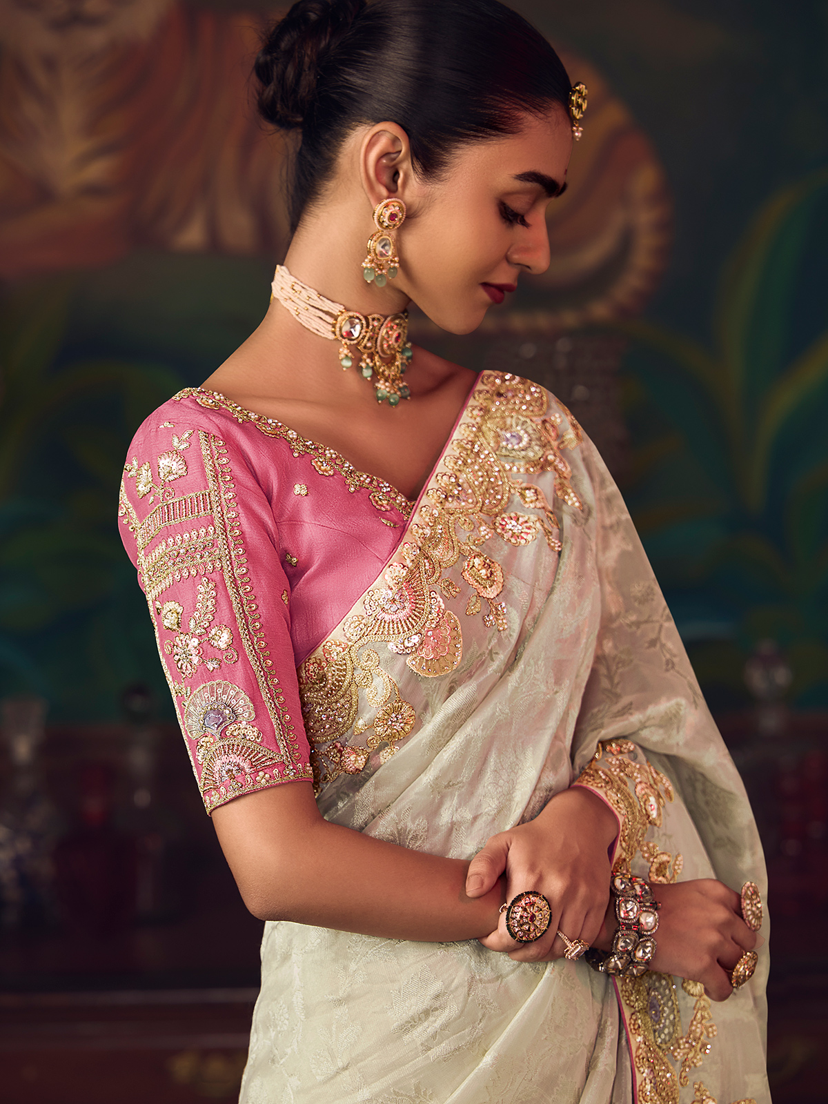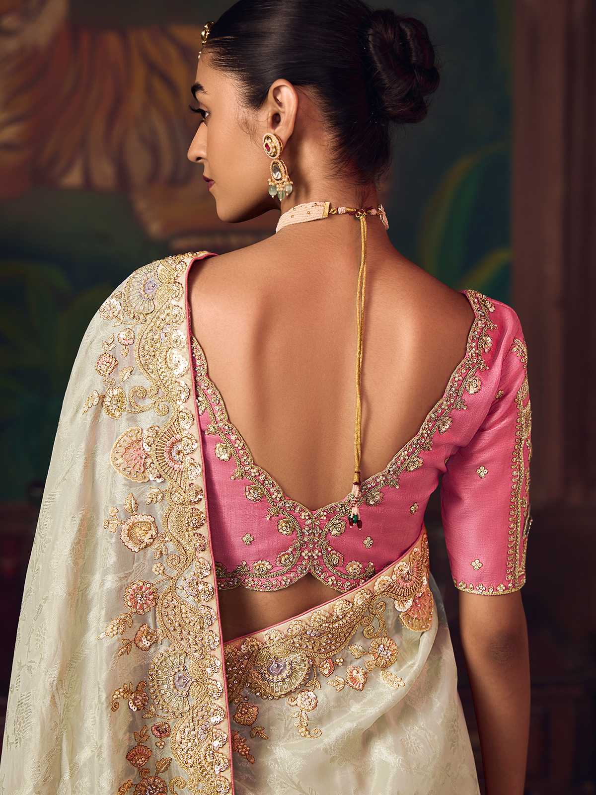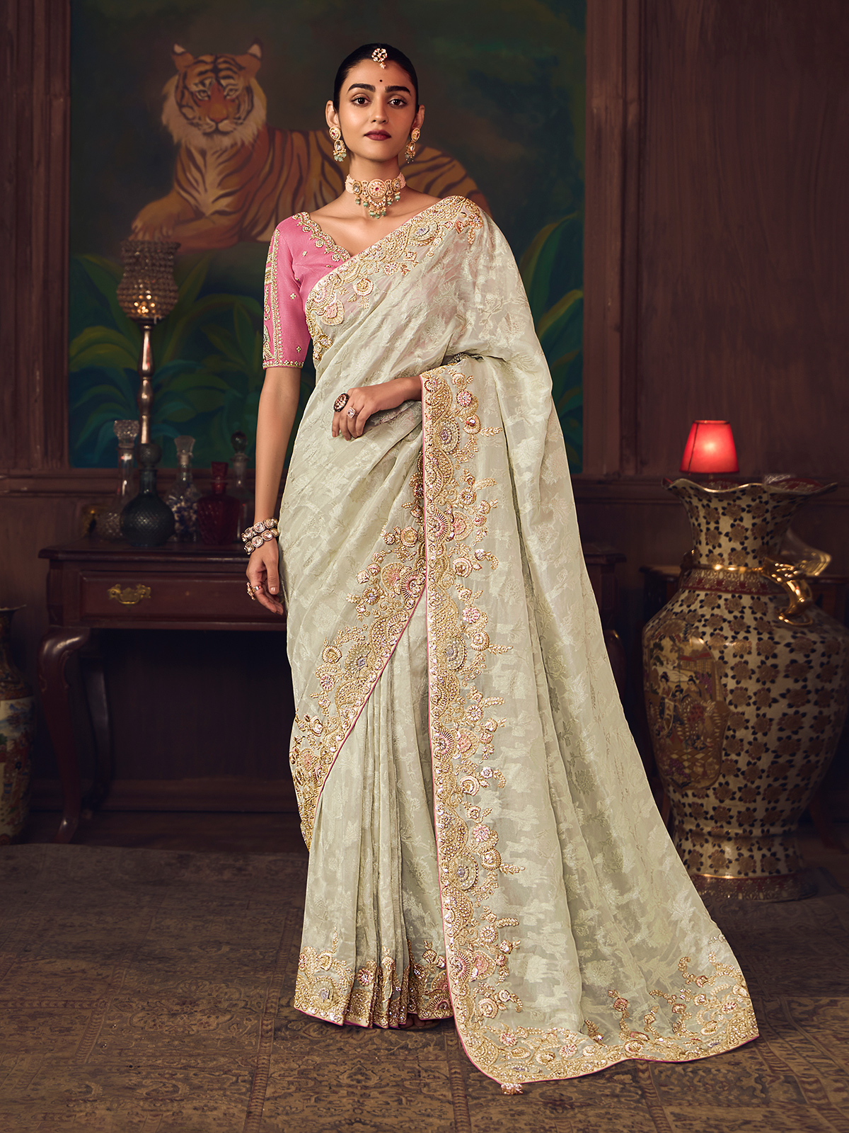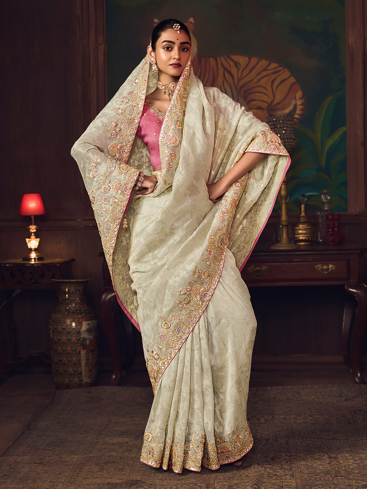 Crafted in timeless cream silk, this saree is adorned with intricate embroidery featuring sequins, pearls, diamond highlights and zari work. Comes with a contrast unstitched blouse piece, offering classic elegance for weddings, festive occasions, and sophisticated reception celebrations.