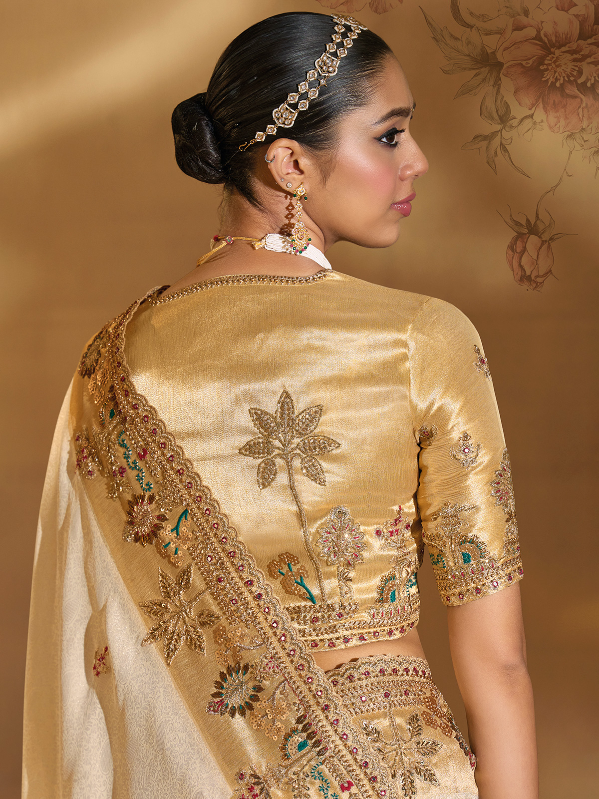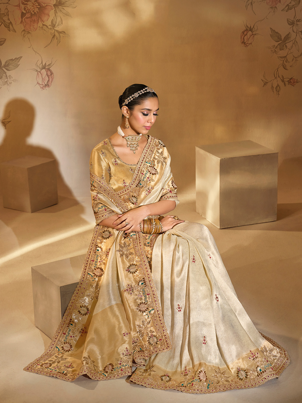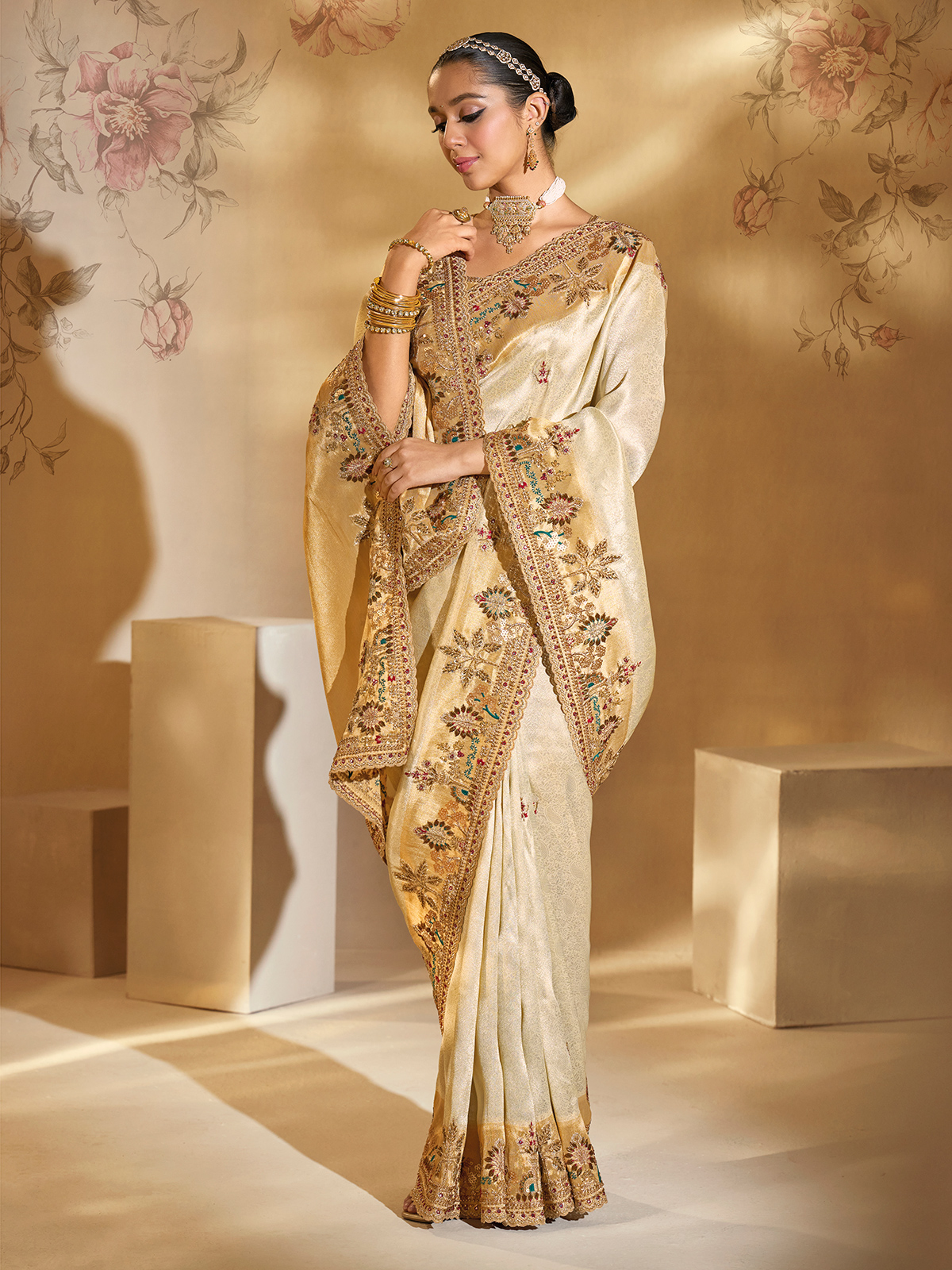 Cream Silk Festive Saree Highlighted With Resham Artistry