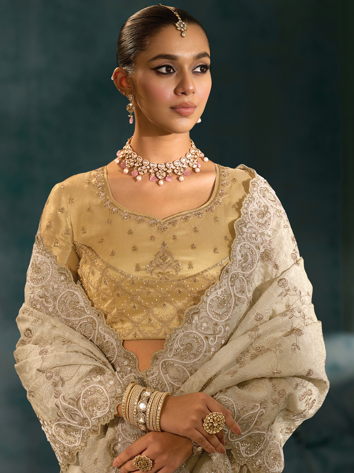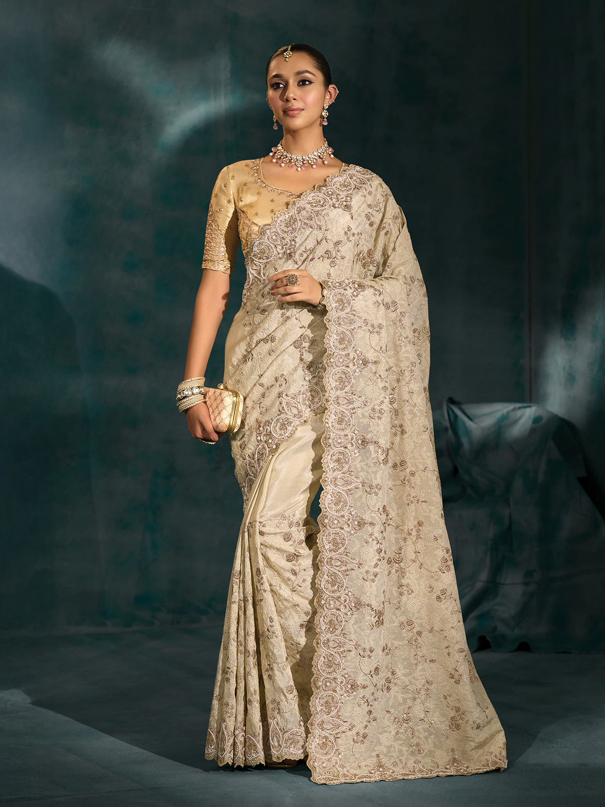 Soft cream silk saree flows gracefully, highlighted by resham, sequins, cutdana, and beads along the broad border for understated sparkle. Perfect for festive occasions, weddings, and receptions, it comes with an unstitched blouse piece, adding a personalized touch while enhancing the saree’s timeless elegance, delicate artistry, and sophisticated beauty.