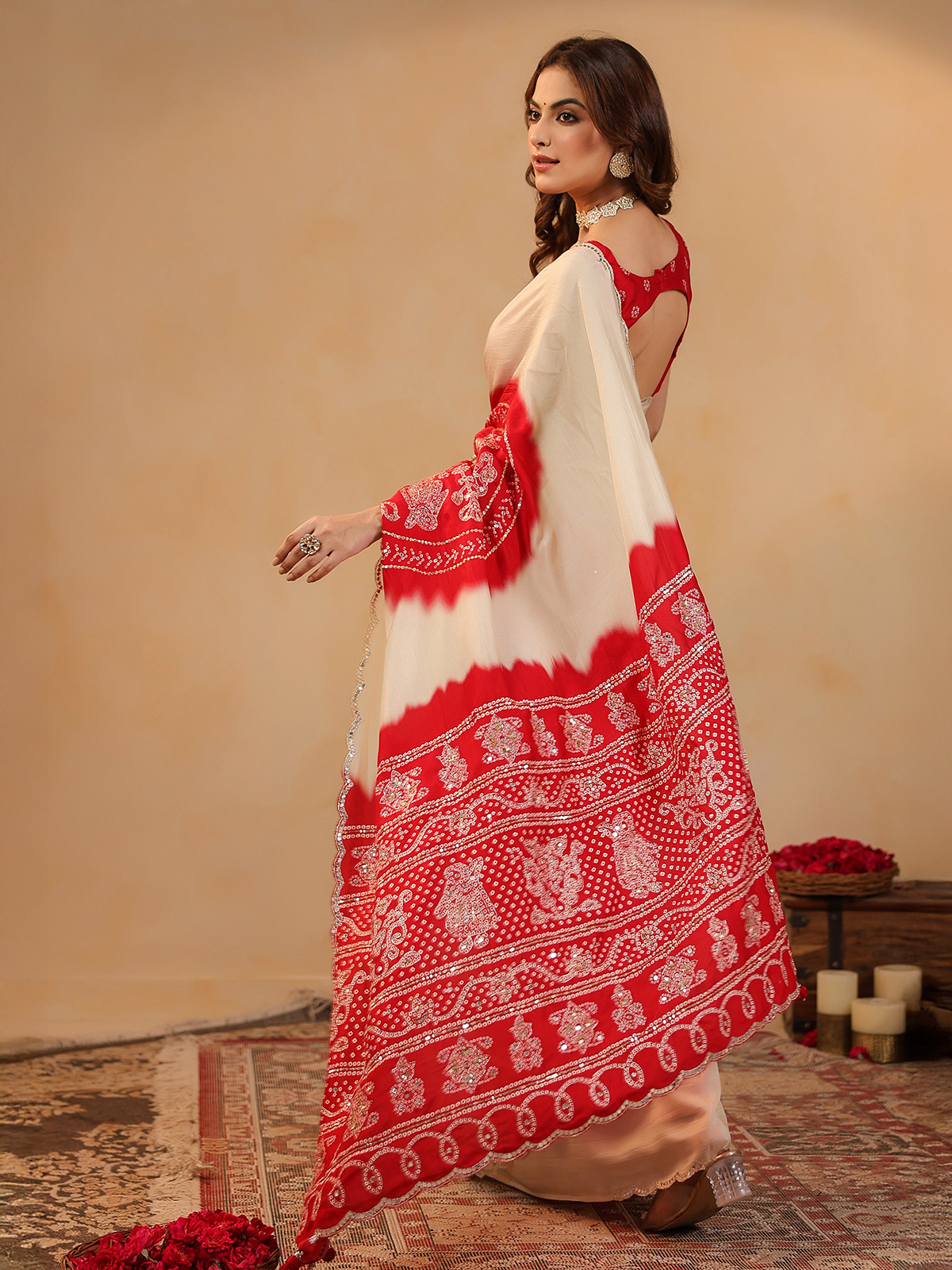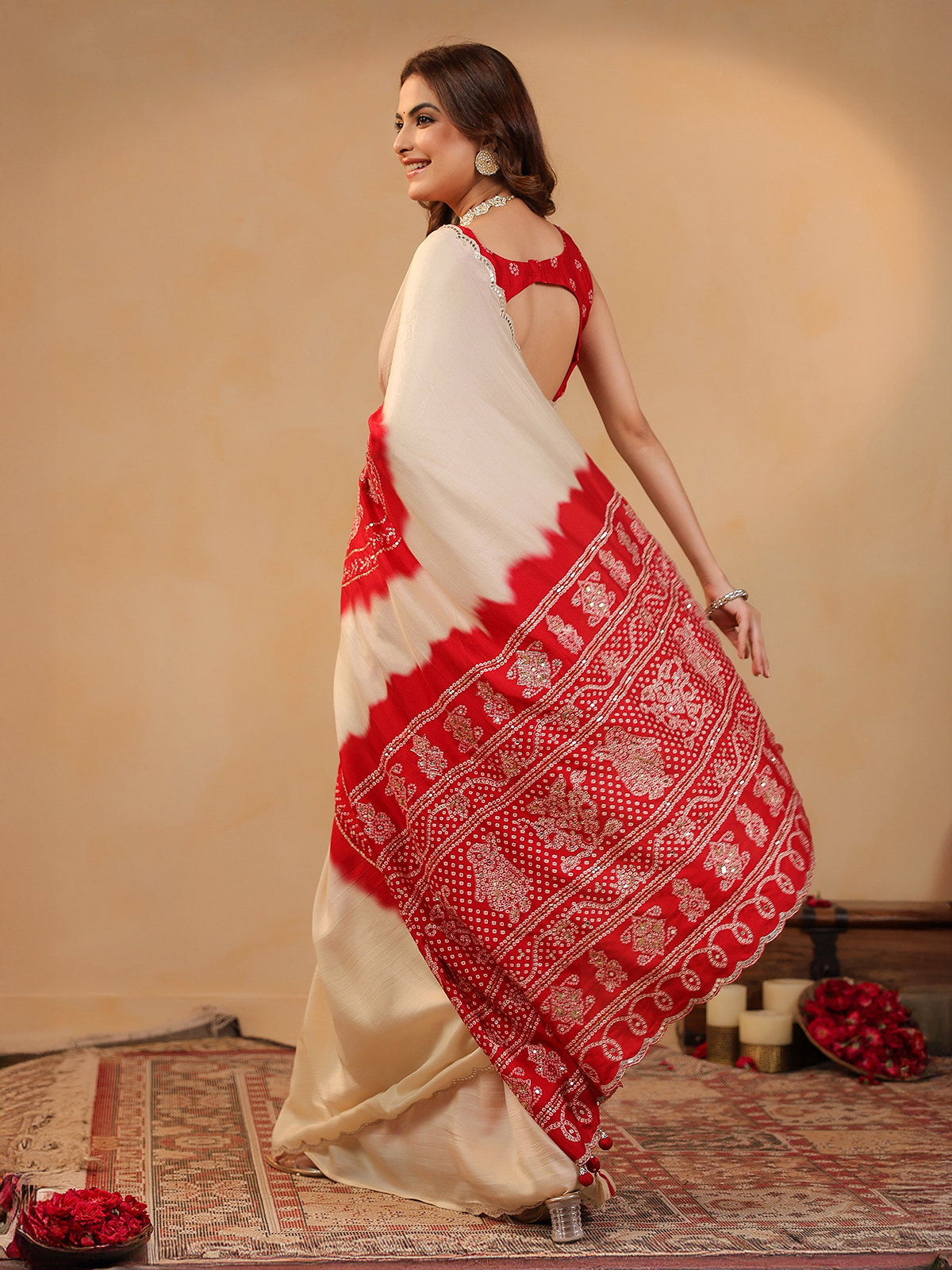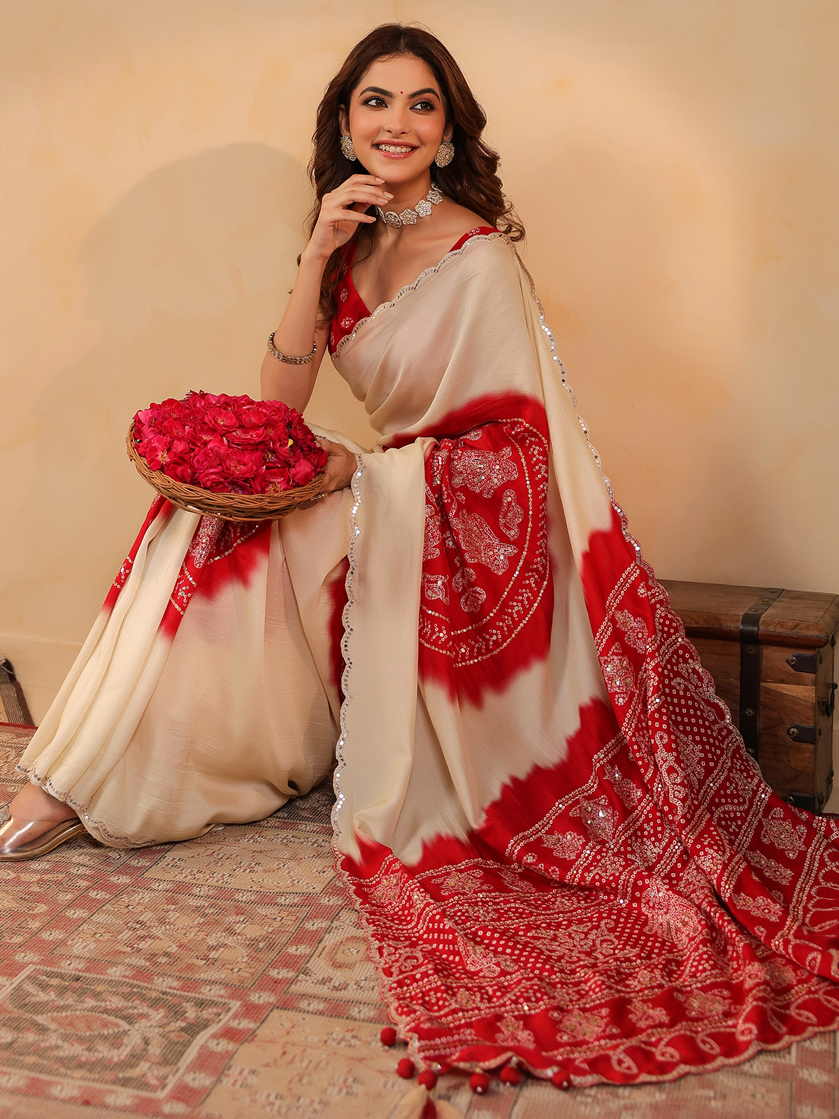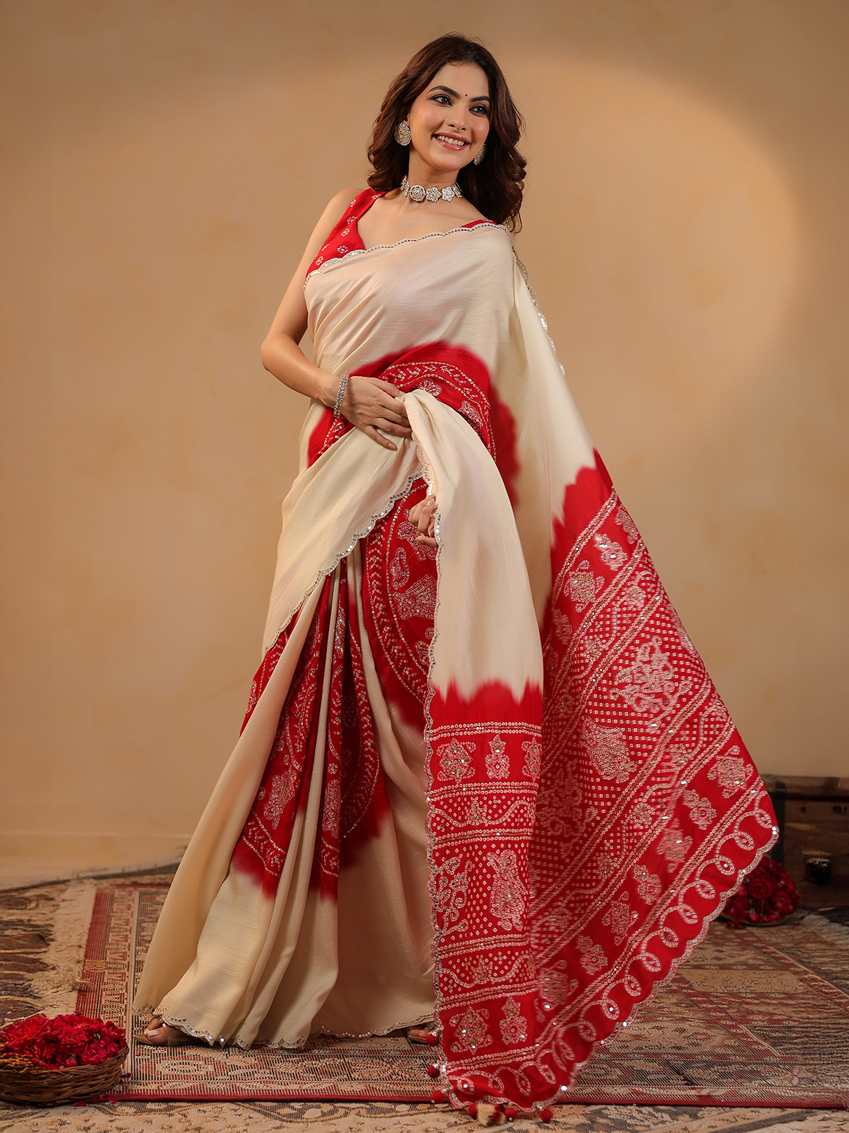 Understated charm defines the cream silk printed saree, falling gracefully with soft fluidity. Aabla, resham, and sequins add delicate sparkle across the drape. Includes an unstitched blouse piece, ideal for festive gatherings.