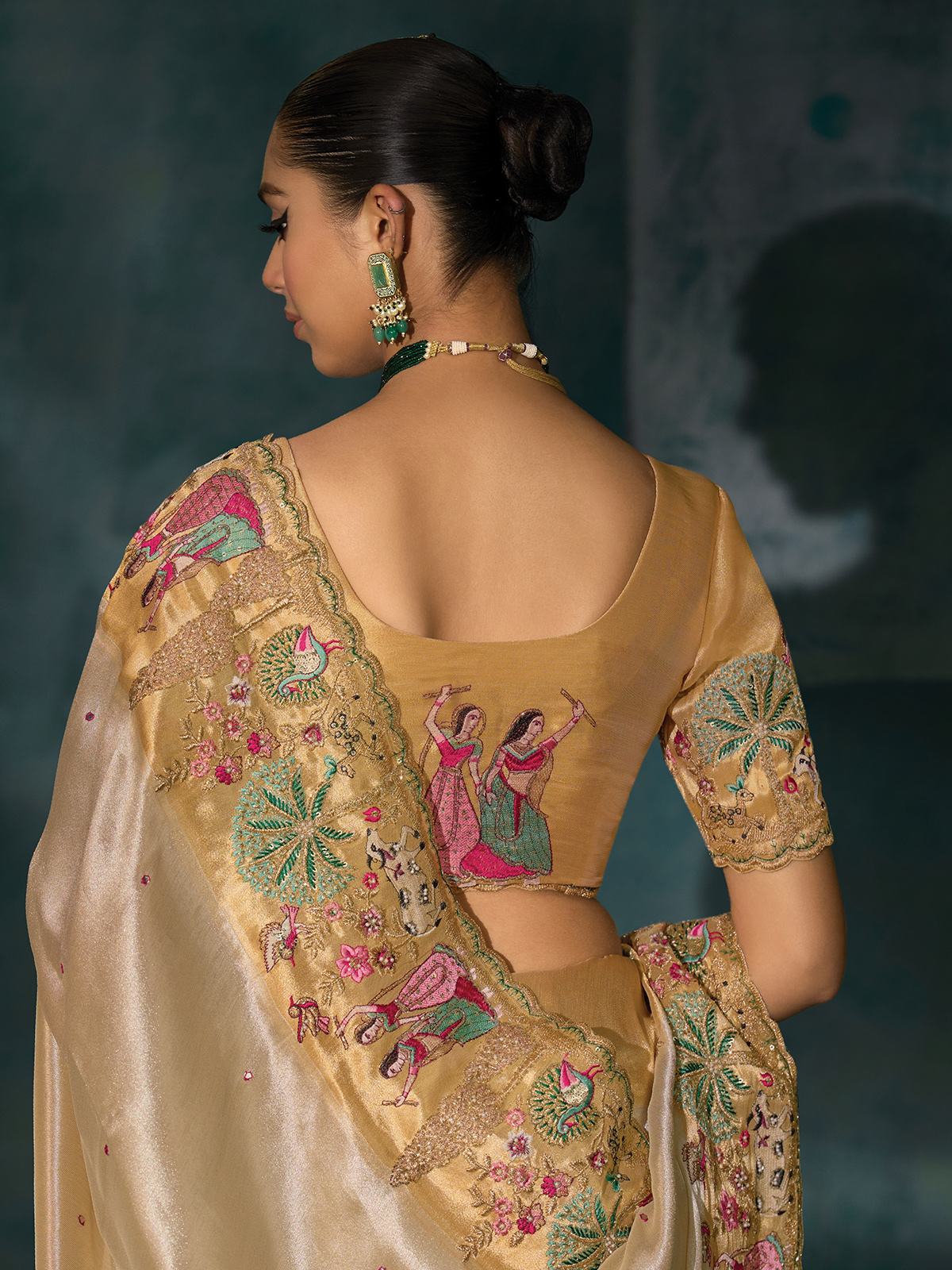 Soft cream silk saree drapes with quiet elegance, while the broad border sparkles with resham, beads, cutdana, and sequins. Crafted for weddings, festive events, and receptions, it comes with an unstitched blouse piece, allowing customization and highlighting the saree’s luxurious texture and sophisticated, understated beauty.