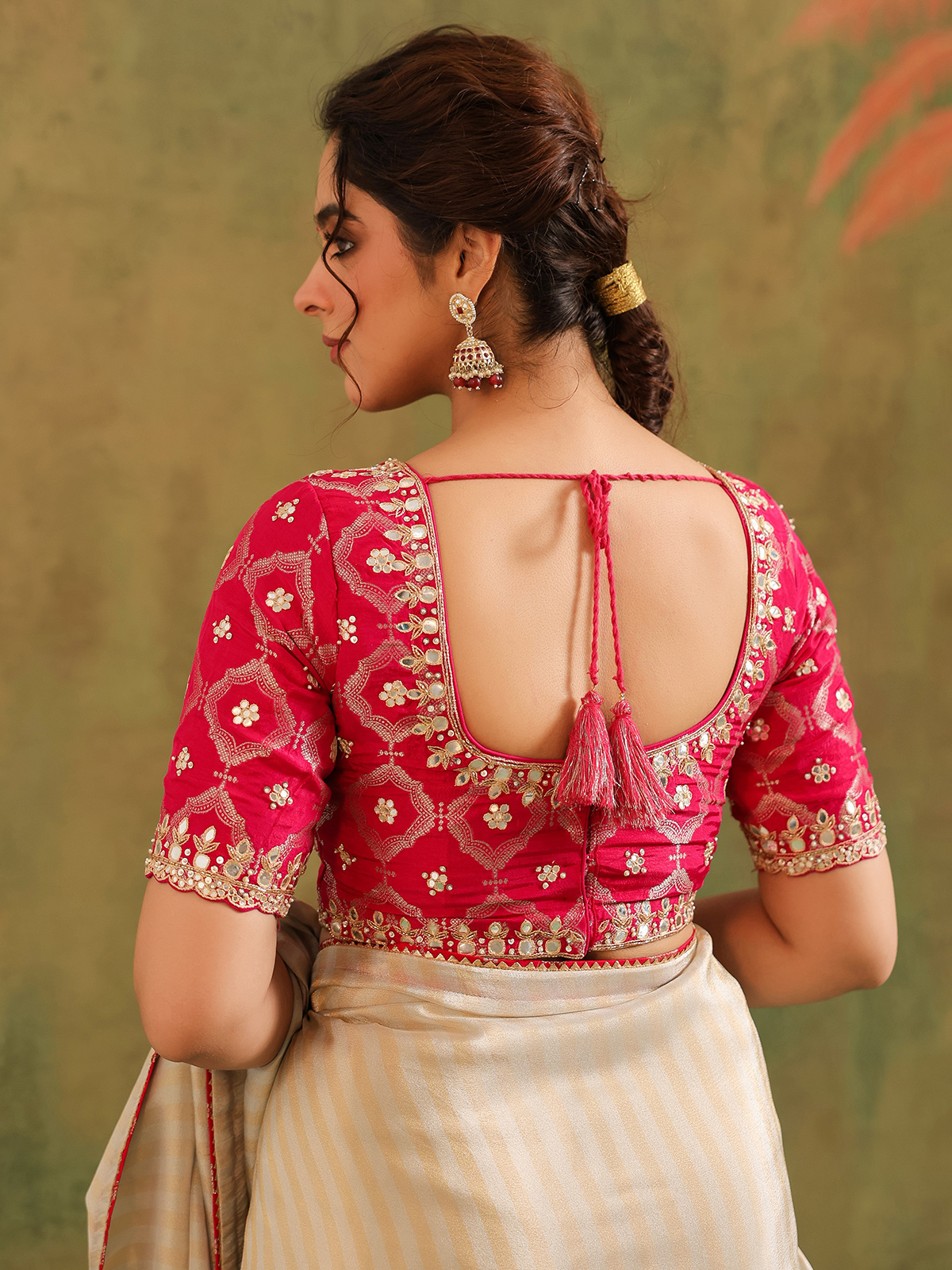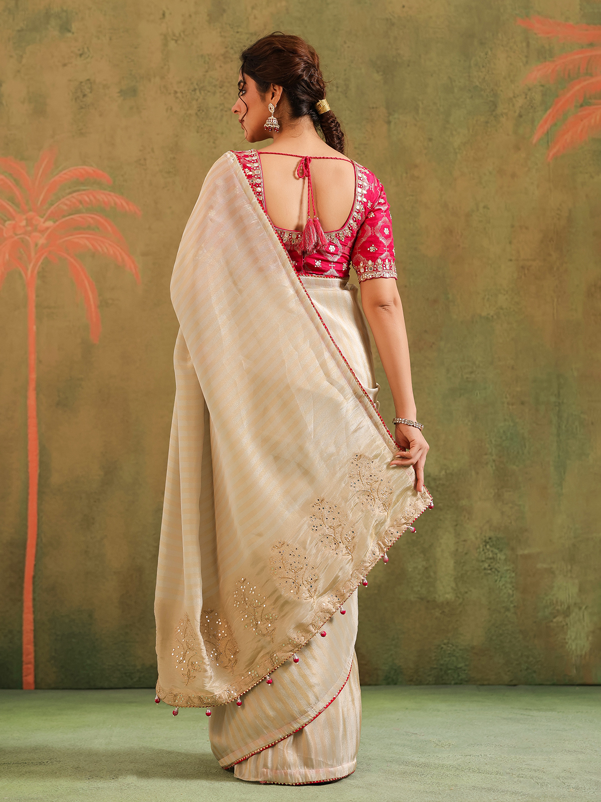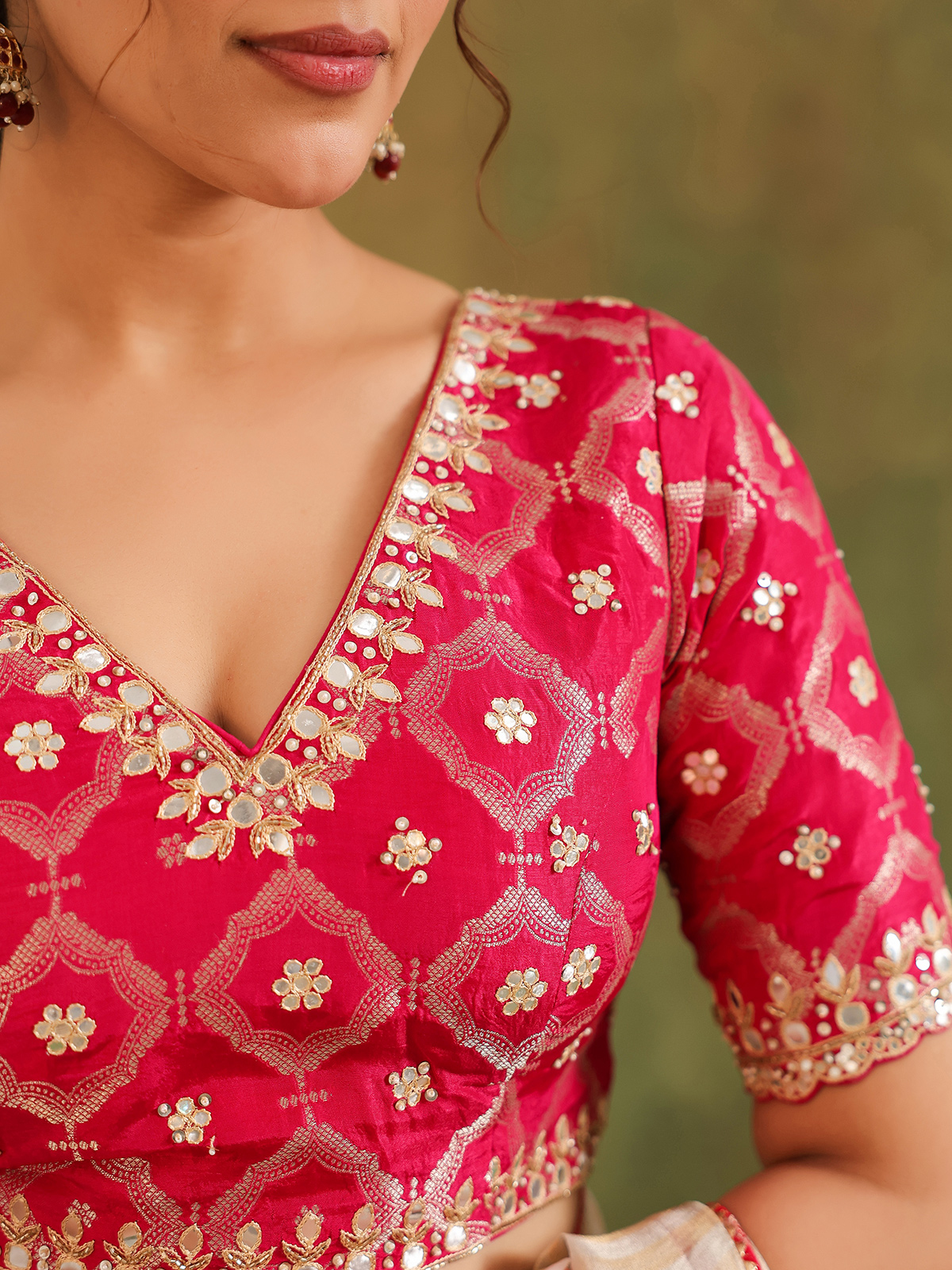 Cream silk whispers understated luxury, decorated with zari, mirror, cutdana, beads, and resham motifs twinkling like distant stars. Comes with a red unstitched blouse piece, creating a graceful ensemble for weddings and celebratory occasions.