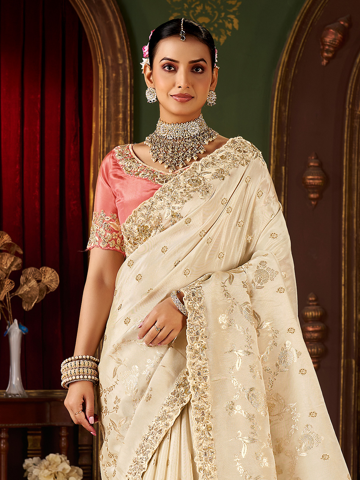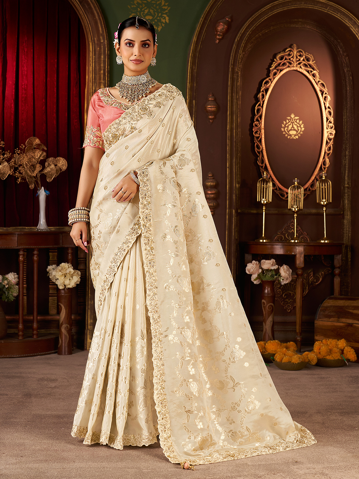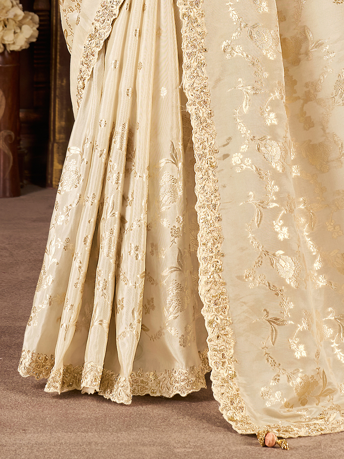 Designed in elegant cream soft silk saree. Showcases embroidery with sequins, stones and zari detailing. The contrast unstitched blouse piece enhances its appeal, making it perfect for weddings, receptions, sangeet and festive occasions with a refined ethnic touch.