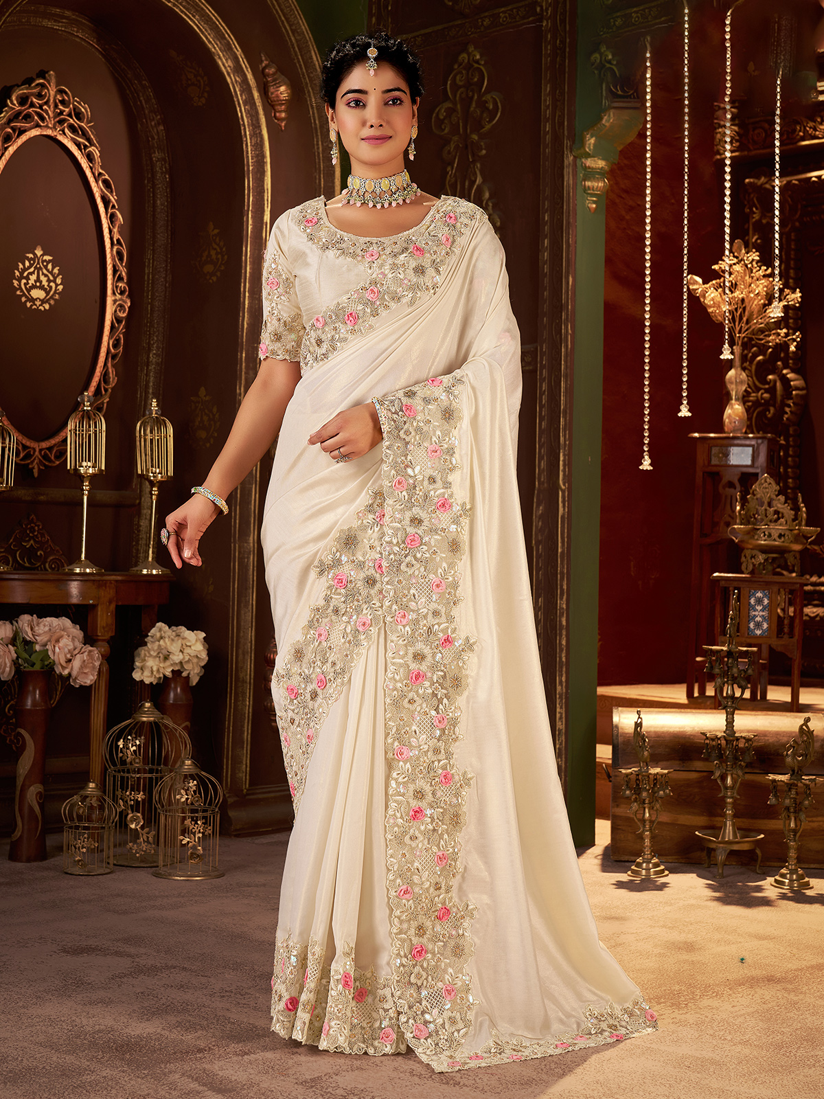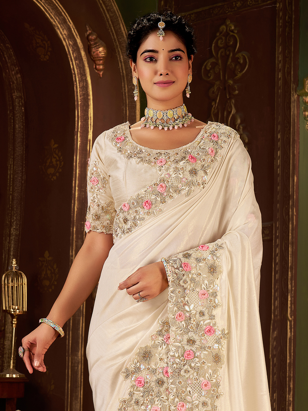 This cream soft silk saree with features rich zari, zardosi, embroidery, bead and sequin work, creating a graceful festive look. Paired with an unstitched blouse piece, it is ideal for weddings, sangeet, receptions and traditional celebrations with timeless elegance.