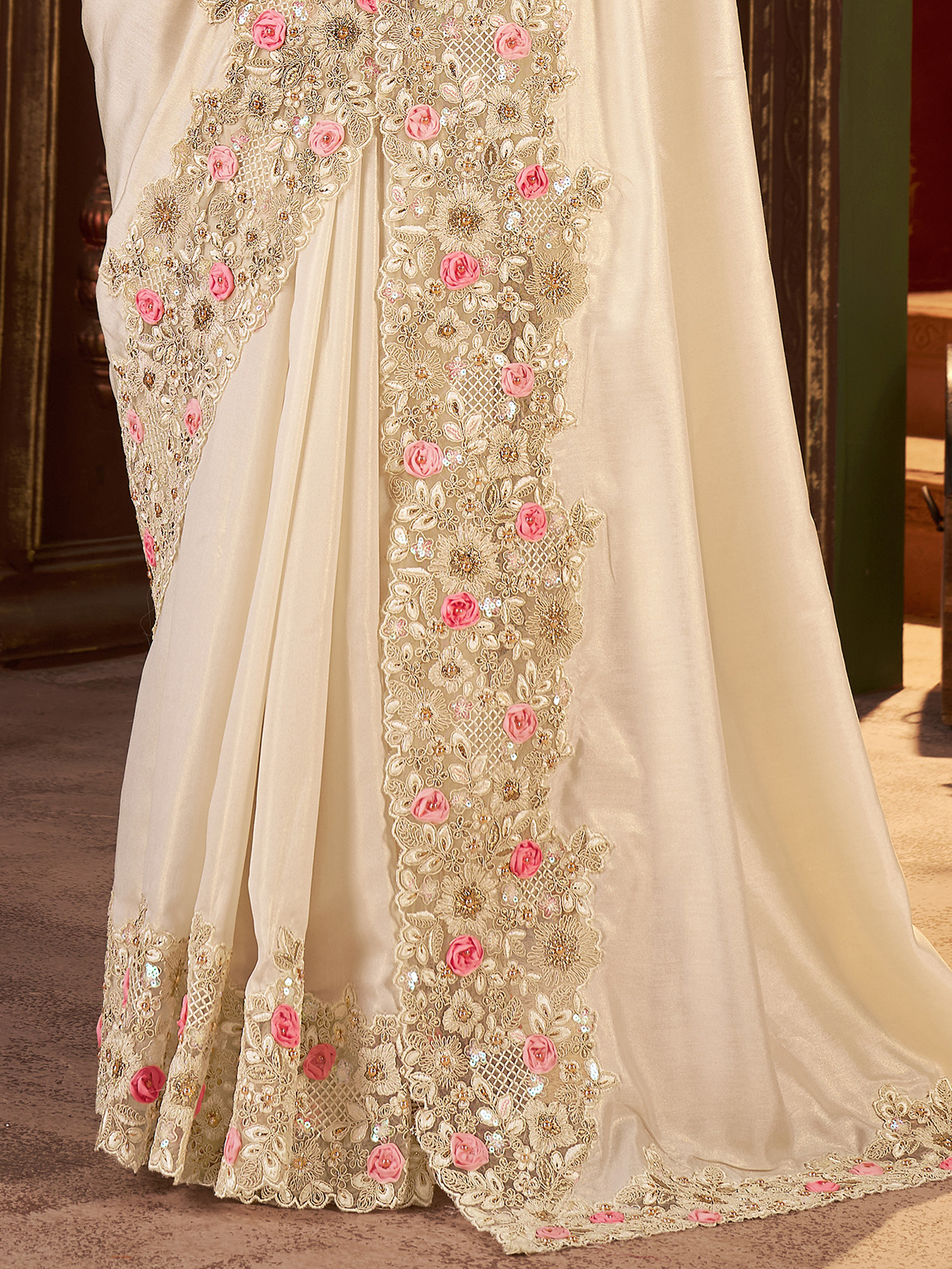 Cream Soft Silk Zari And Zardosi Wededing Wear Saree