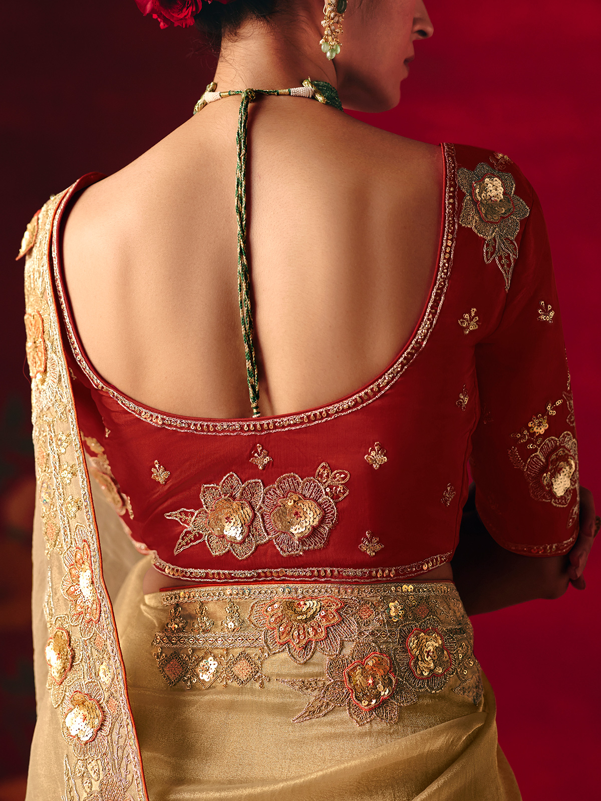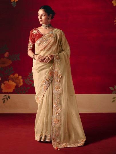 Designed in elegant cream tissue organza, this saree is beautifully embellished with embroidery, sequins, pearls, stone and resham detailing. Completed with a contrast unstitched blouse piece, it offers timeless charm for weddings, festive gatherings and refined receptions.