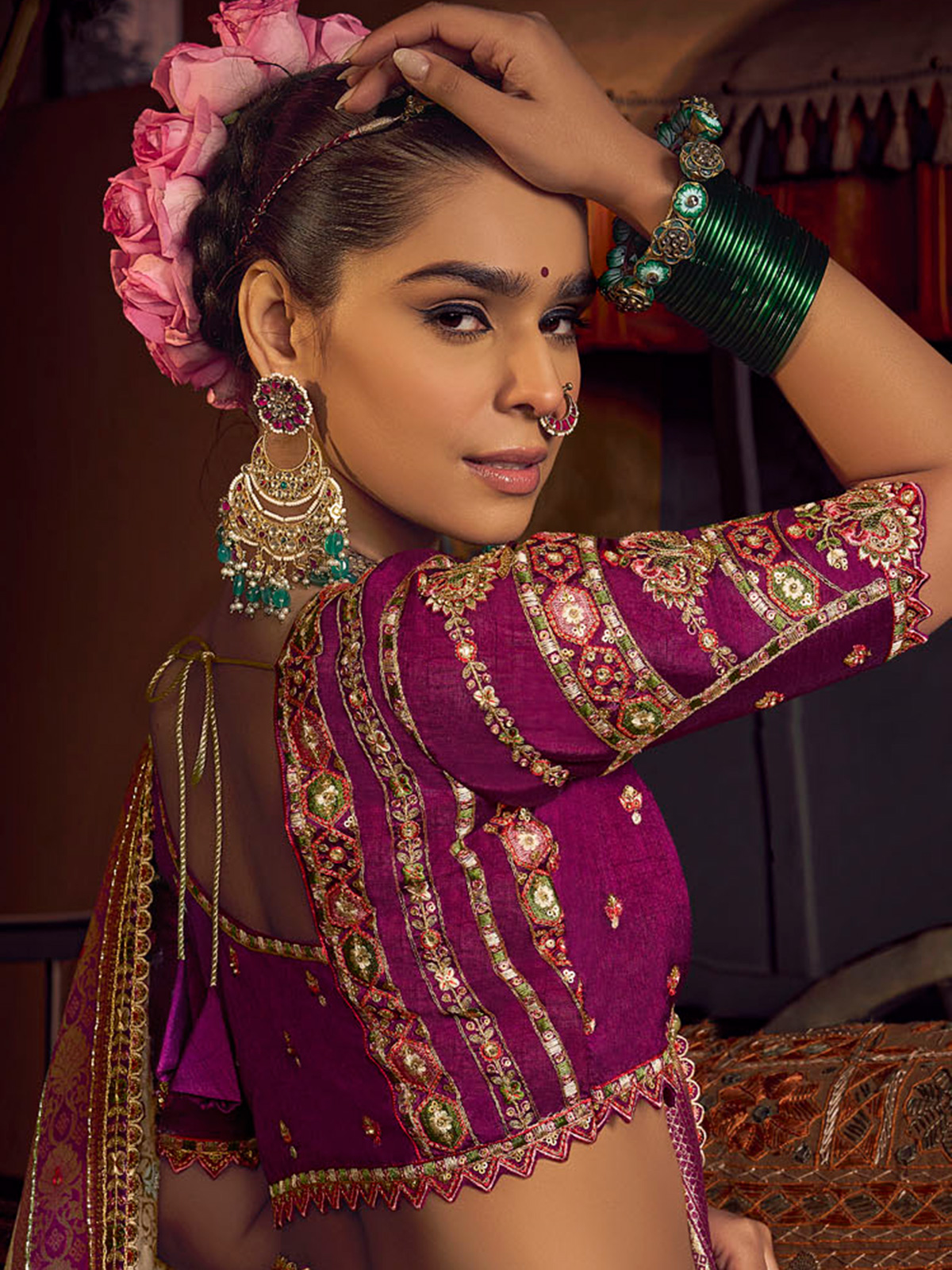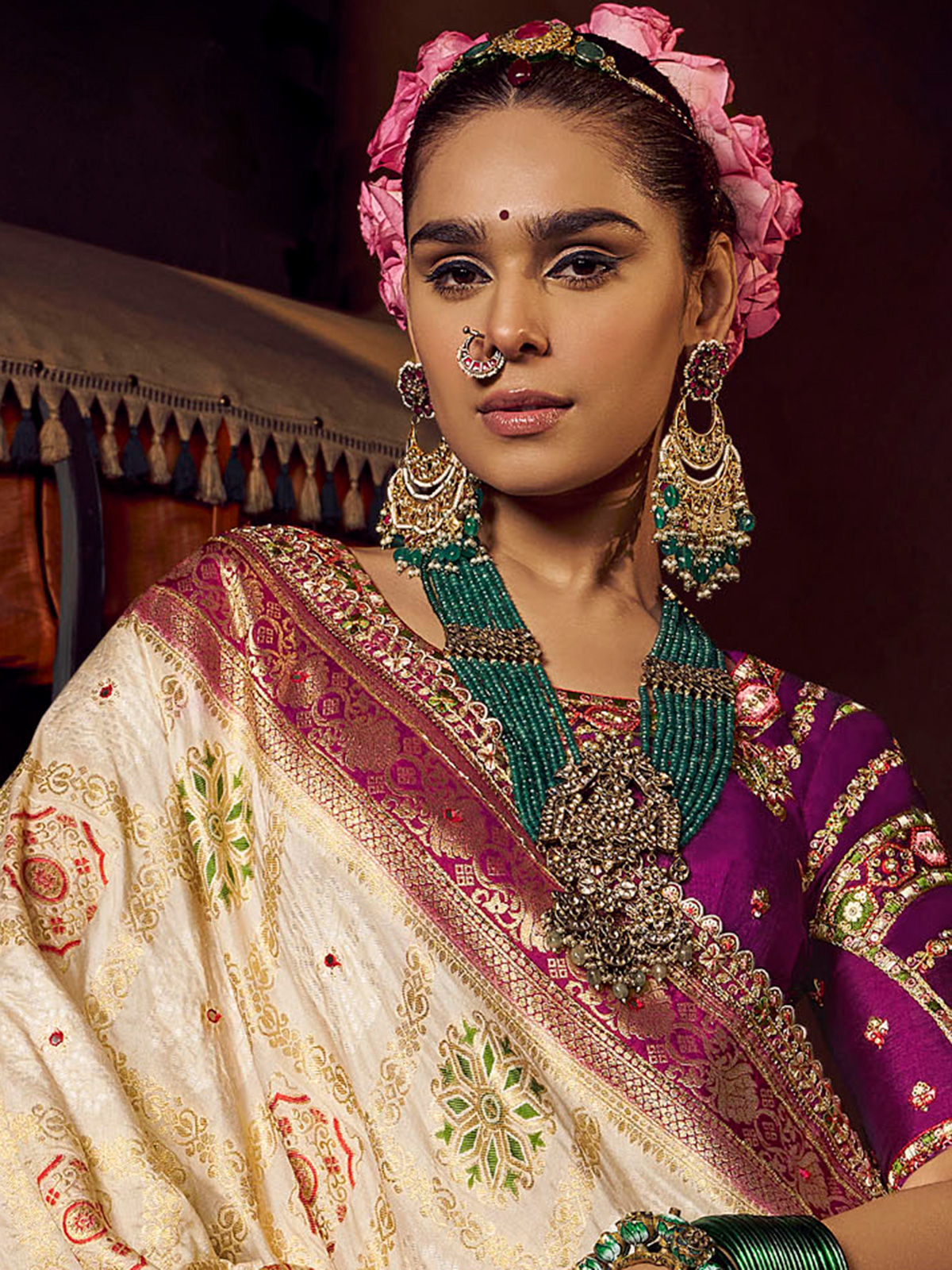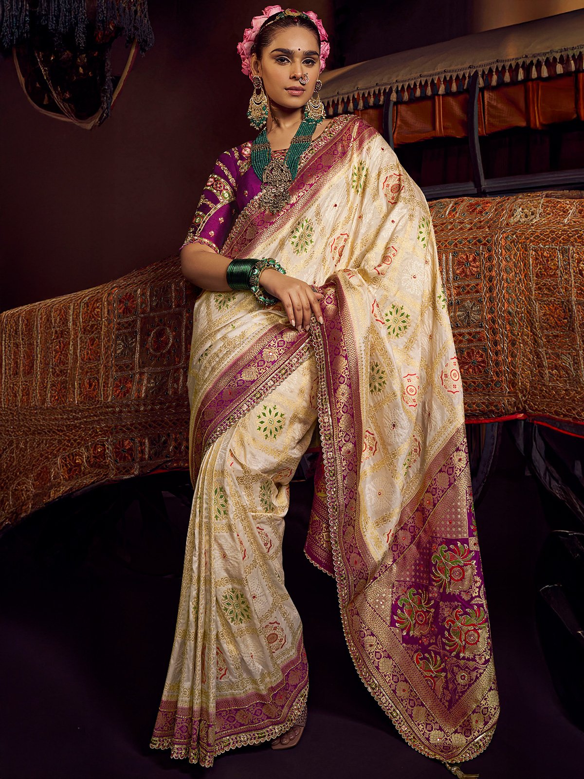 Let your style speak of heritage and sophistication in this cream silk saree. Embellished with fine Zari, sequins, thread, and cutdana embroidery, it offers a graceful yet eye-catching aesthetic. Paired with a regal purple unstitched blouse piece, it’s perfect for traditional celebrations.