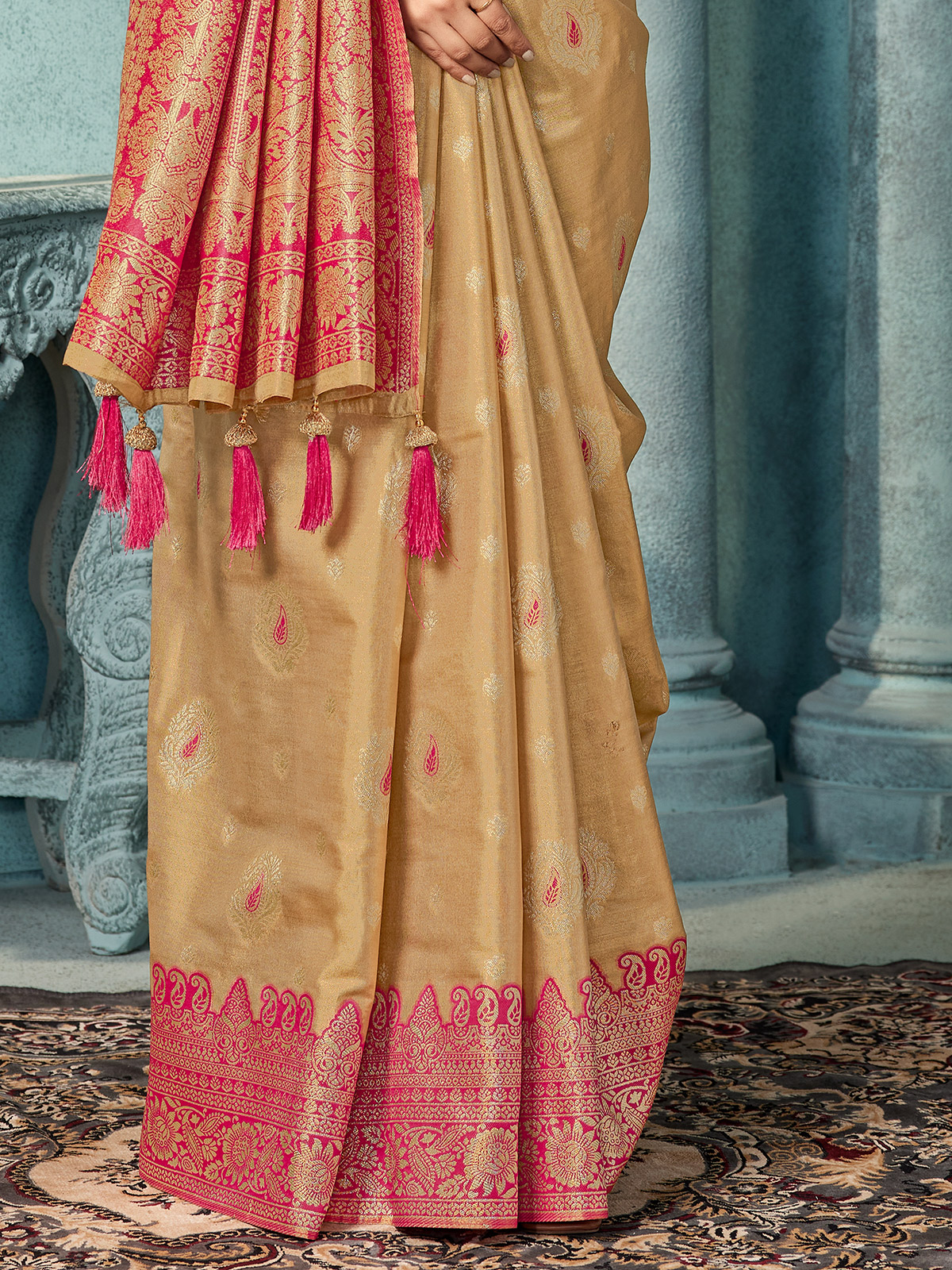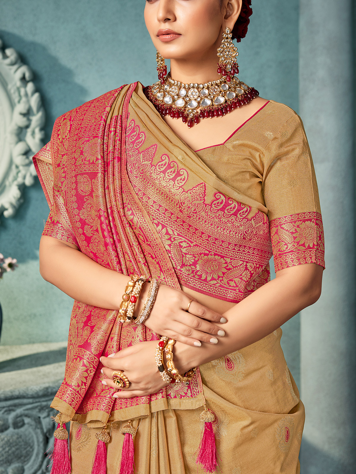 This dark beige silk saree is styled with traditional zari detailing and a striking contrast border for classic elegance. Finished with an unstitched blouse piece, it delivers a graceful and timeless look ideal for wedding functions, festive gatherings and refined reception events.