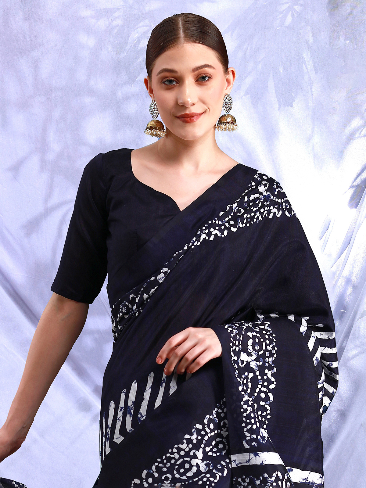 Stand out in style with this striking dark blue Bhagalpuri silk saree. Showcasing a captivating printed design, it offers the perfect mix of elegance and contemporary flair. Comes with an unstitched blouse piece.