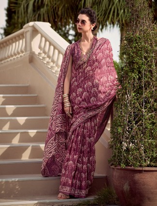 Make a chic statement in this rich dark brown malmal silk saree. Its distinctive all-over print and refined drape make it a standout piece. Includes an unstitched blouse for a perfectly tailored look.