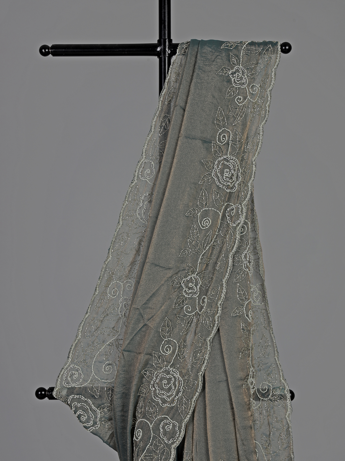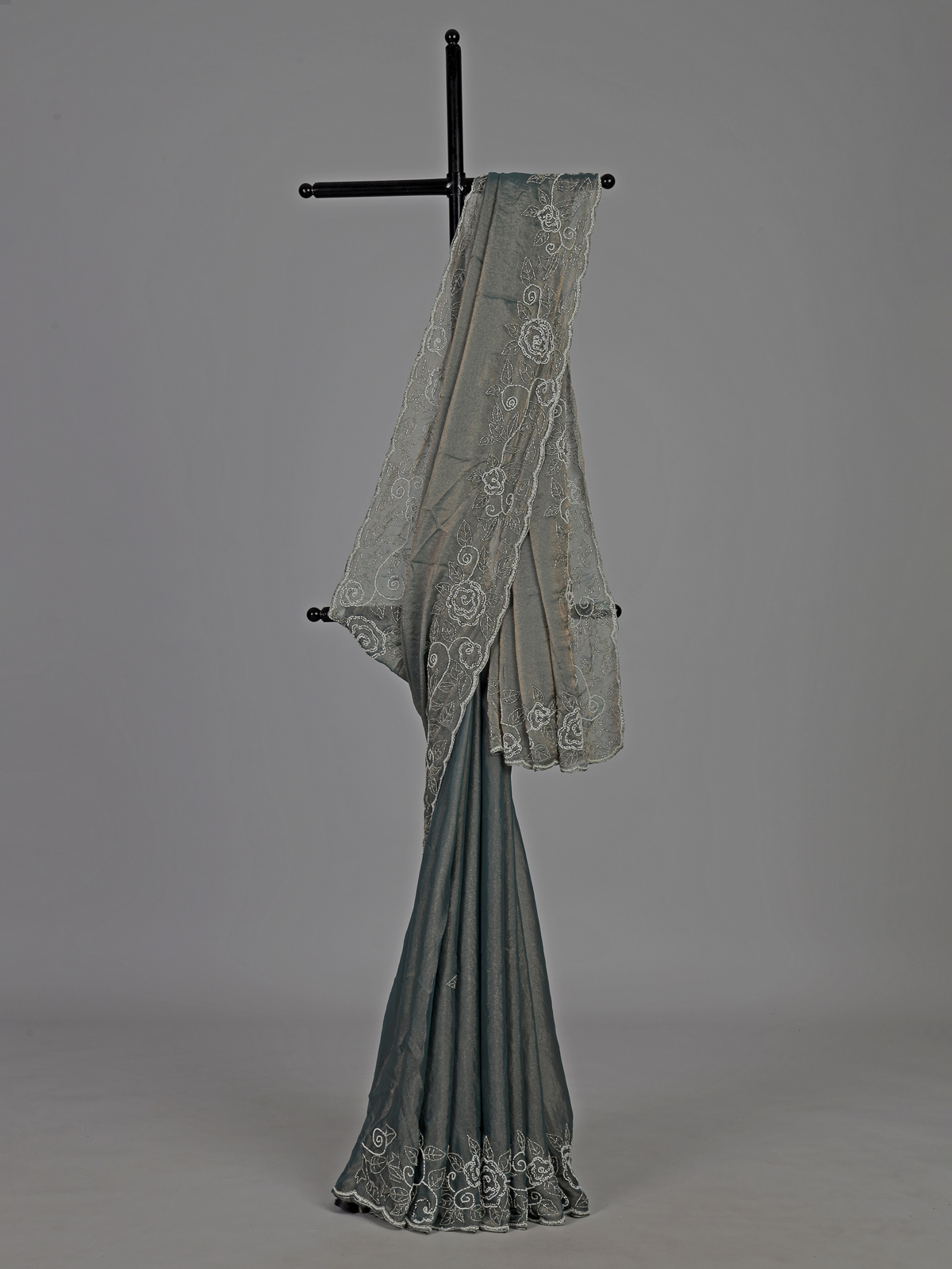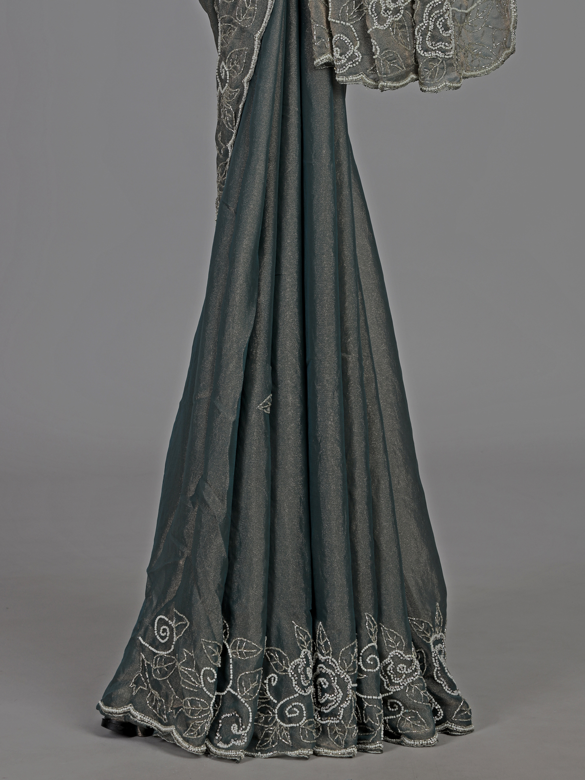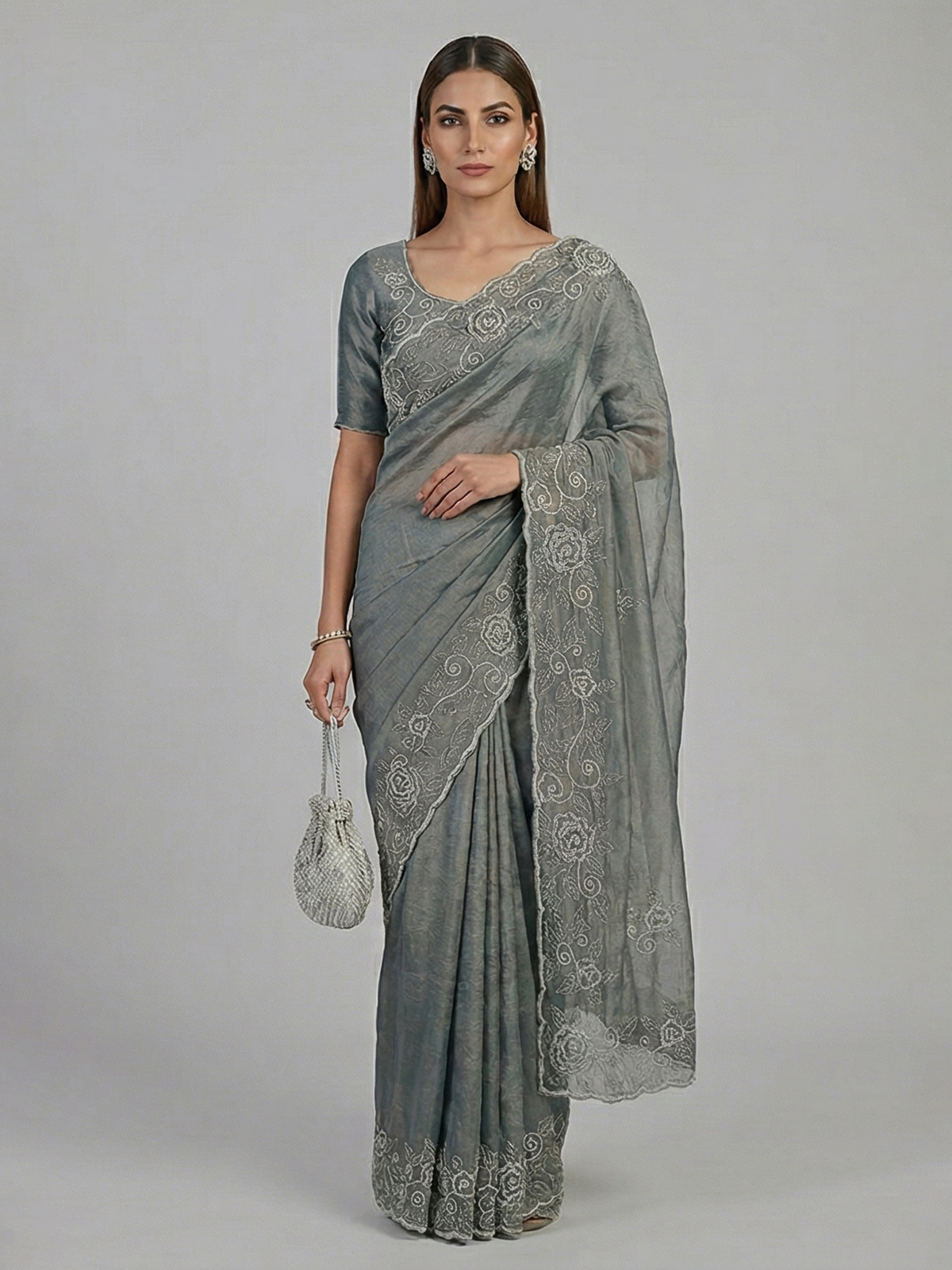 Dark Grey Tissue Silk Embellished Party Wear Saree
