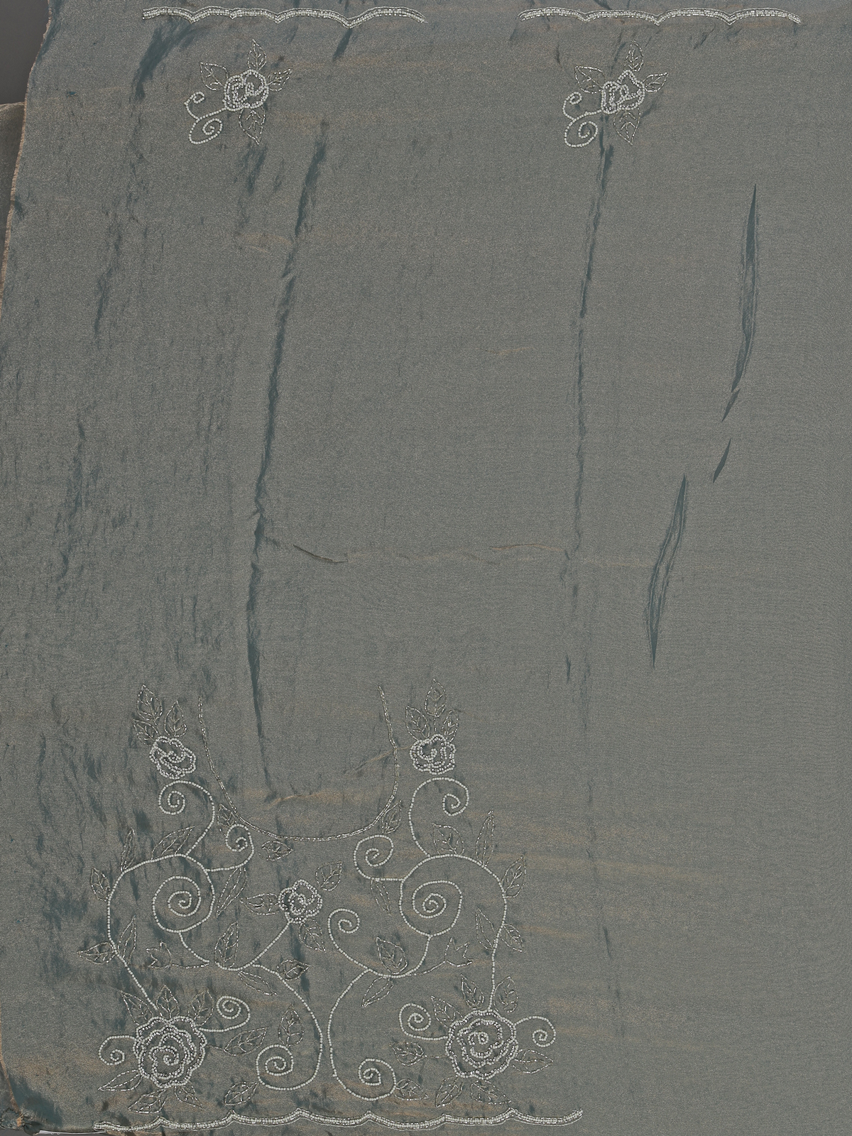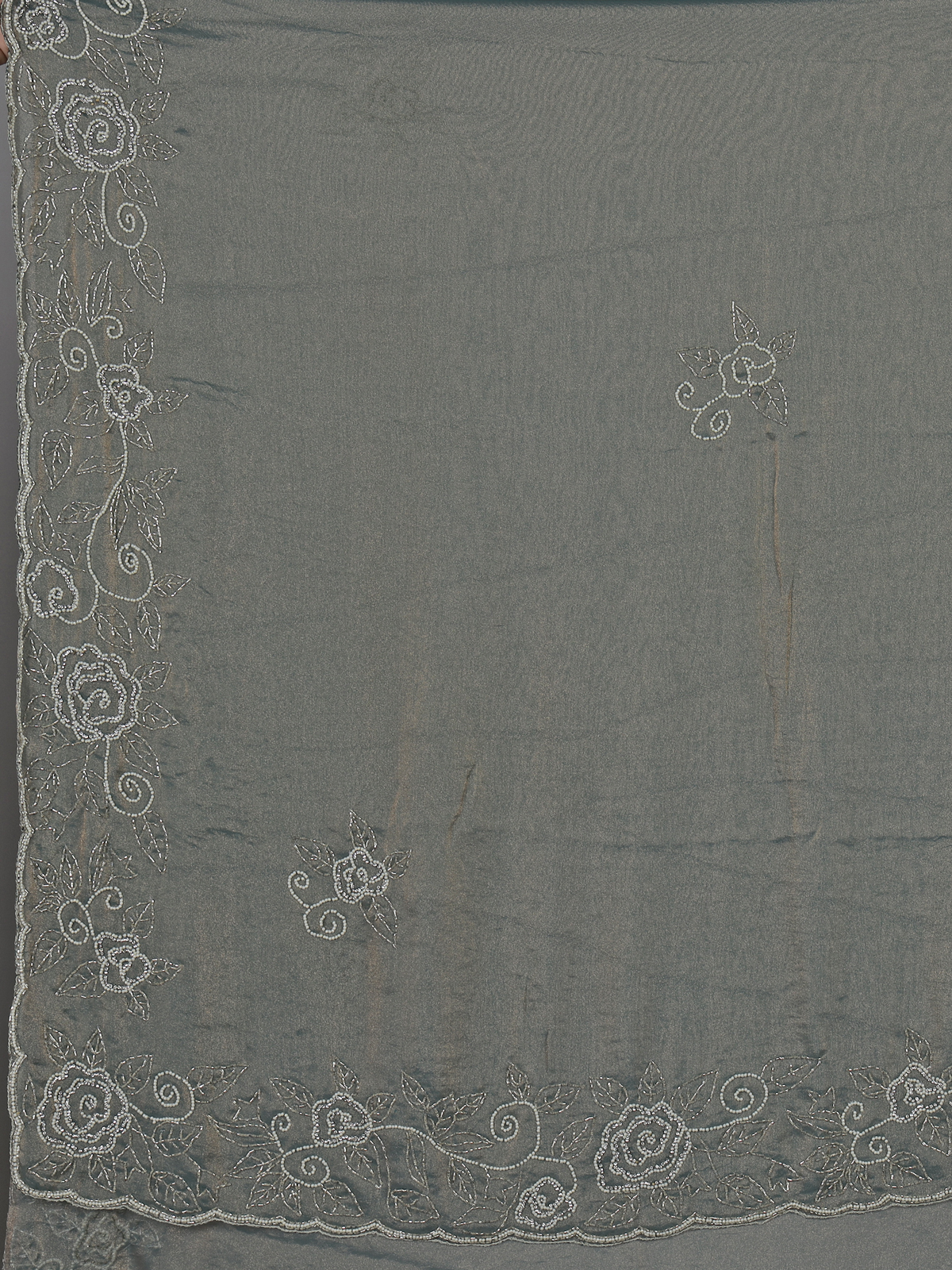 Deep dark grey tones bring modern sophistication to this tissue silk saree crafted for festive glamour. Embellished with cutdana, pearls and diamond work. It offers a rich shimmer. The fluid drape enhances its refined appeal. Perfect for weddings, receptions and parties. It comes with an unstitched blouse piece for a sleek and elegant look.