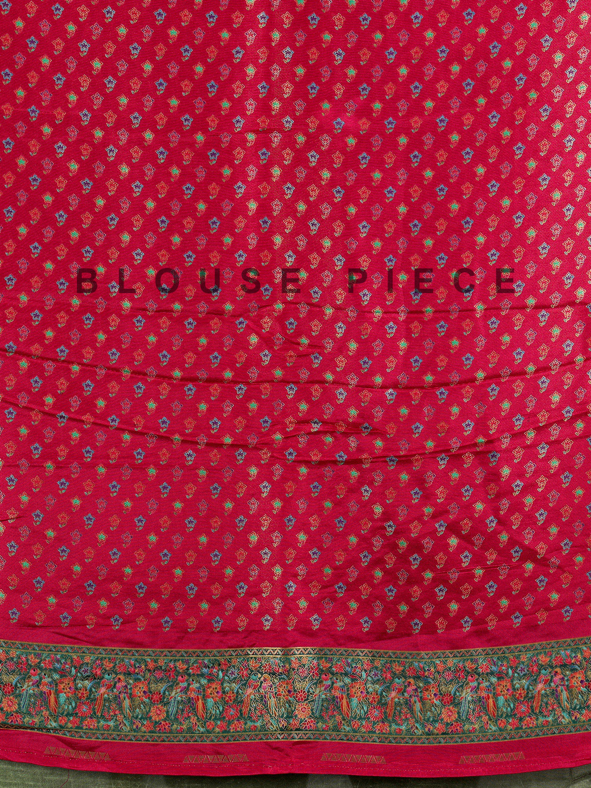 Earthy dark olive green tones define this semi pashmina silk saree crafted for festive styling. Featuring zari and colorful motif weaving, it reflects traditional richness. Ideal for weddings and mehendi functions, it comes with an unstitched contrast blouse.