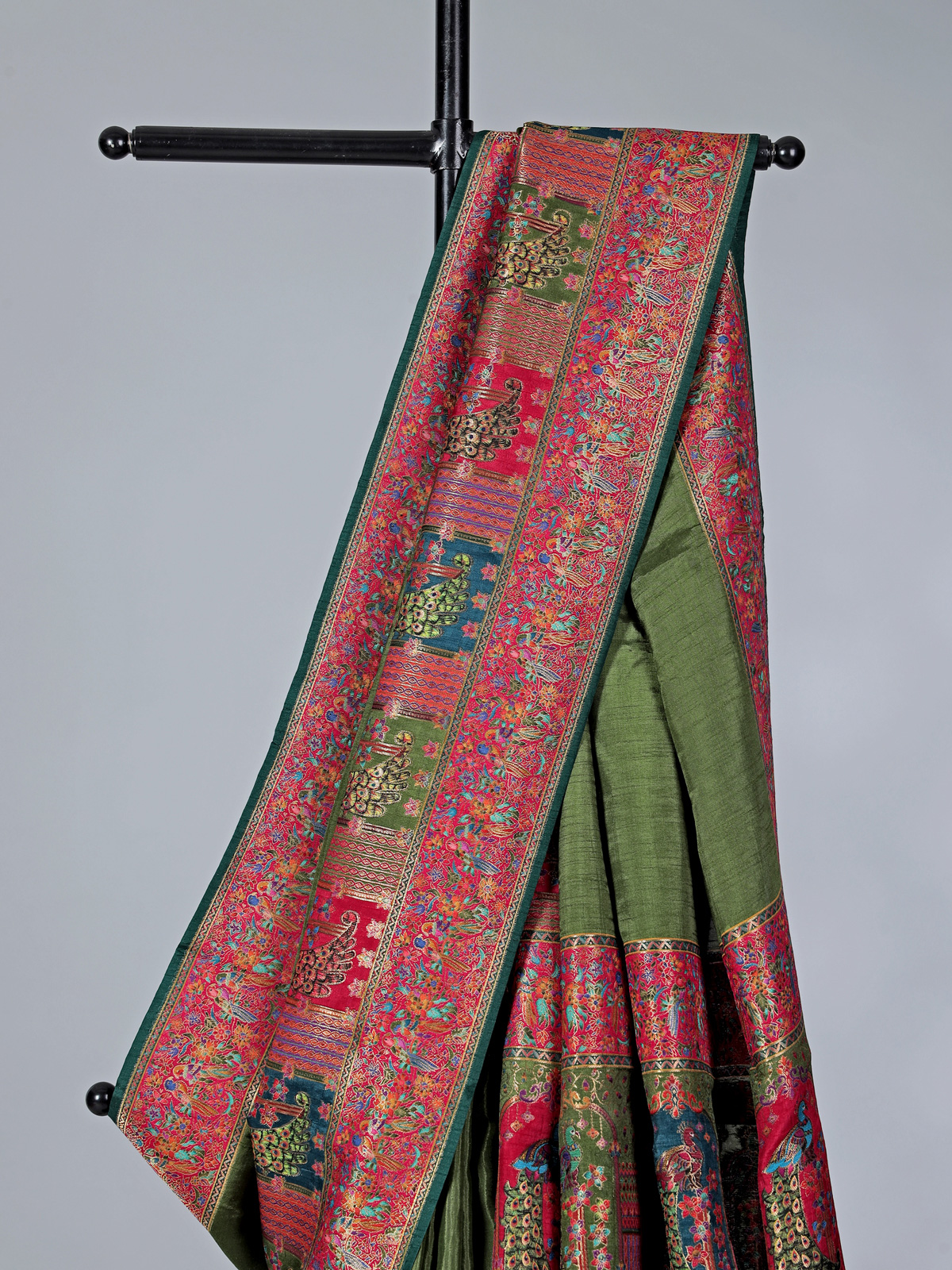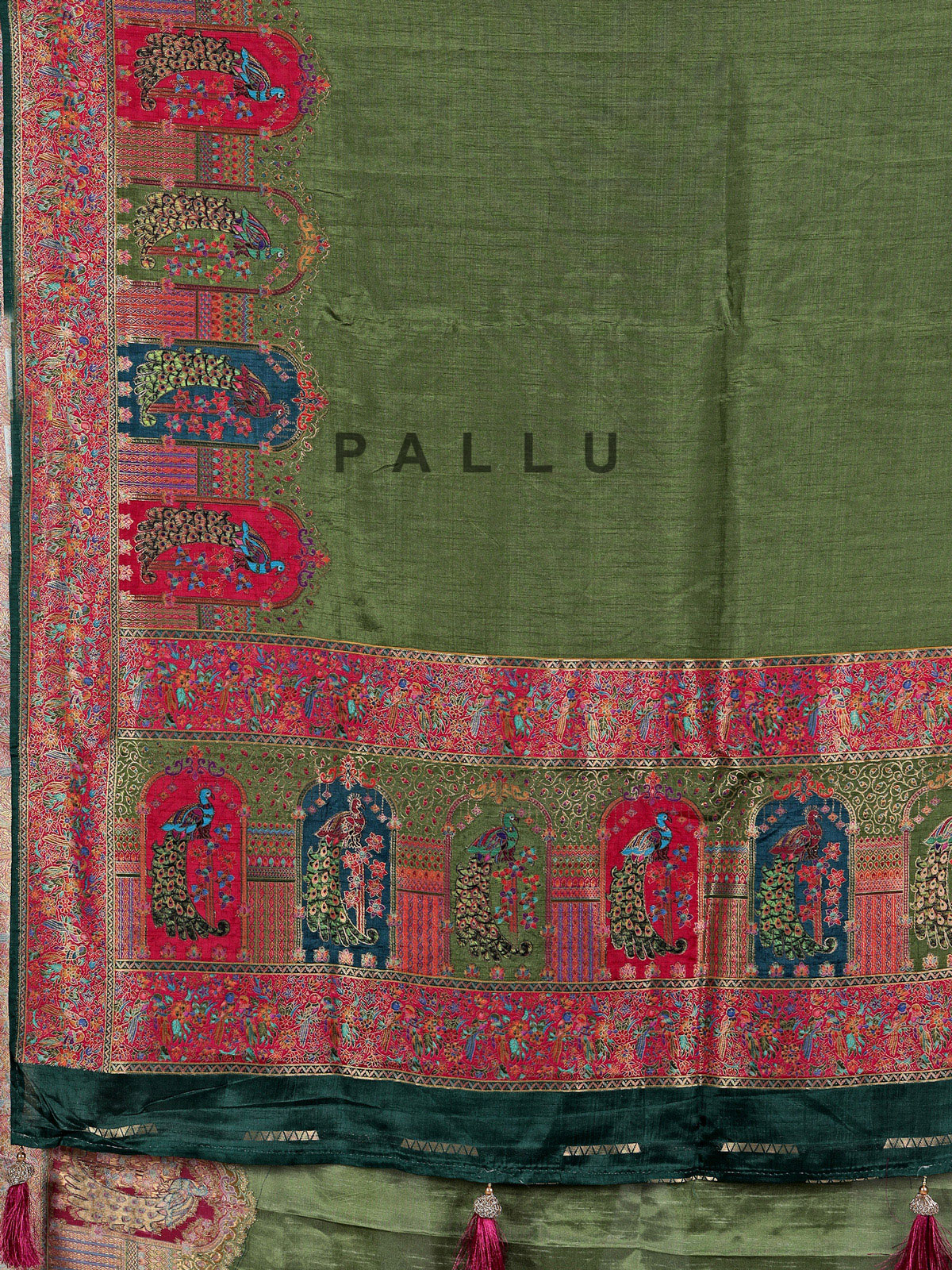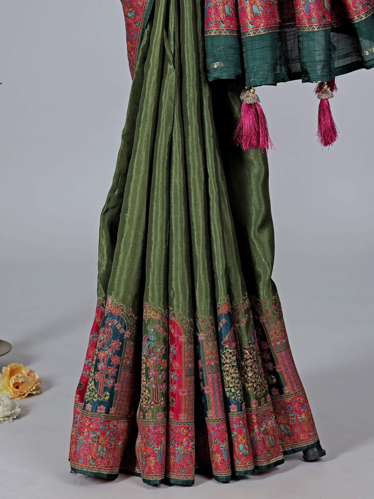 Dark Olive Green Festive Semi Pashmina Silk Saree