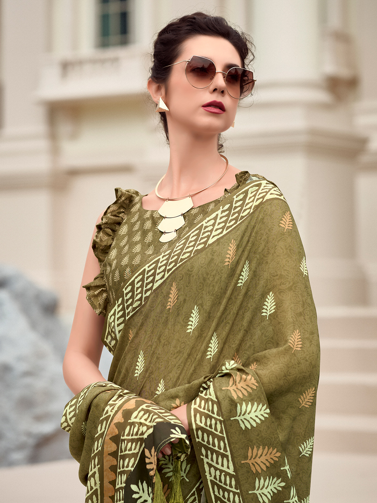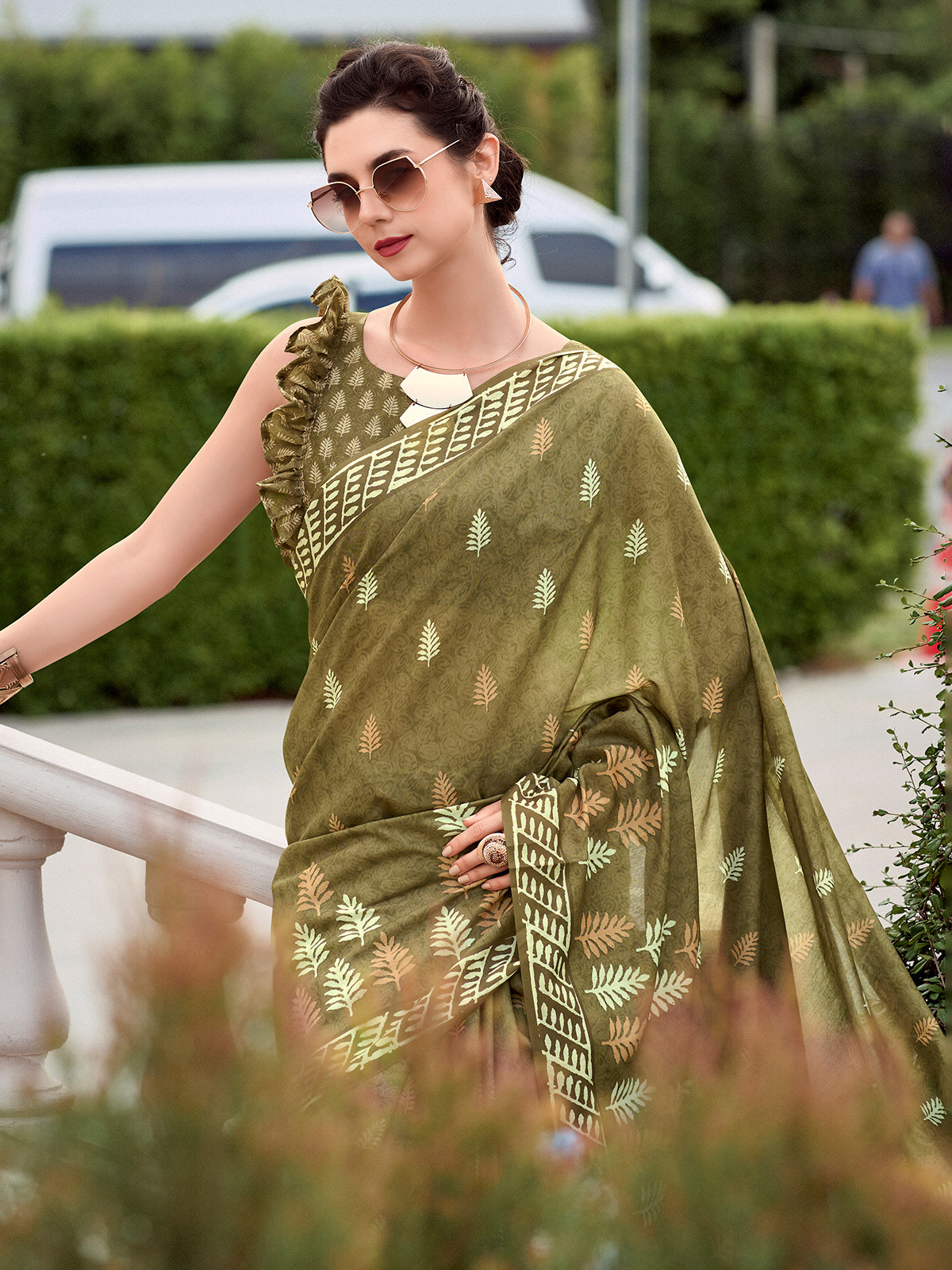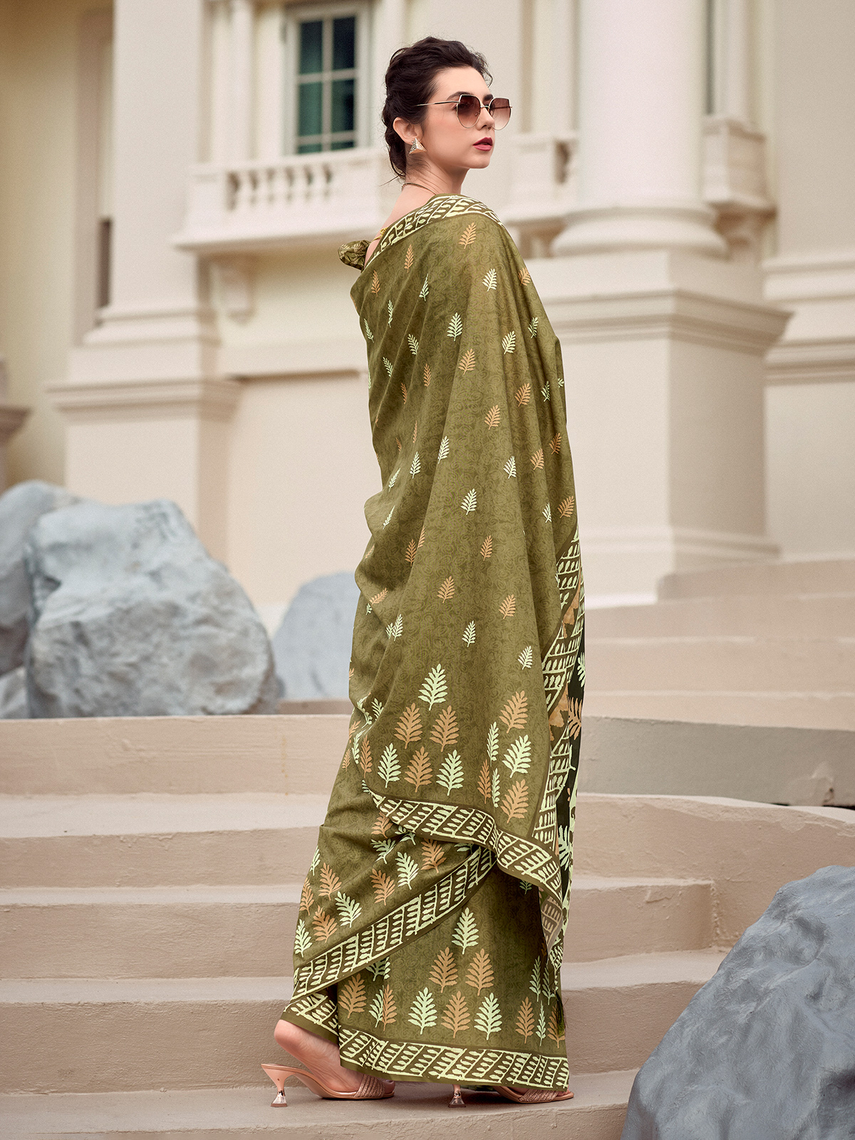 Embrace heritage with this graceful dark olive malmal silk saree. Featuring a charming printed design, it offers comfort and sophistication. Comes with an unstitched blouse piece to tailor your perfect look.