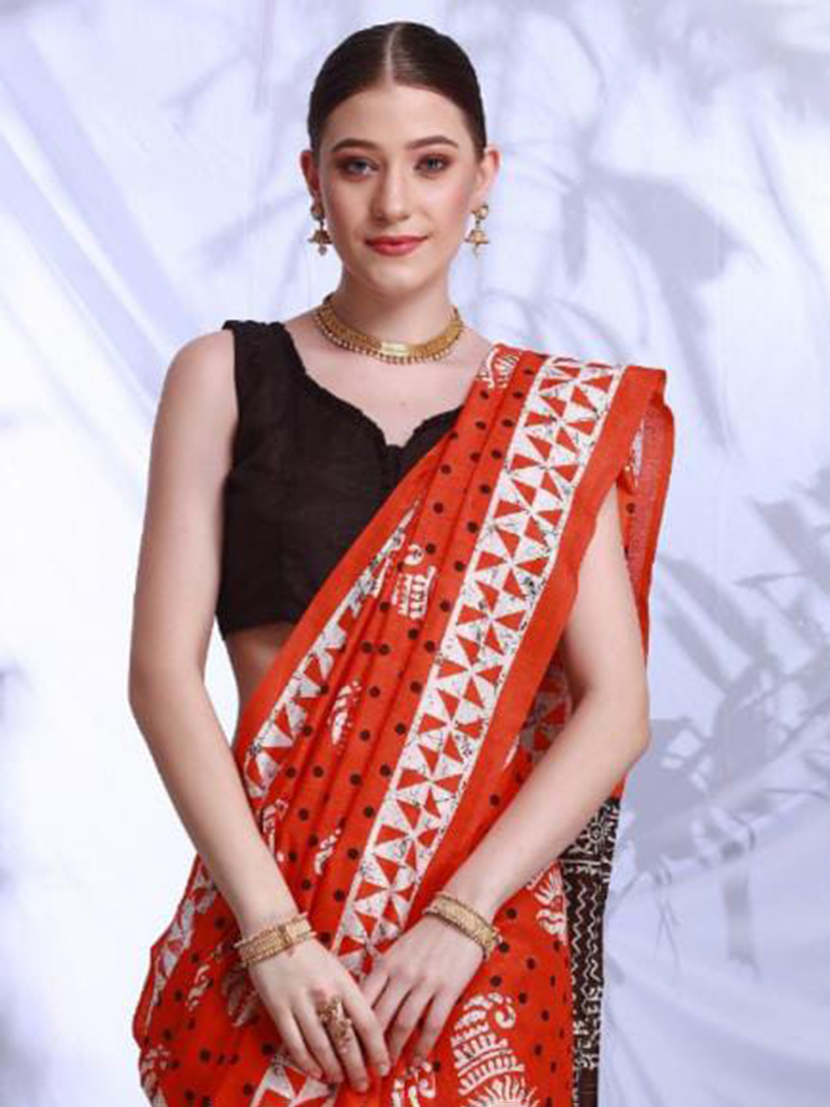 Sophistication blends seamlessly with simplicity in this dark orange Bhagalpuri silk saree. Featuring a modern print and a polished finish, it's perfect for both casual and formal occasions. Includes an unstitched blouse piece.