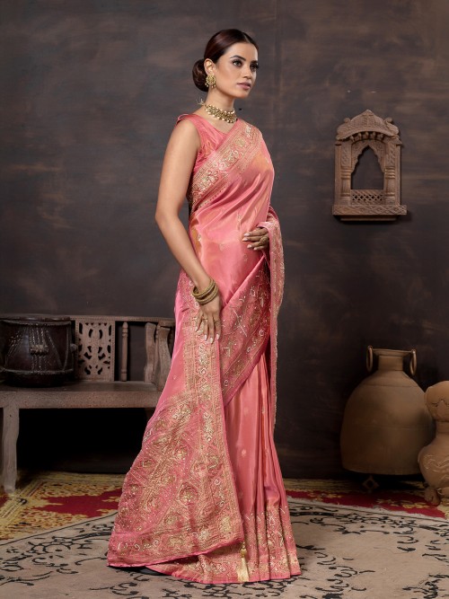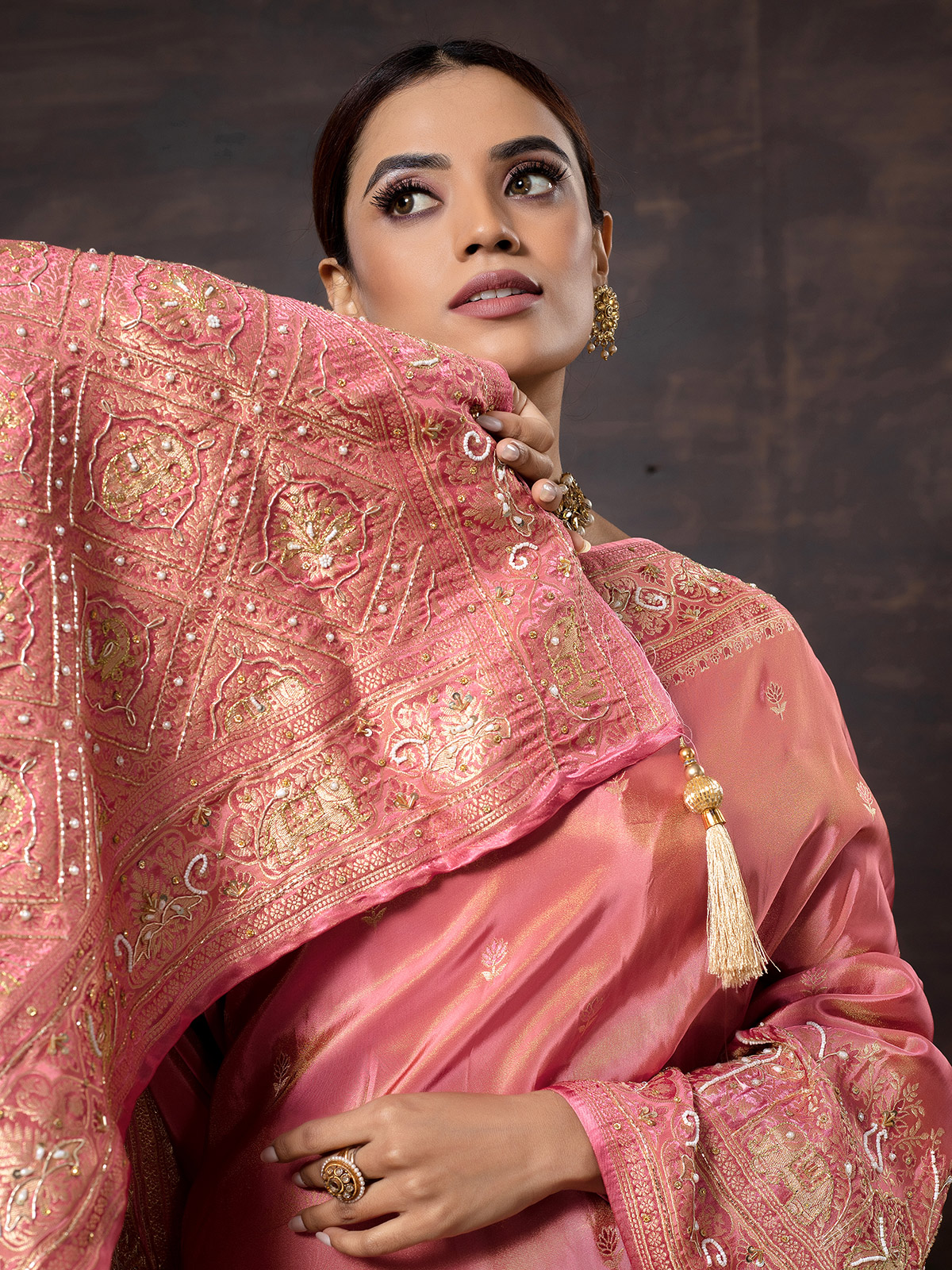 This dark peach tissue silk saree shines with sequins, cutdana, beads, zardosi, resham, and zari embellishments. The sleeveless V-neck blouse enhances its chic styling while keeping the traditional detailing in focus. Perfect for weddings and festive celebrations, this saree drapes in elegance, creating a captivating presence. With its rich tone and sparkling work, it is an ideal choice for women who wish to exude sophistication with grandeur.