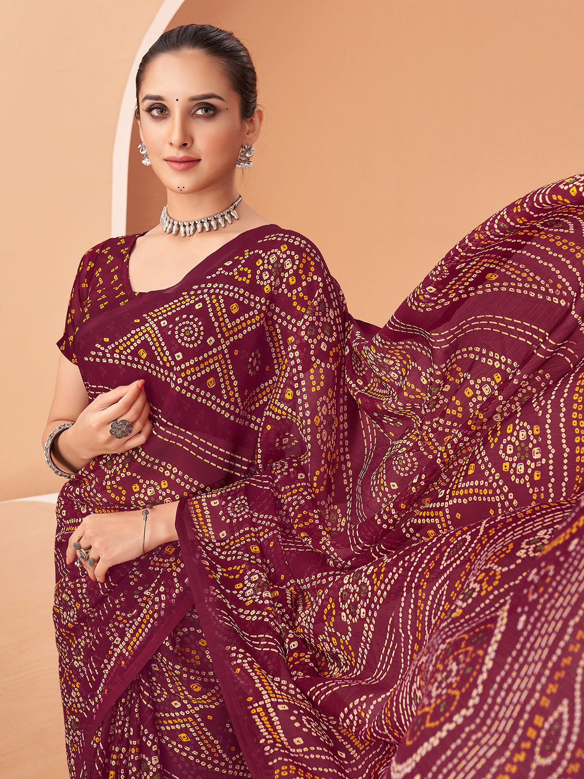 Designed in soft chiffon, this dark purple saree features traditional bandhani prints that bring rich ethnic elegance. The lightweight fabric drapes effortlessly, offering comfort and style. Paired with an unstitched blouse piece, it is perfect for festive celebrations, puja functions, and casual ethnic wear, making it a versatile choice for any wardrobe.