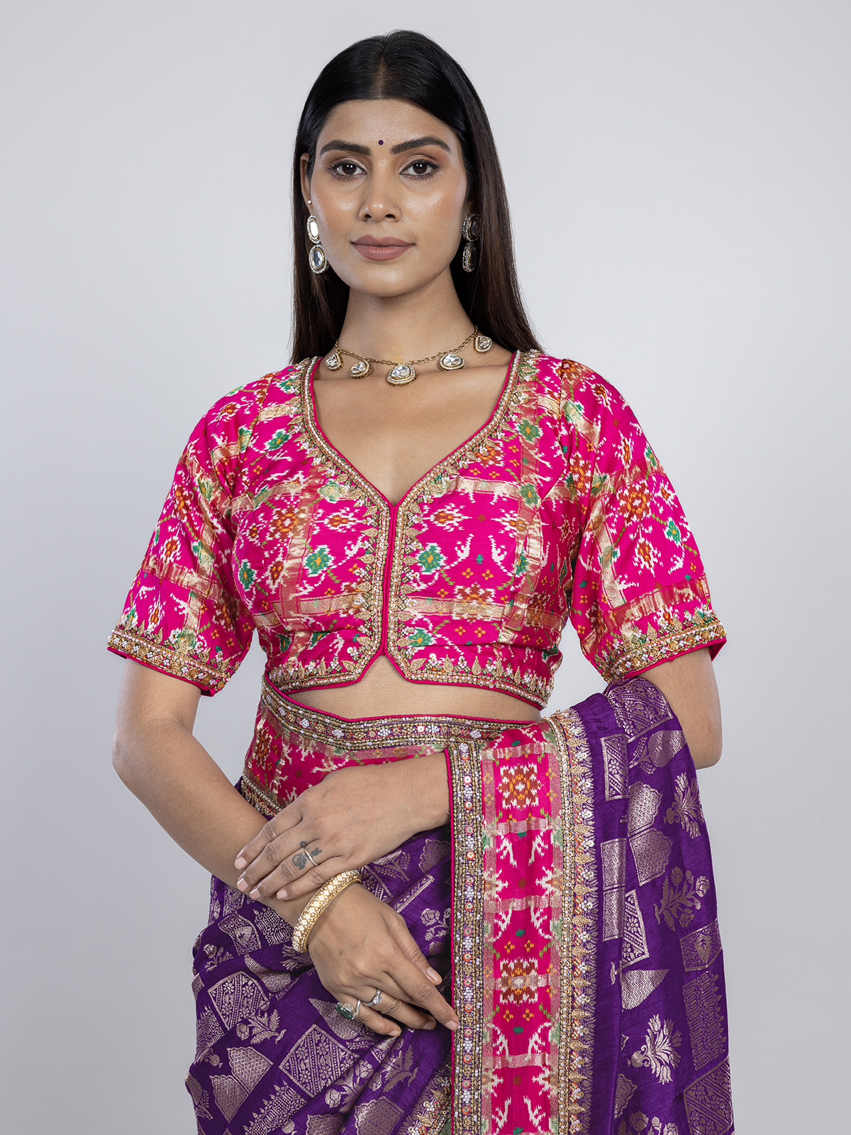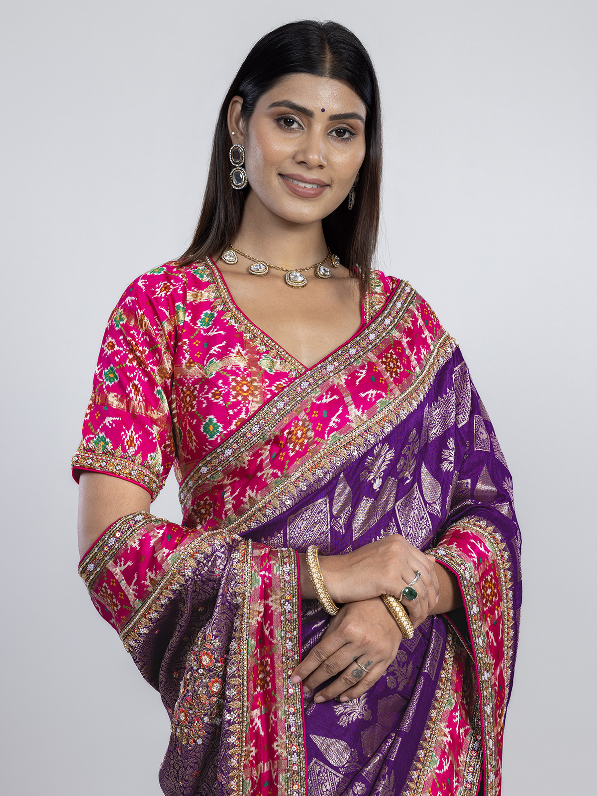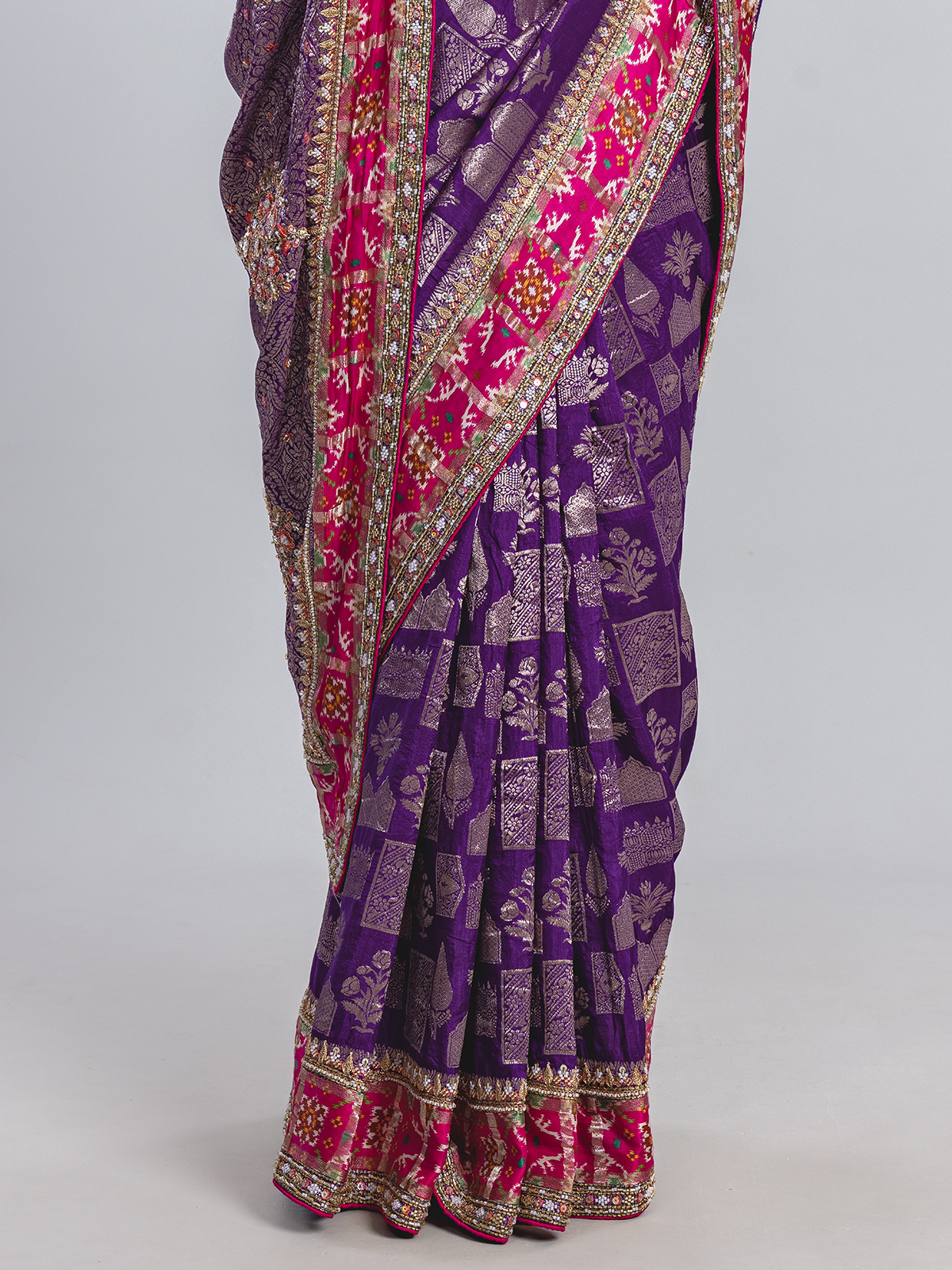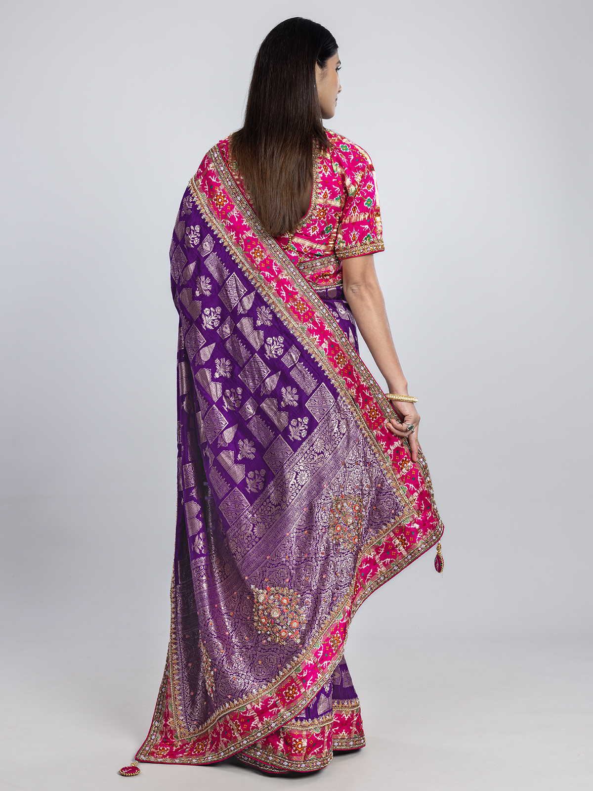 Wrapped in luxury, this dark purple dola silk saree shines with zari, beads, cutdana, resham, and sequins. A patola pink border enhances its grandeur, while the pink readymade blouse adds a vibrant touch. Perfect for weddings, it embodies regal artistry with a modern glow of celebration.