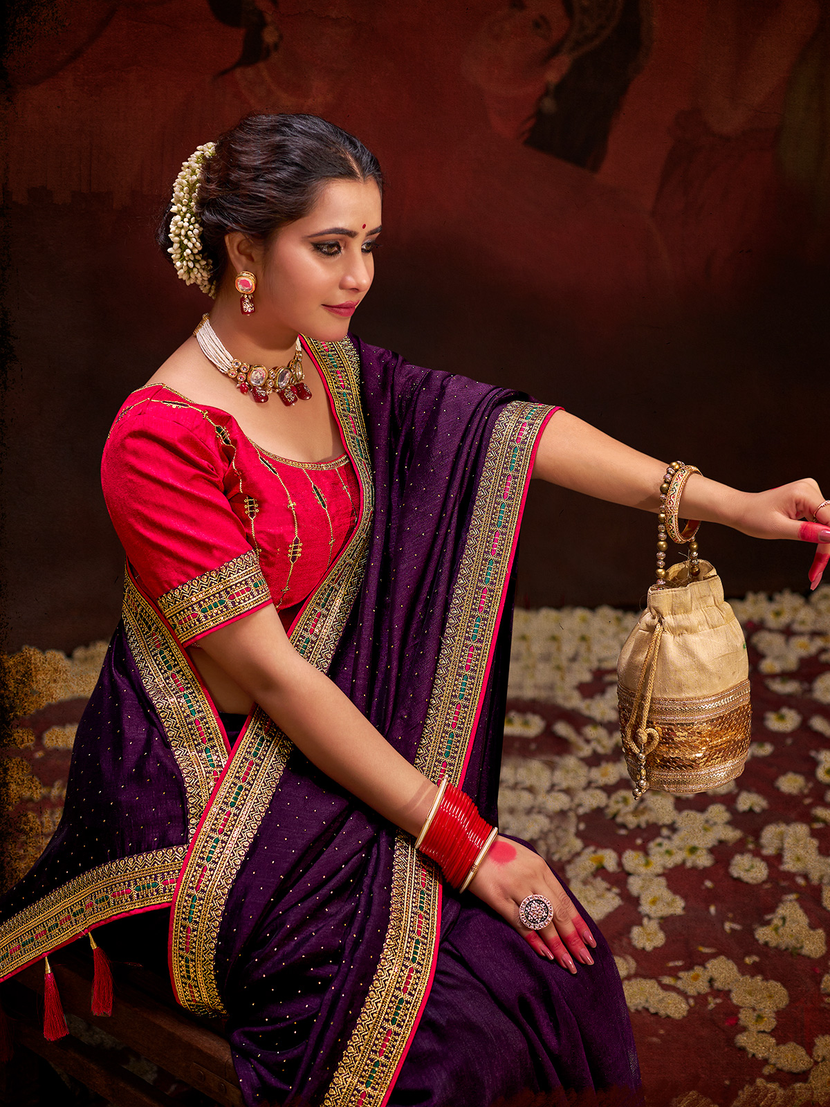 Shop this striking dark purple silk saree, featuring Swarovski crystals, embroidery, sequins, and resham work. It includes an unstitched blouse piece to complete your festive look.