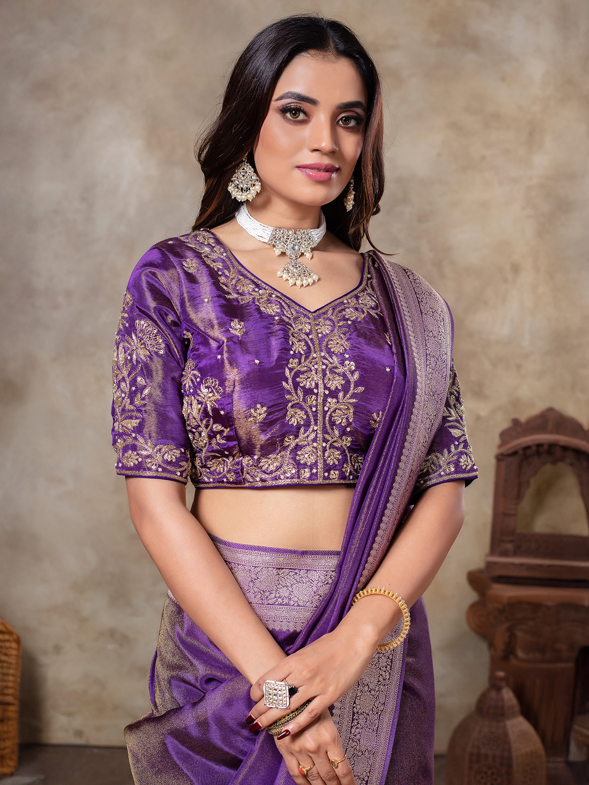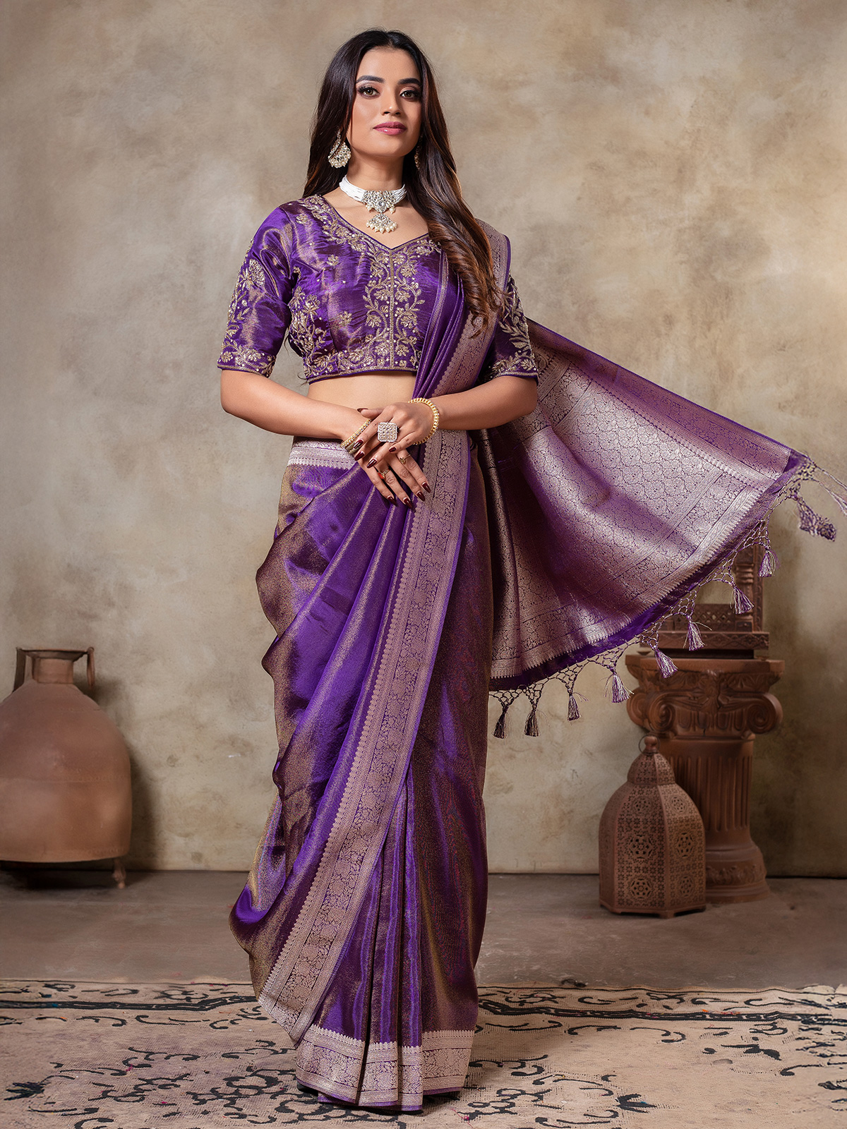 Effortlessly elegant, this dark purple tissue silk saree is ideal for any occasion. Enhanced with intricate zari weaving, it comes paired with a ready-made blouse featuring delicate handwork detailing.