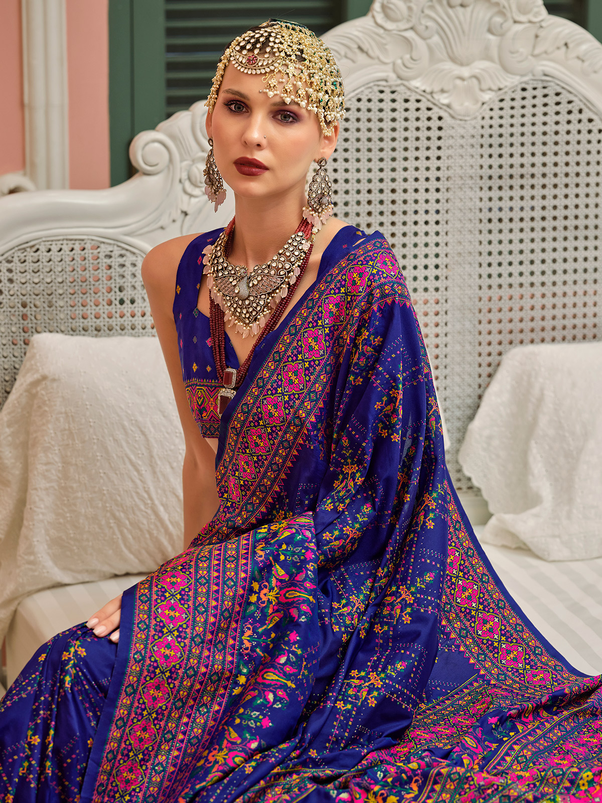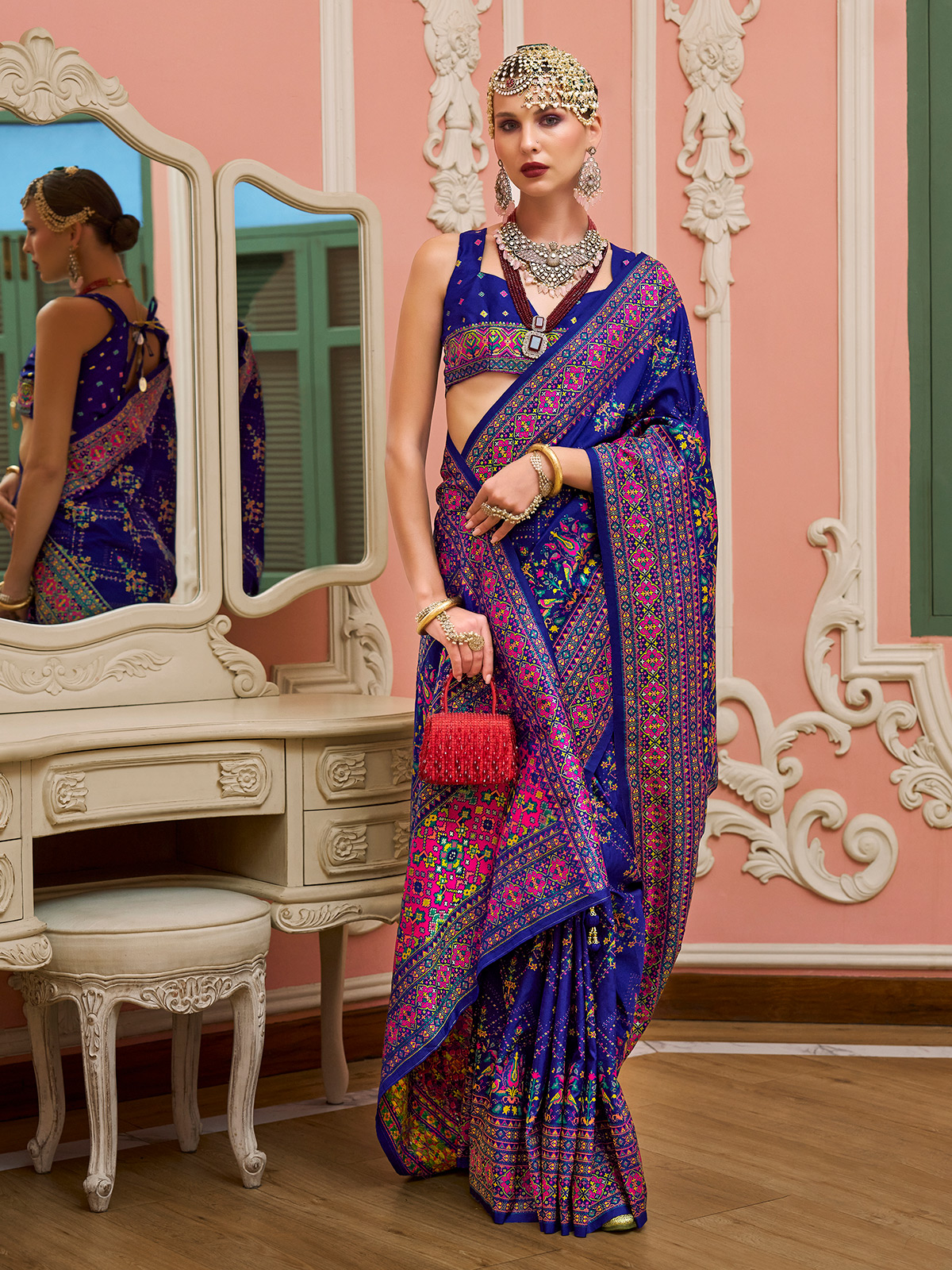Crafted for women who adore regal tones, this dark purple Banarasi silk saree carries a luxurious sheen and refined presence. The exquisite Meenakari print adds artistry inspired by traditional craftsmanship. Perfect for grand festival events, it comes along with an unstitched blouse.
