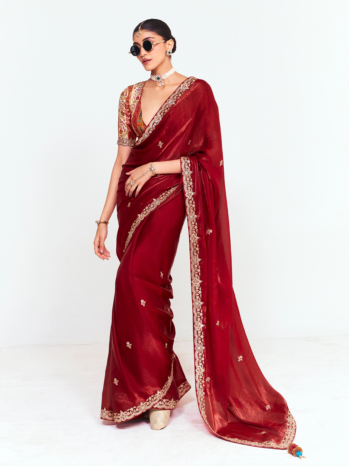 This graceful deep maroon tissue saree is designed to reflect sophisticated festive beauty. The saree features a meticulously embroidered scalloped border embellished with gold resham, sequins, and floral motifs, adding luxurious sparkle. Paired with an unstitched blouse decorated with multicolored threadwork and peacock-inspired patterns, it offers a striking and elegant festive look.