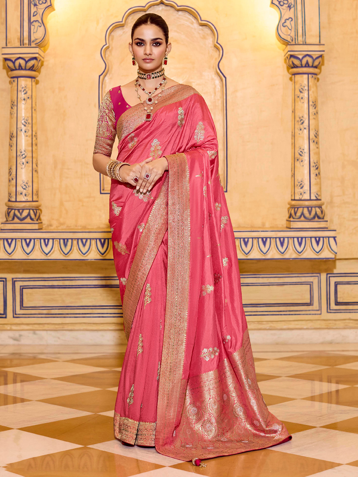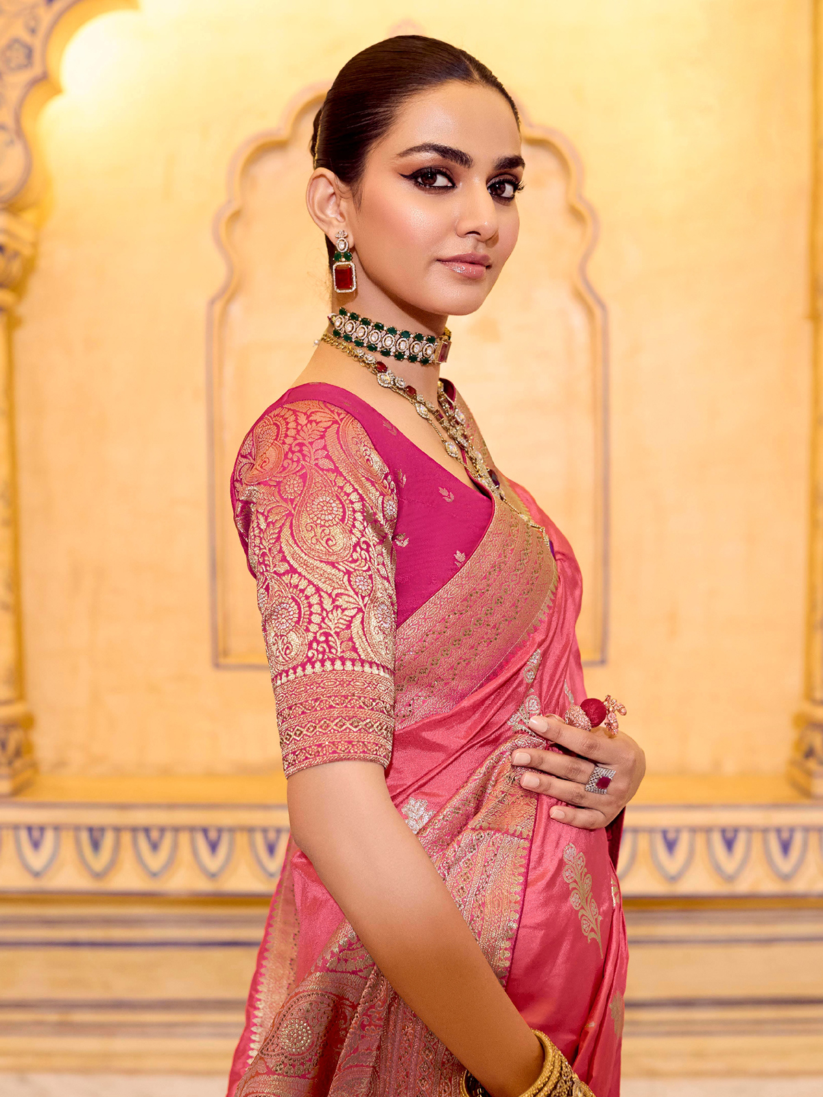 Soft peach tones combined with zari and stone work give this banarasi crepe silk saree a gentle and refined appeal. Suitable for weddings, festive occasions, and puja events, it flows beautifully with every step. The unstitched blouse adds versatility for personalized styling.