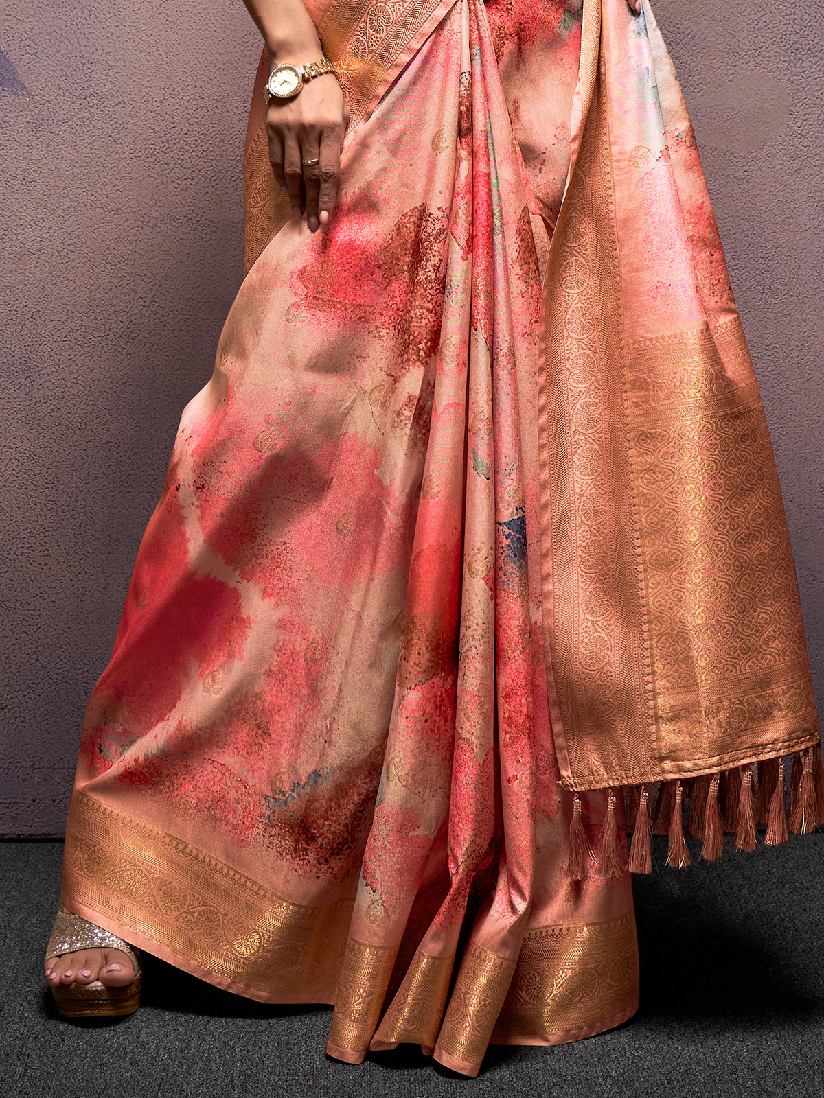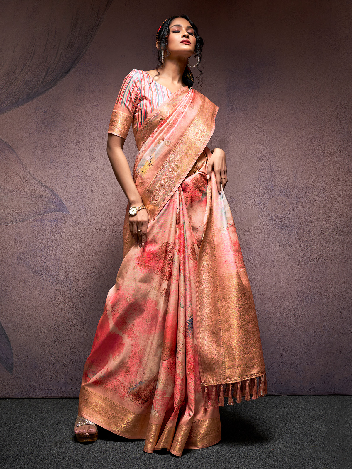 Delicate Peach Zari Painted Silk With Unstitched Blouse