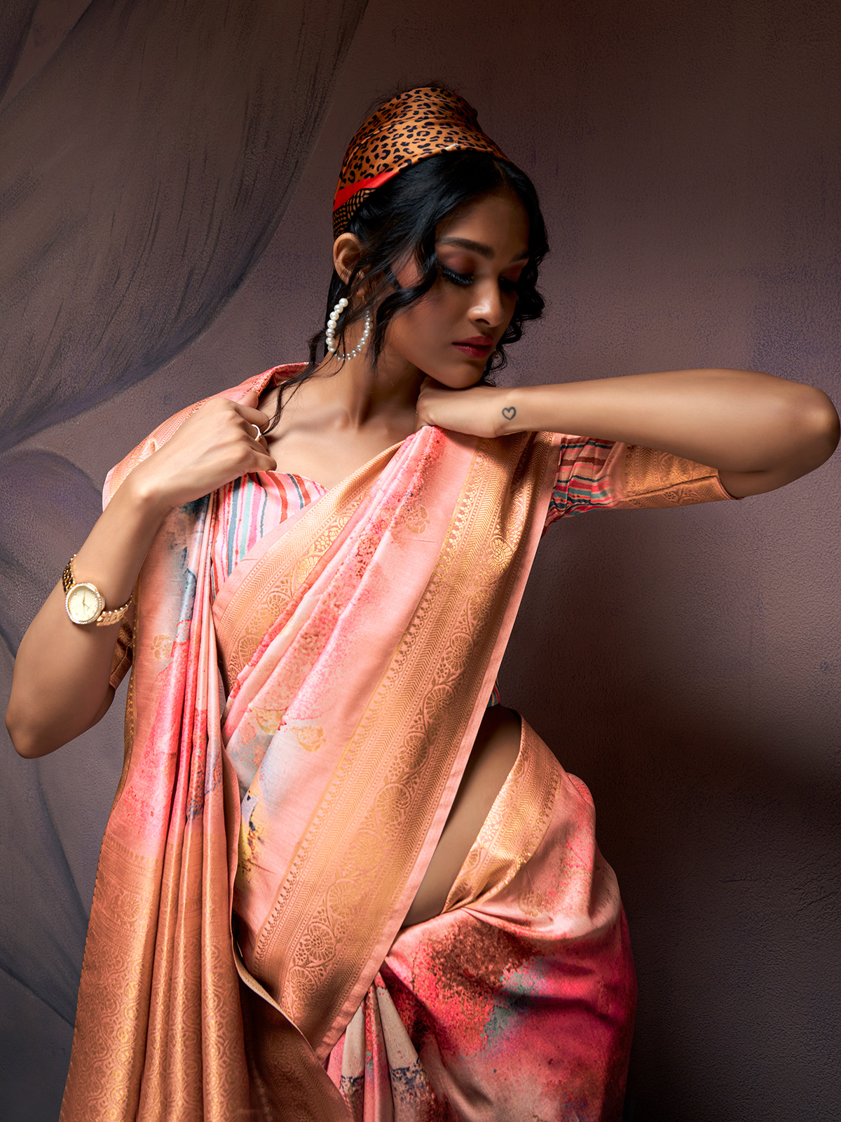 Crafted for elegance, this saree set features an unstitched blouse made of luxurious handloom silk. Gentle peach tones are adorned with refined painted artwork and shimmering zari accents. Perfect for weddings and festive celebrations, it creates a warm, graceful look with timeless traditional appeal.