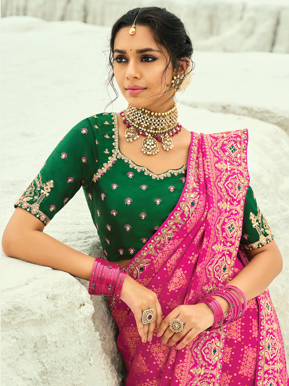 Embrace opulence with this rani bandhej georgette saree, shimmering with resham, sequins, cutdana, pearls, zari, thread, and zardosi. With its graceful drape and unstitched blouse piece, it’s a regal ensemble for wedding celebrations.