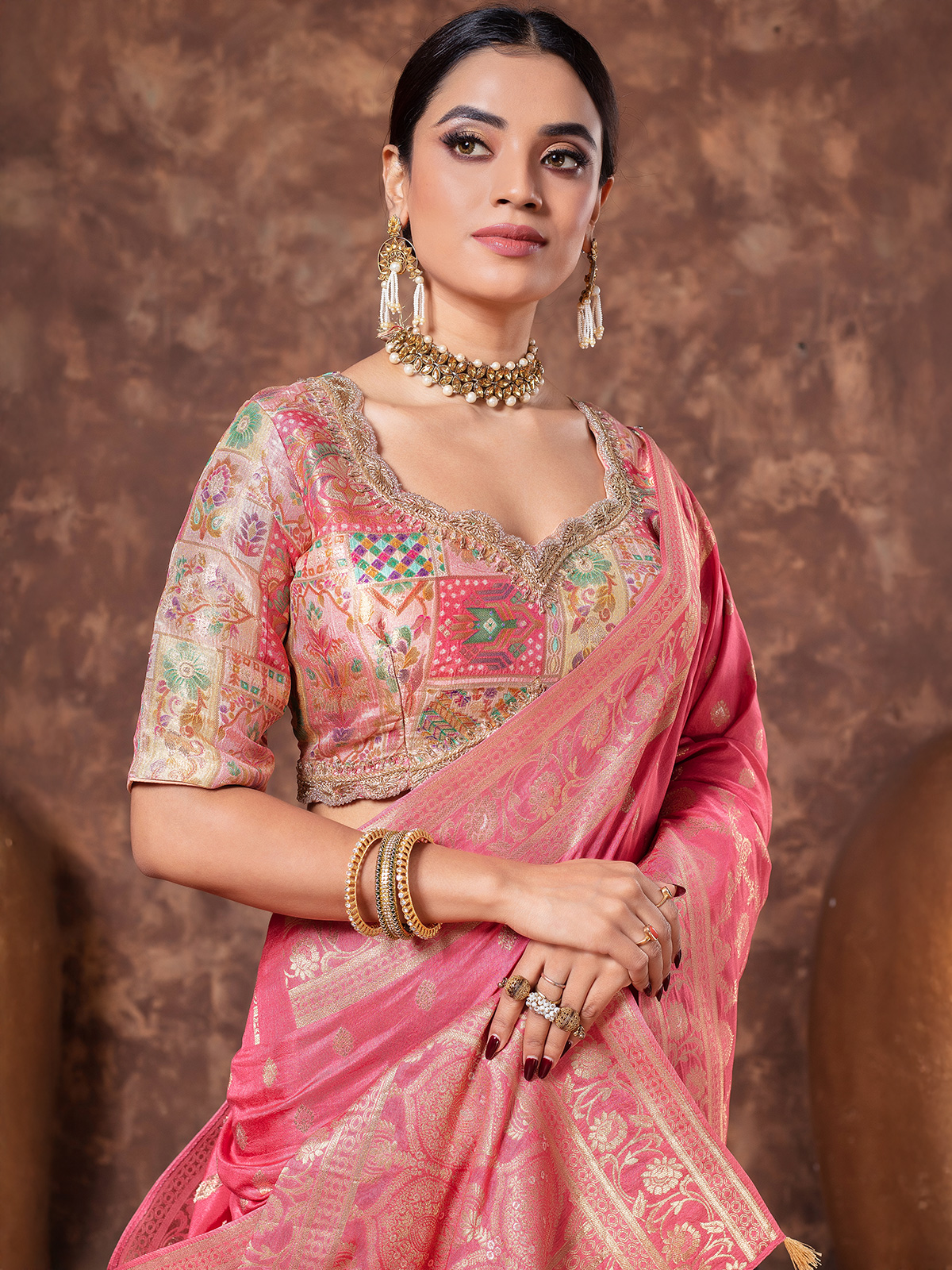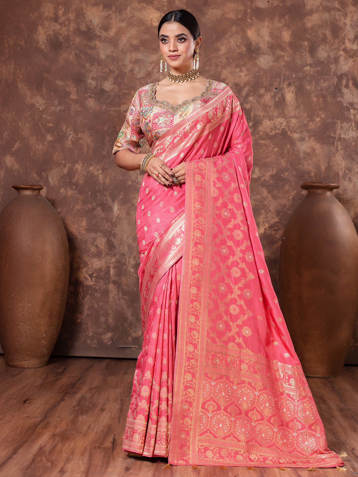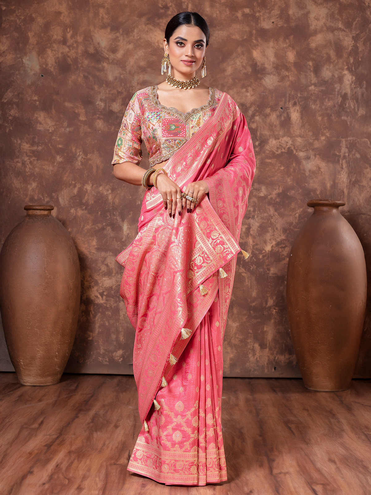 Step into sophistication with this graceful pastel pink dola silk saree, beautifully adorned with intricate zari weaving and a delicate tassel-accented pallu. Comes with a ready-made blouse for a seamless ensemble.