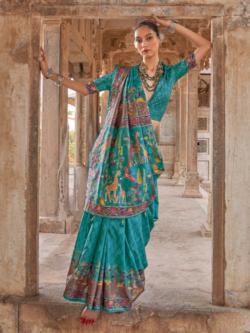 Dusty Aqua Silk Printed Saree For Women