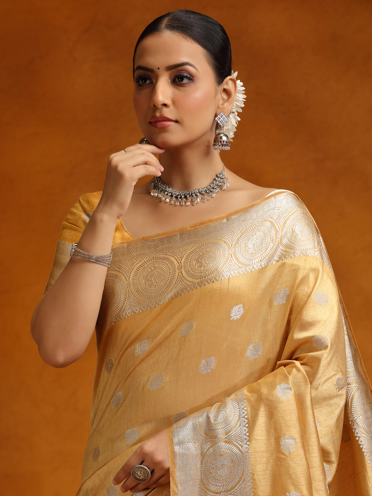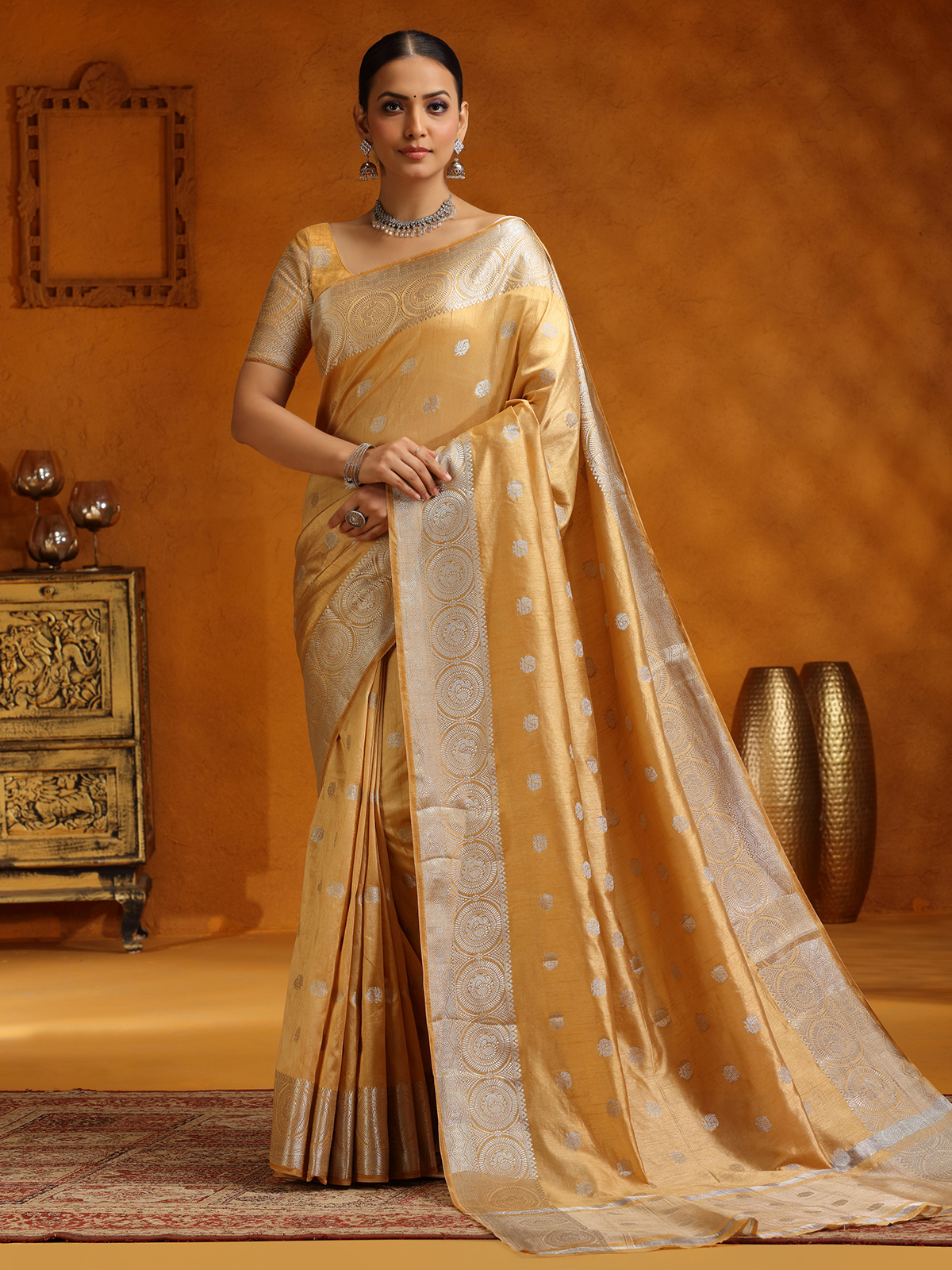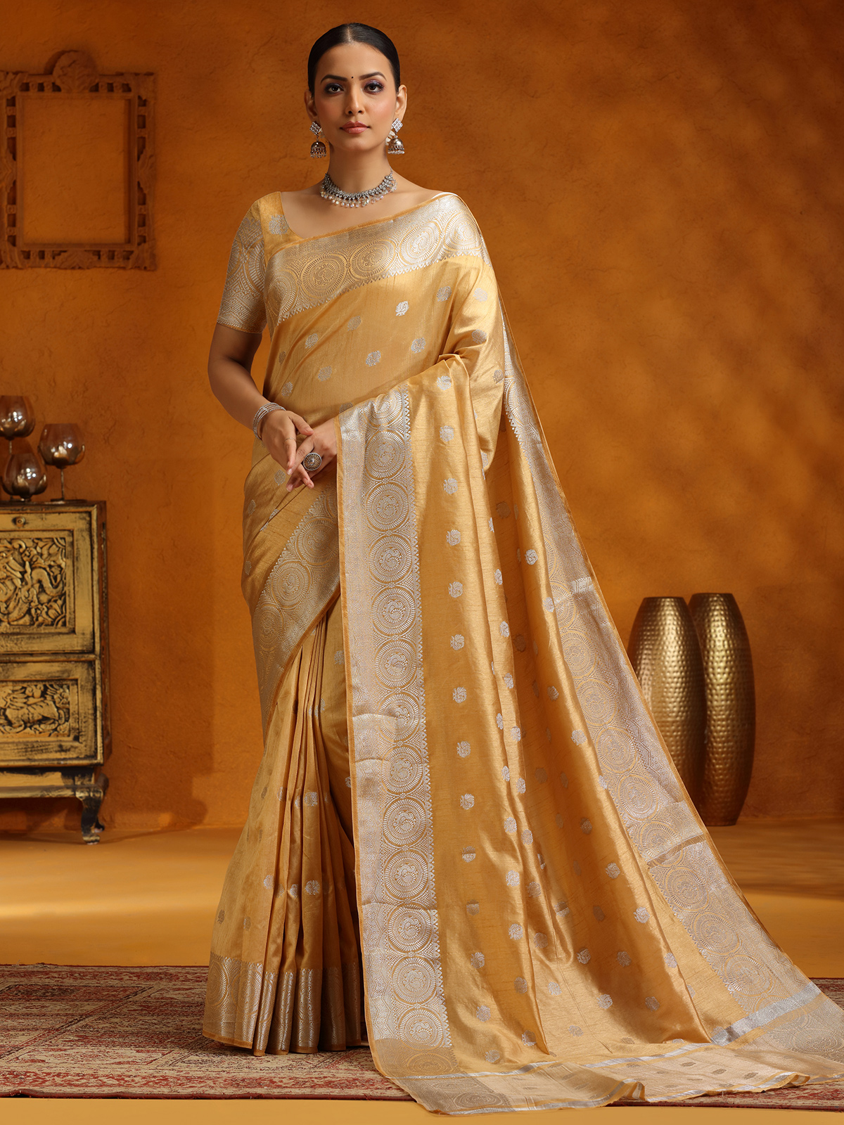 Traditional elegance is redefined in this mint green silk saree with zari weaving. Ideal for festive wear. Includes an unstitched blouse.