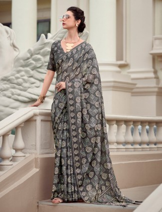 Experience timeless comfort in this elegant black saree, crafted from soft malmal silk. Showcasing an attractive all-over print, it seamlessly blends traditional charm with modern flair. Paired with an unstitched blouse piece for a custom fit.
