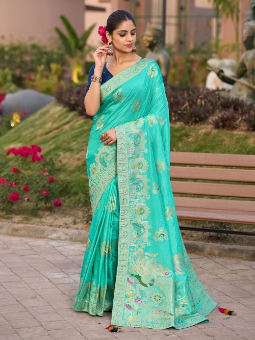Celebrate elegance in motion with this blue dola silk saree, intricately enhanced with stone and zari weaving. The graceful drape, lustrous finish, and ornate design make it a charming pick for weddings and special festivities. Includes an unstitched blouse for personalized tailoring.