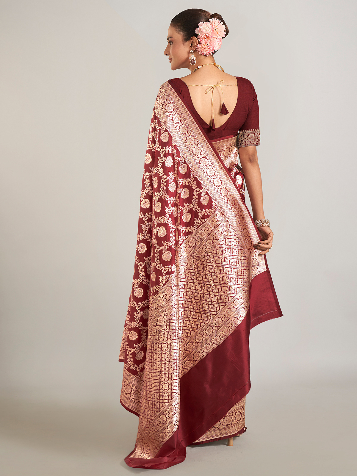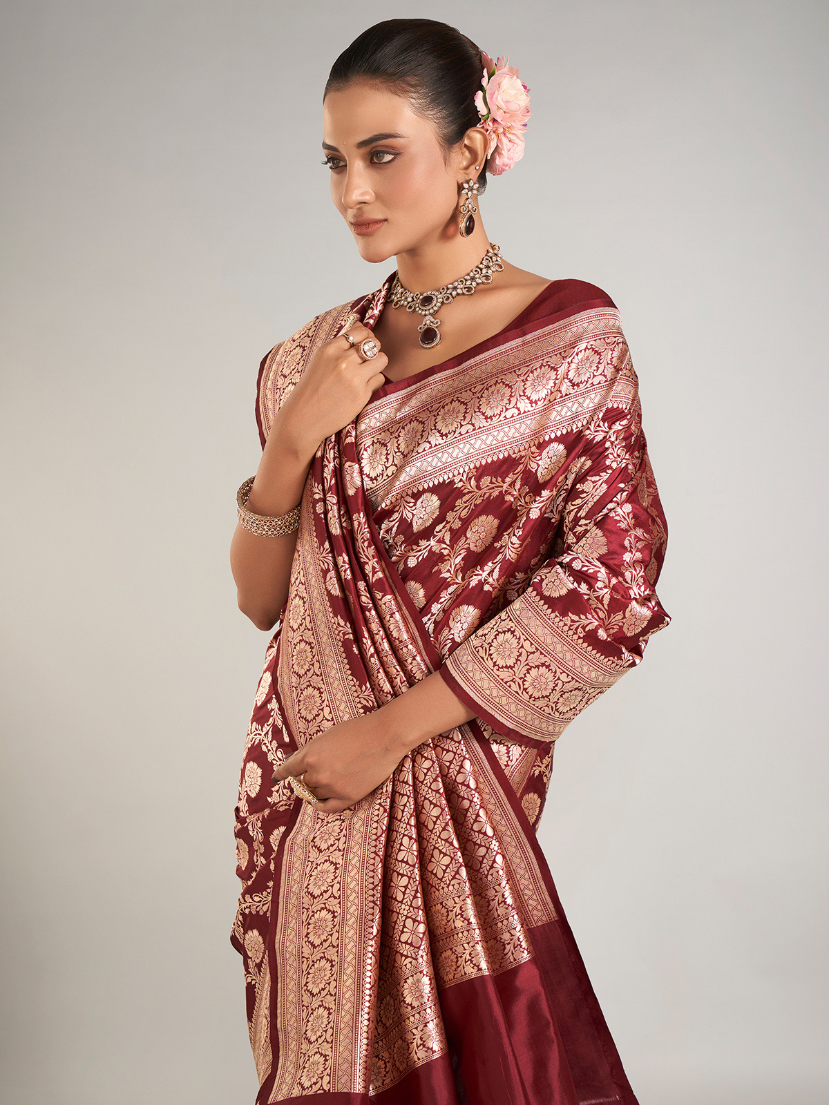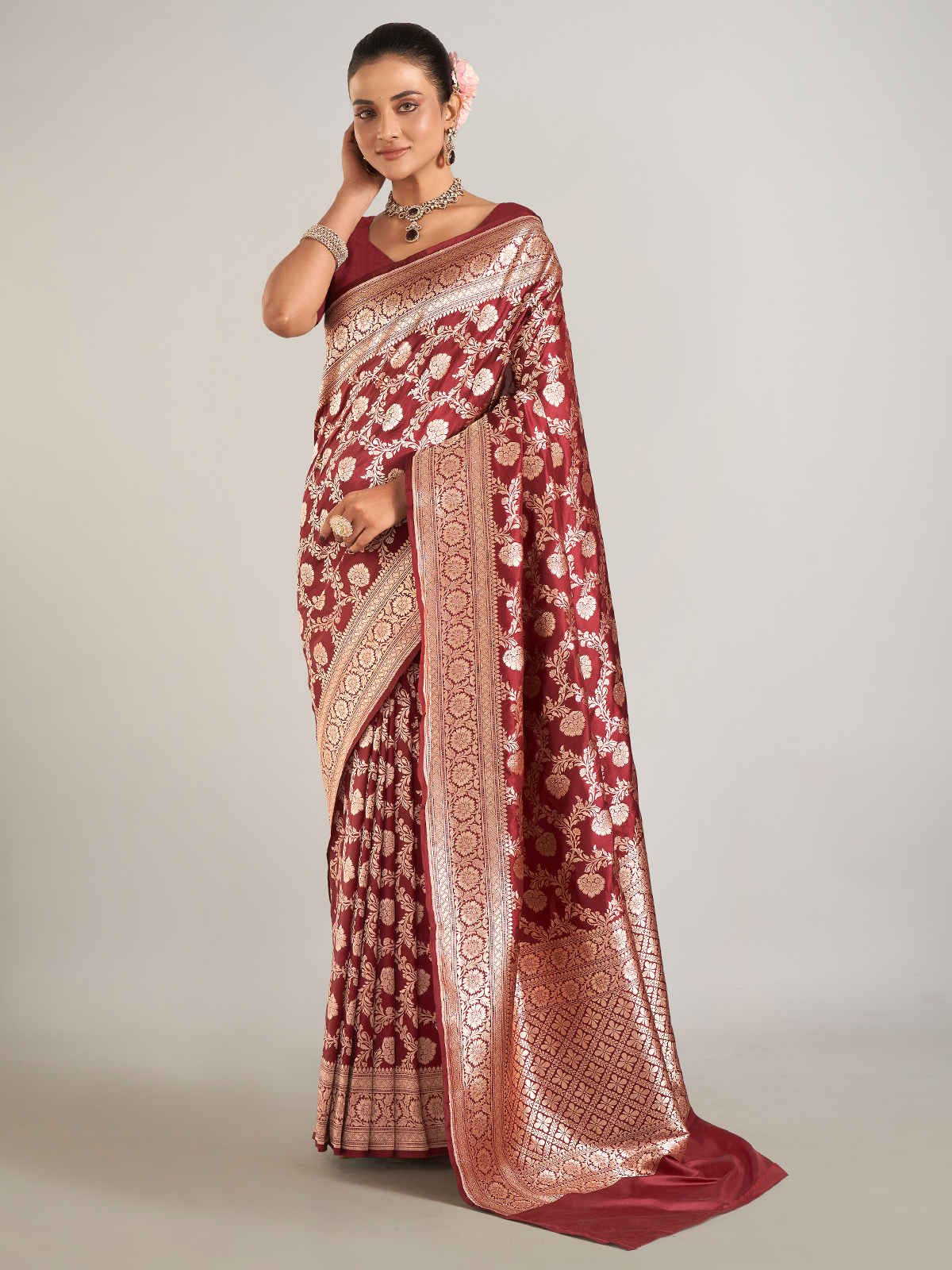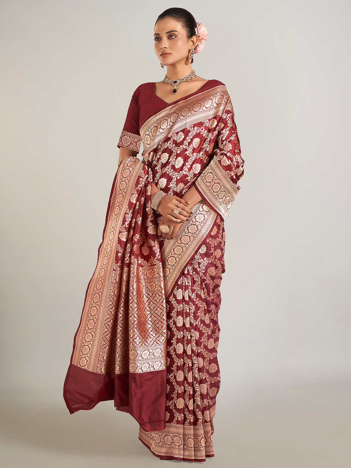 Exude elegance with this dark brown banarasi silk saree, perfect for any function. The stunning zari work enhances its beauty, and it comes with an unstitched blouse piece.