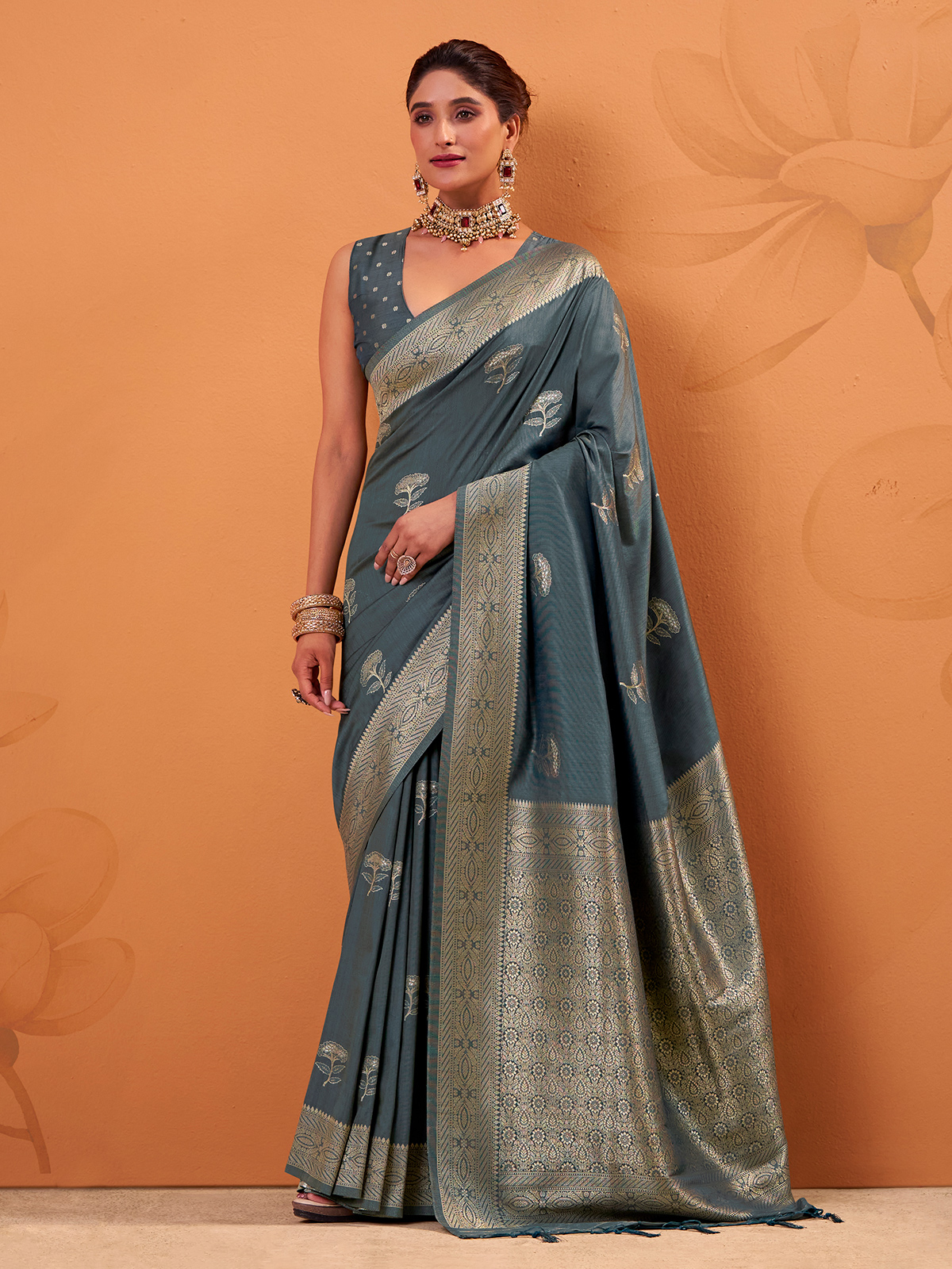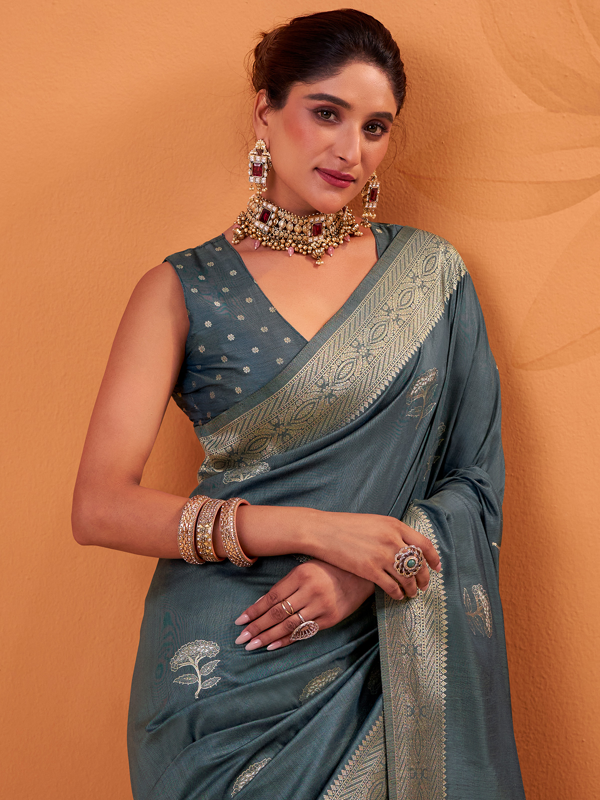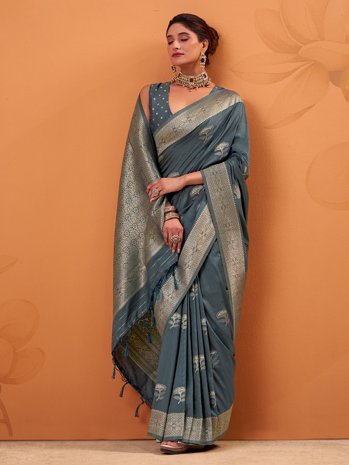 Drenched in a graceful grey tone, this Tusser silk saree gleams with intricate zari work that adds subtle sophistication. The rich texture and festive sheen enhance its refined appeal. Comes with an unstitched blouse piece for tailored styling.