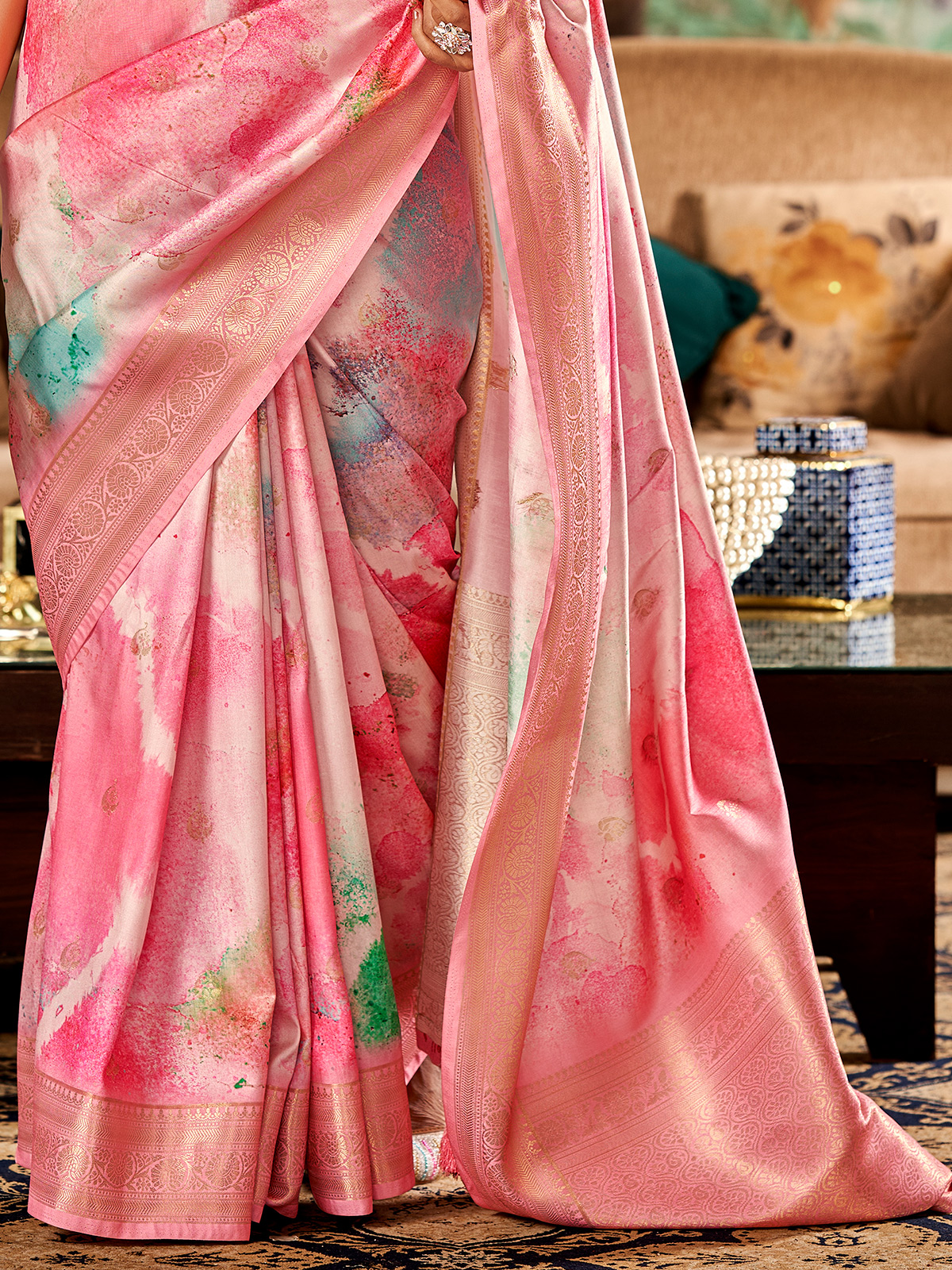 This women saree ensemble features a graceful unstitched blouse crafted from handloom silk. Artistic painted detailing blends beautifully with intricate zari accents, creating a refined festive appeal. Soft pastel tones enhance its charm, making it ideal for weddings, celebrations and traditional gatherings that demand understated sophistication.