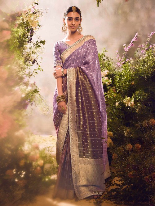 This pastel purple Banarasi tissue saree features luxurious zari, zardosi, sequin and stone embellishments that add a radiant touch. Perfect for weddings and festive occasions, it comes with an unstitched blouse piece for a customizable and graceful ethnic ensemble.