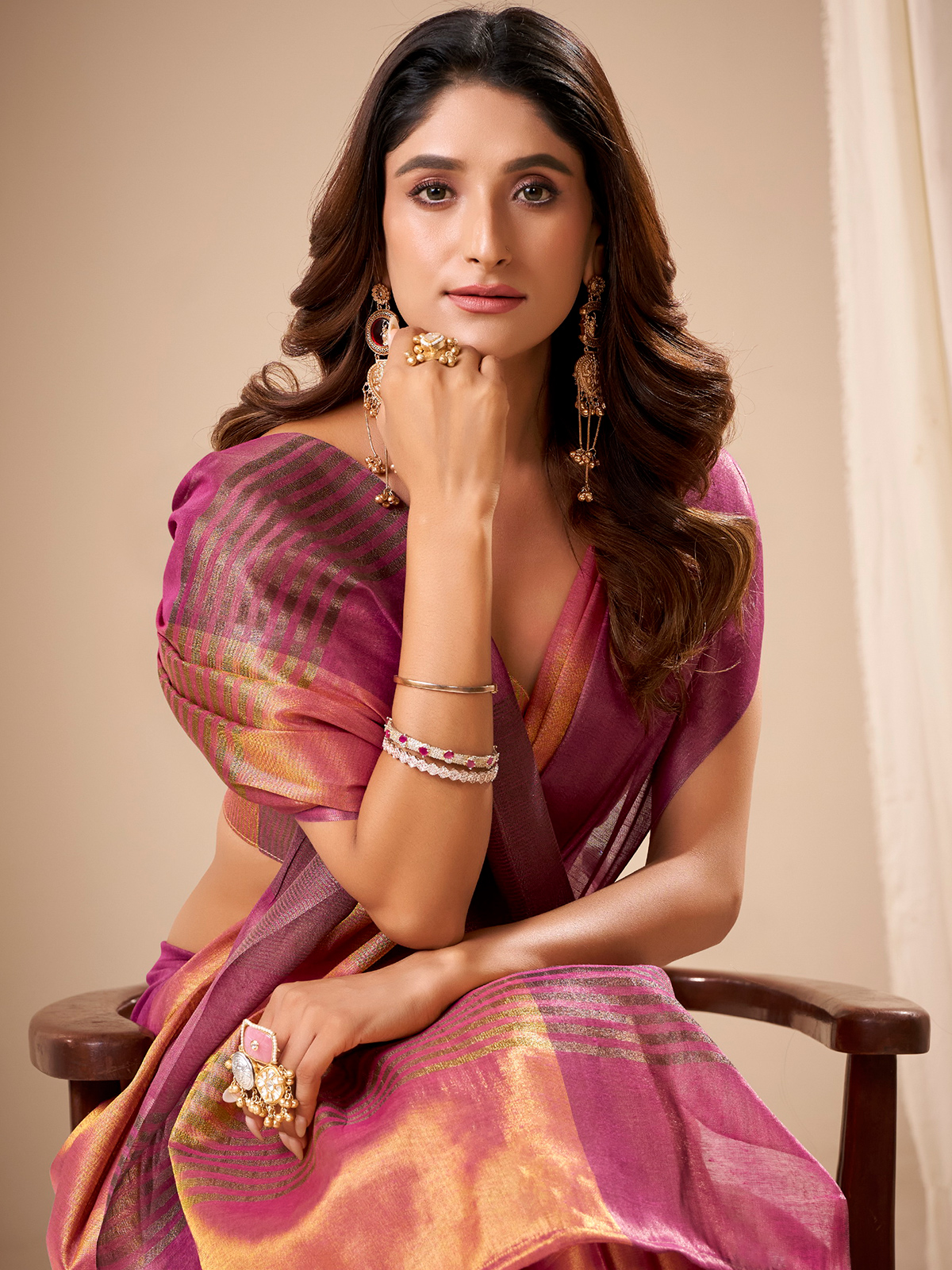 This elegant pastel purple tissue silk saree is adorned with graceful zari work that adds a soft festive glow. Paired with an unstitched blouse piece, it offers a smooth drape and refined appeal, making it ideal for weddings, sangeet functions and tasteful festive celebrations.