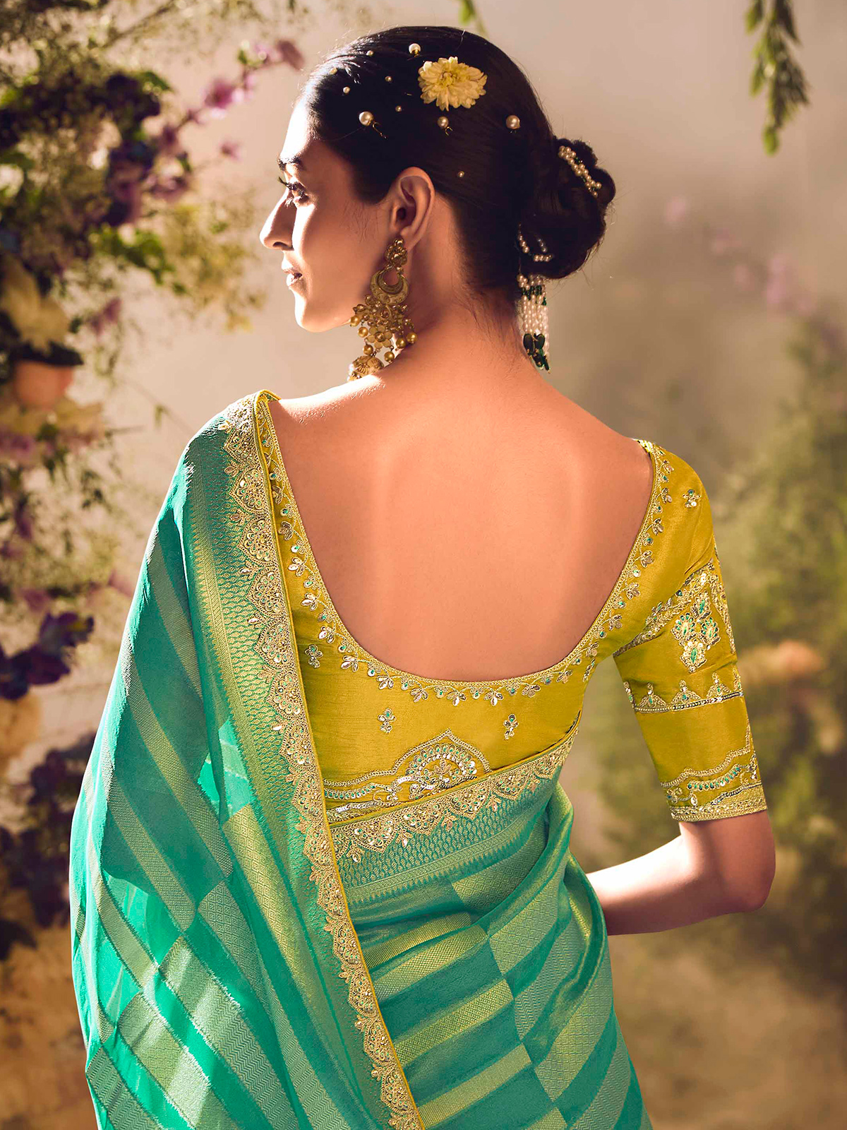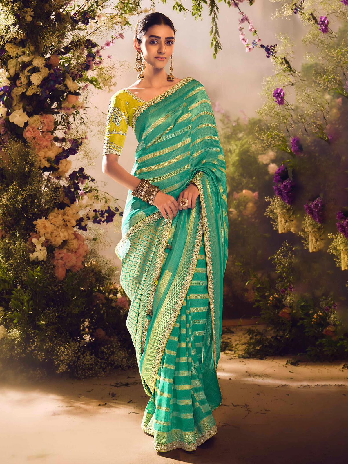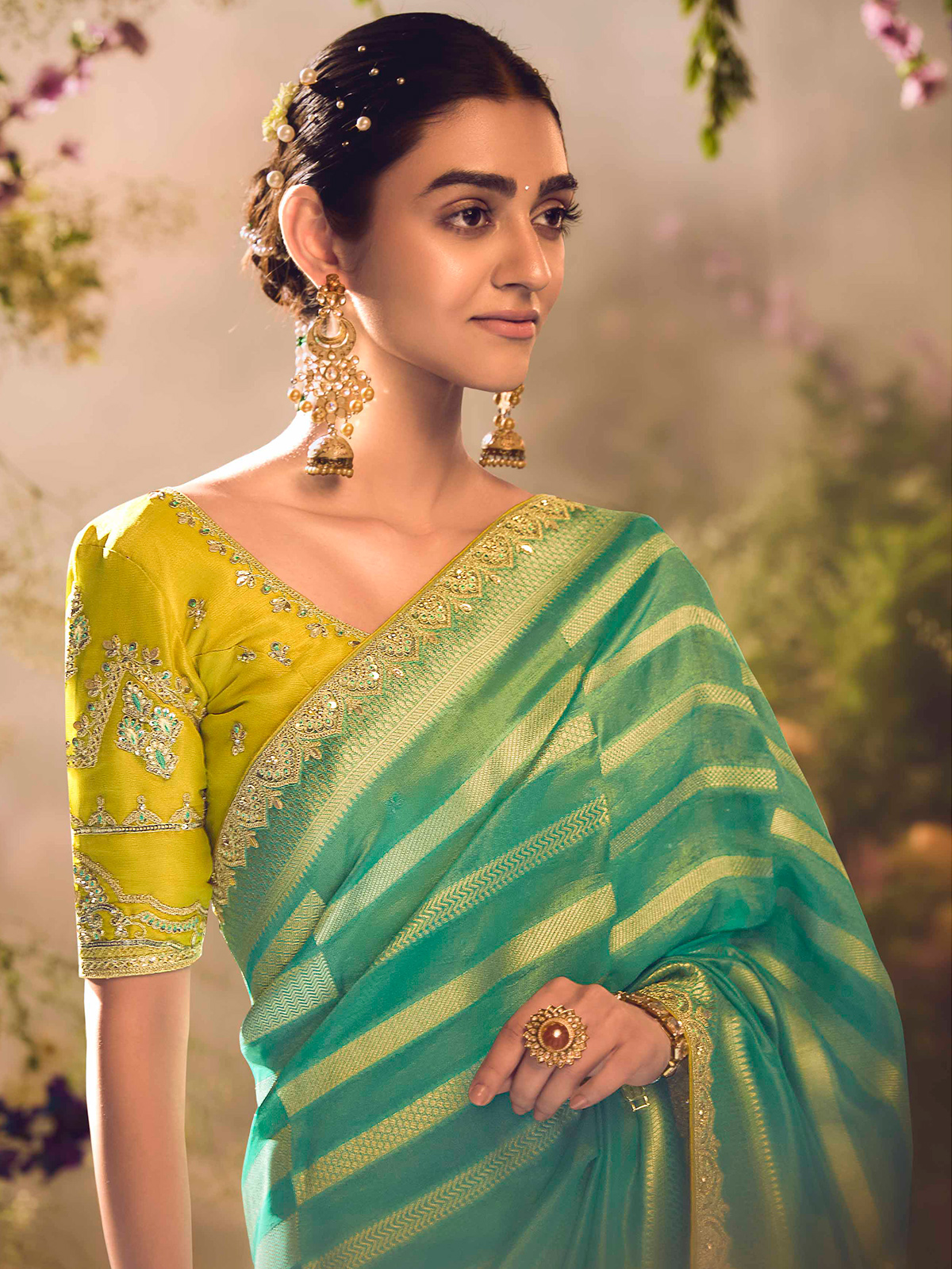 Delicately crafted in pista green Banarasi tissue, this saree features ornate work with sequins, zardosi, stones, zari and resham. A beautiful pick for weddings and festive gatherings, it comes with an unstitched blouse piece to style your own graceful ethnic look.